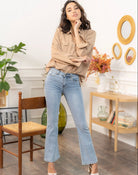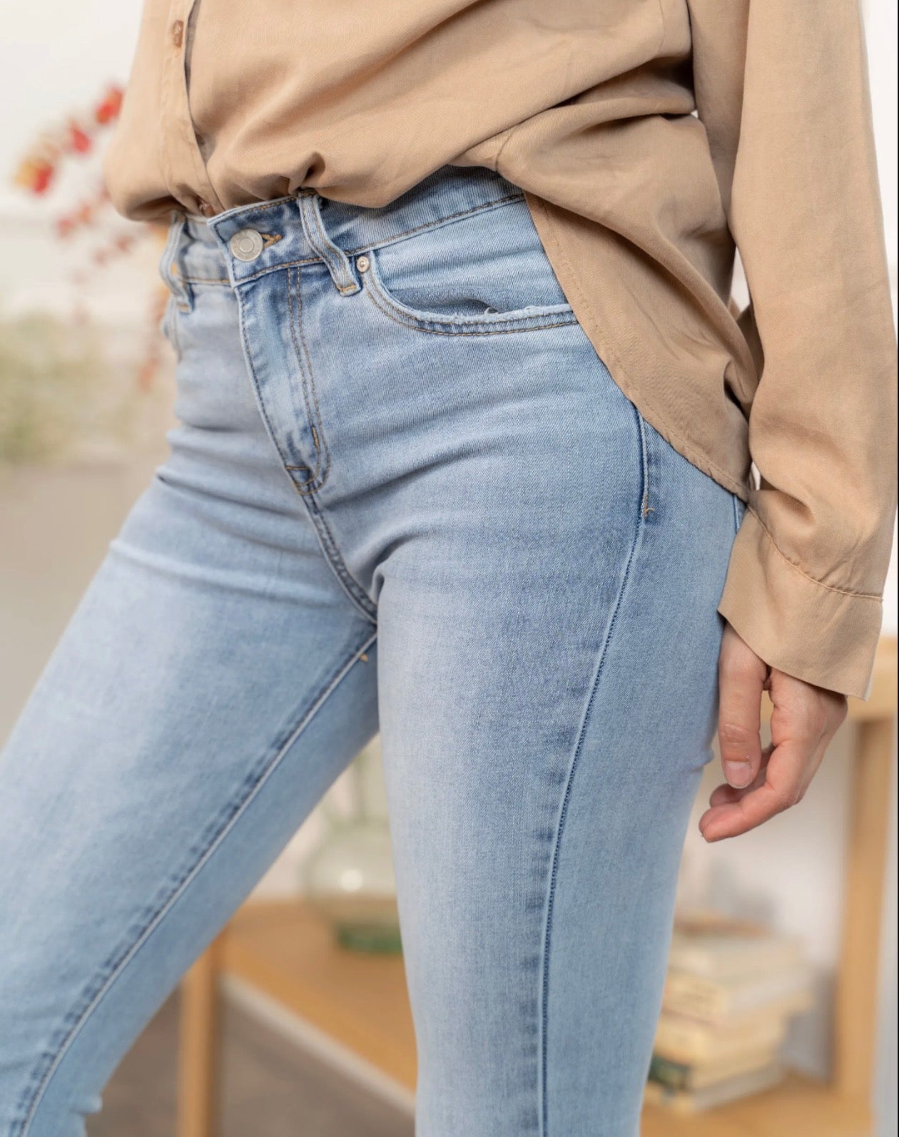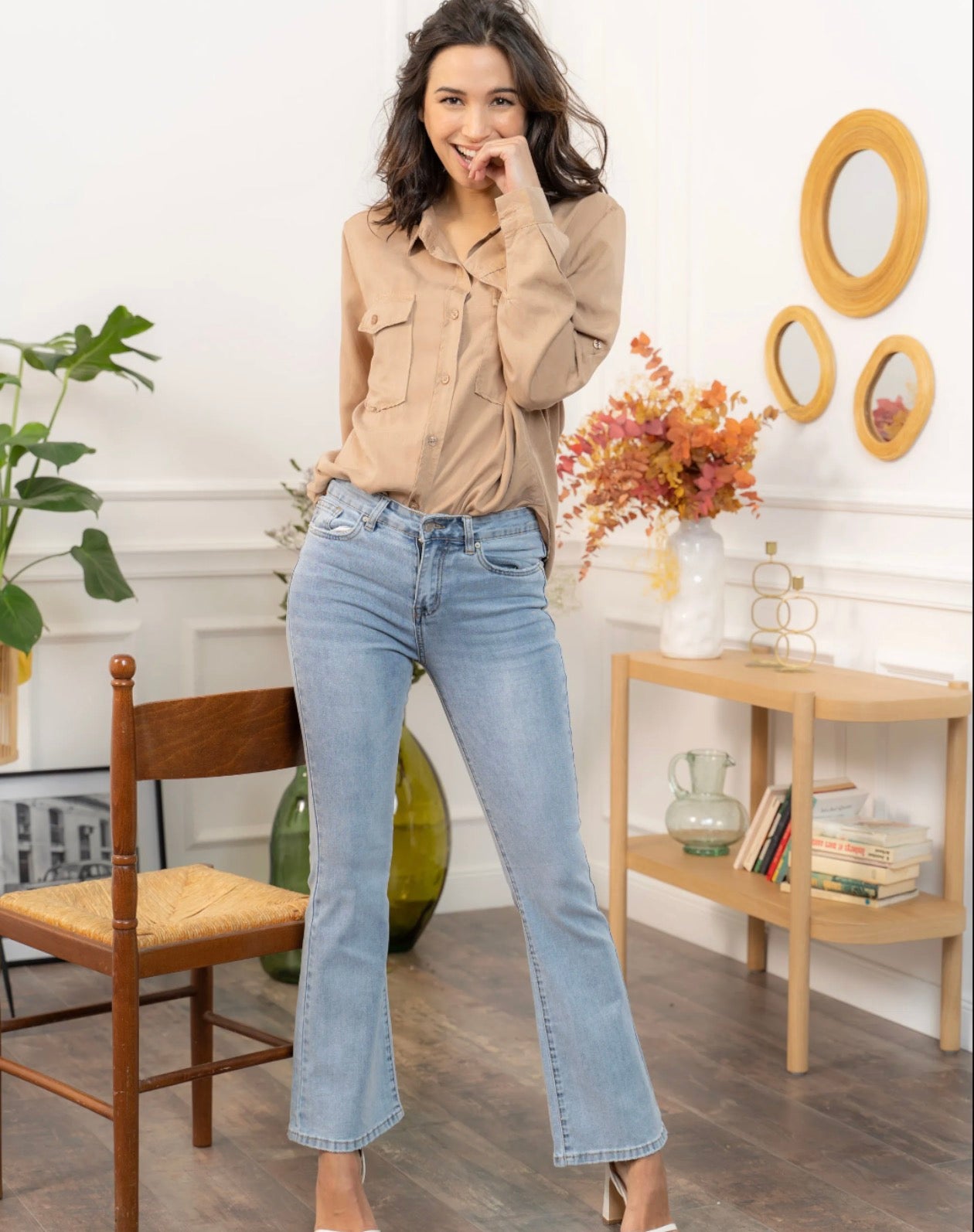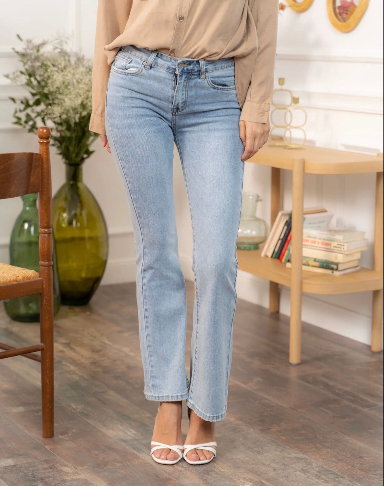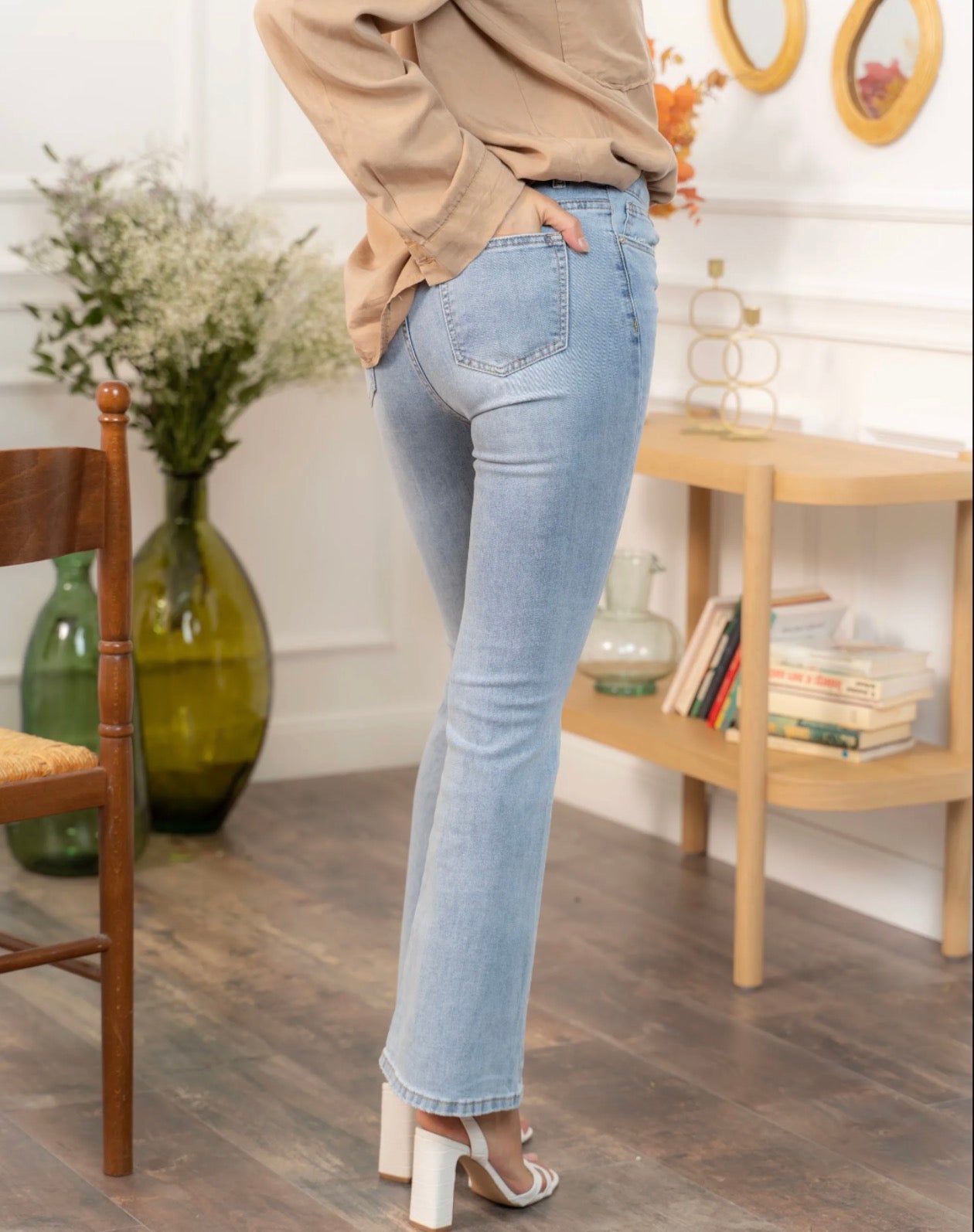 Un basique moderne et frais. Ce bootcut en denim clair allie simplicité et élégance. Idéal pour le quotidien avec une touche 70s. Sa coupe légèrement évasée équilibre la silhouette et sa teinte lumineuse apporte du pep’s à vos looks de saison.