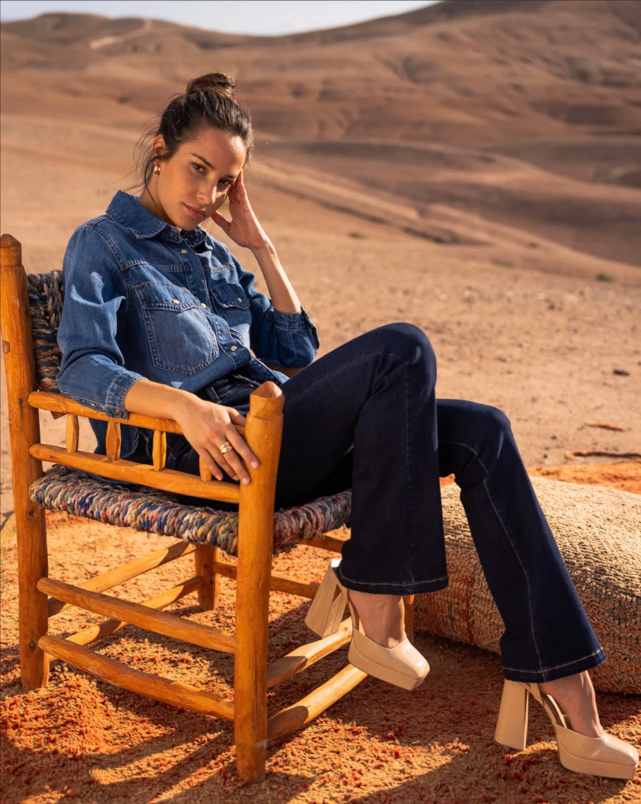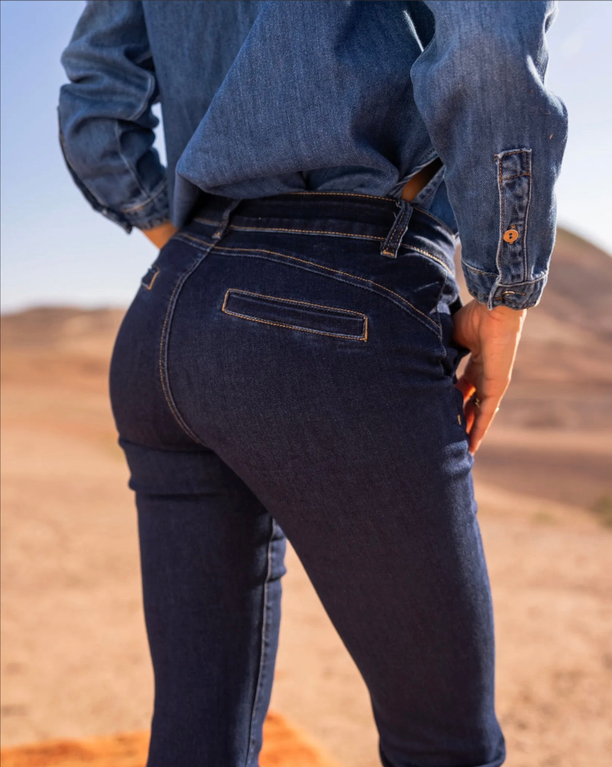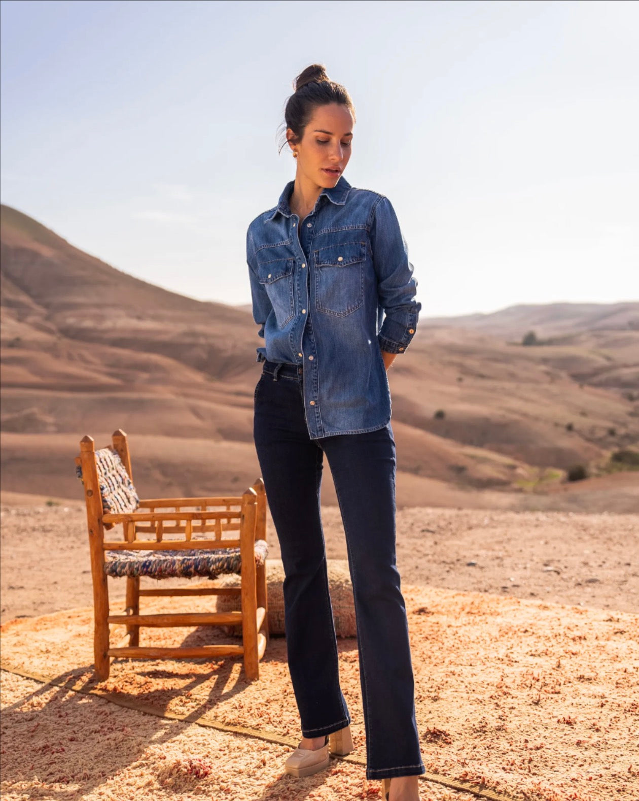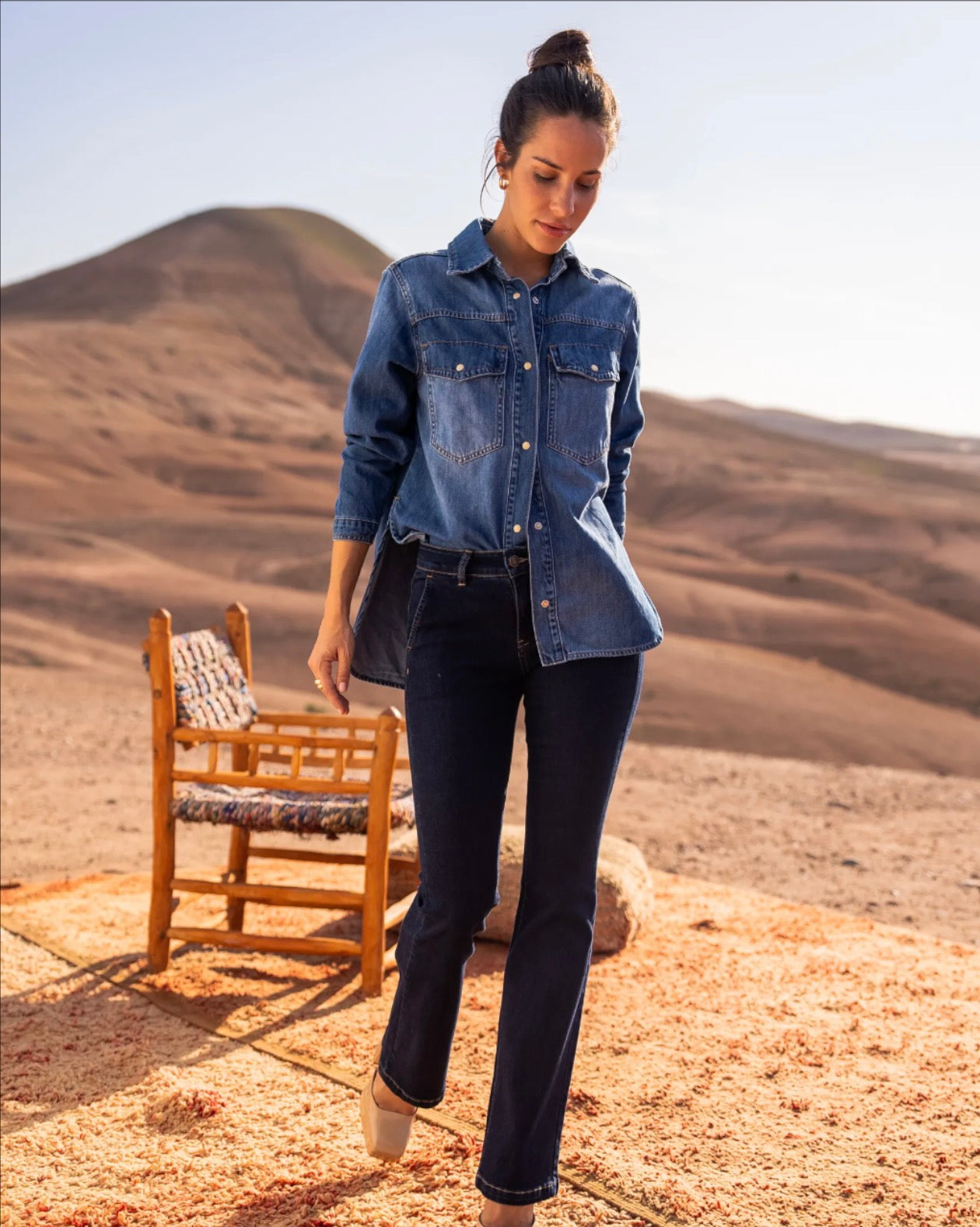 Jean bootcut flare en denim bleu moyen, pour un look décontracté et moderne. Sa coupe ajustée aux hanches et cuisses, puis évasée dès les genoux, crée une silhouette allongée et structurée, idéale au quotidien.