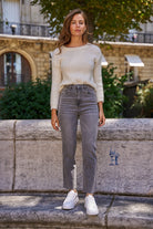 Jean droit à la coupe structurée et moderne, parfait pour une silhouette élancée. Sa teinte gris moyen légèrement délavée lui confère un style urbain et facile à associer. Une pièce essentielle du dressing quotidien, aussi bien casual que chic.