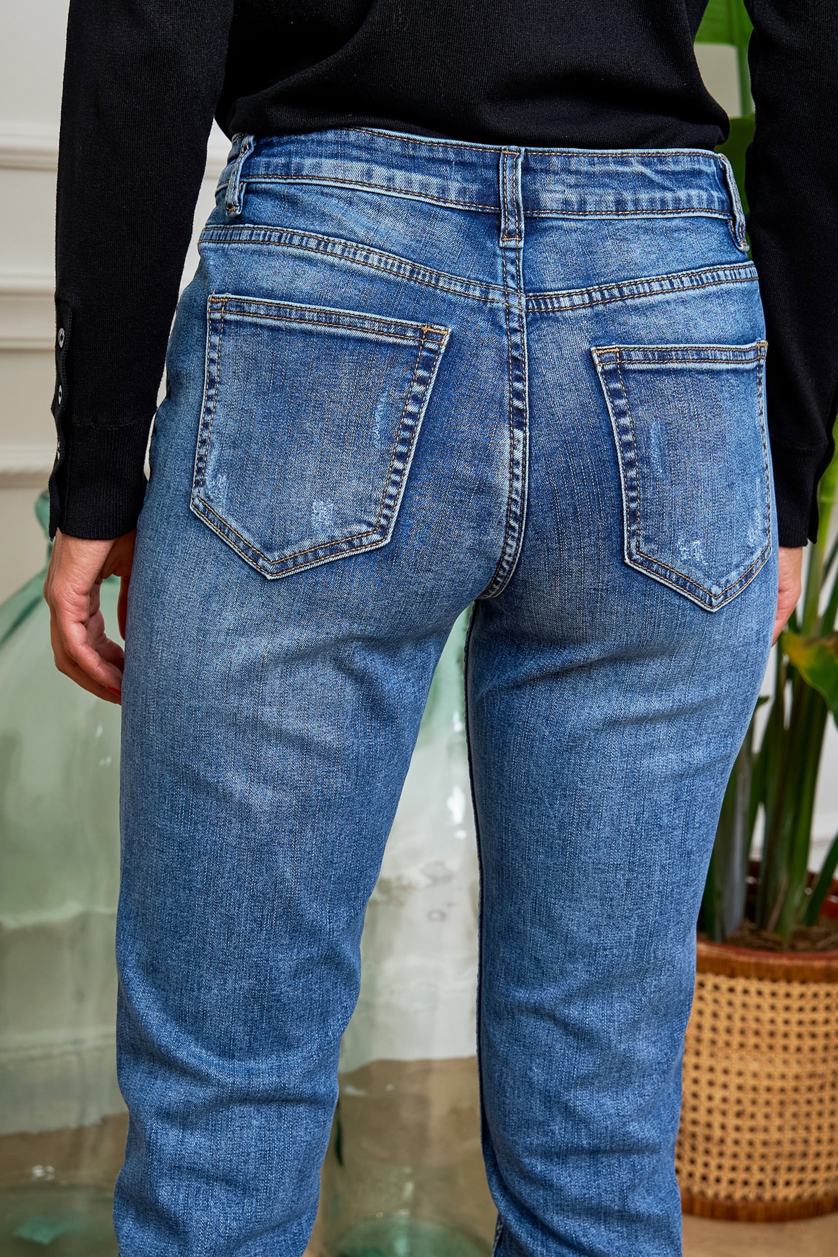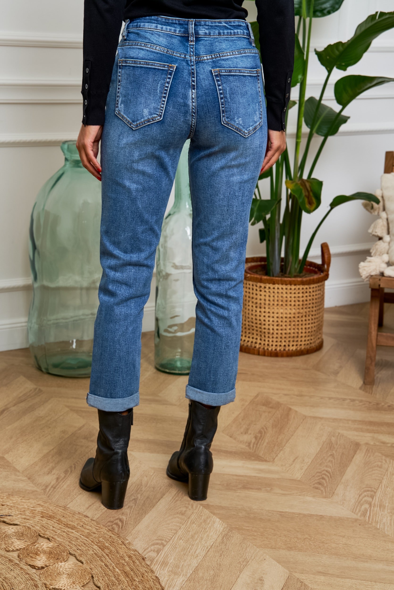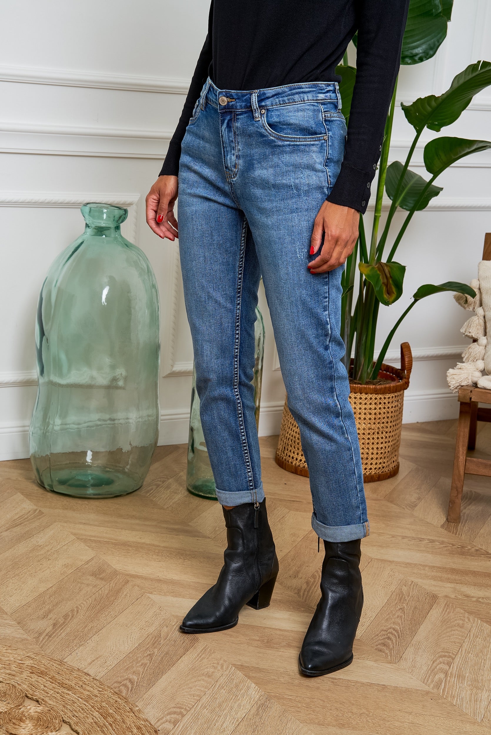 Jean à la coupe Relax, légèrement fuselée et reversée à la cheville, conçu pour offrir une silhouette décontractée et actuelle. Sa teinte bleu moyen avec un léger effet délavé apporte un look casual et facile à assortir. Il est doté d’une taille haute qui flatte la silhouette et assure un maintien optimal. Ce modèle présente cinq poches classiques et une fermeture par bouton et zip. Confortable grâce à sa matière douce et légèrement extensible, il est idéal au quotidien pour un style à la fois tendance et décontracté. À porter avec des bottines, des baskets ou même des sandales en été.