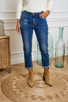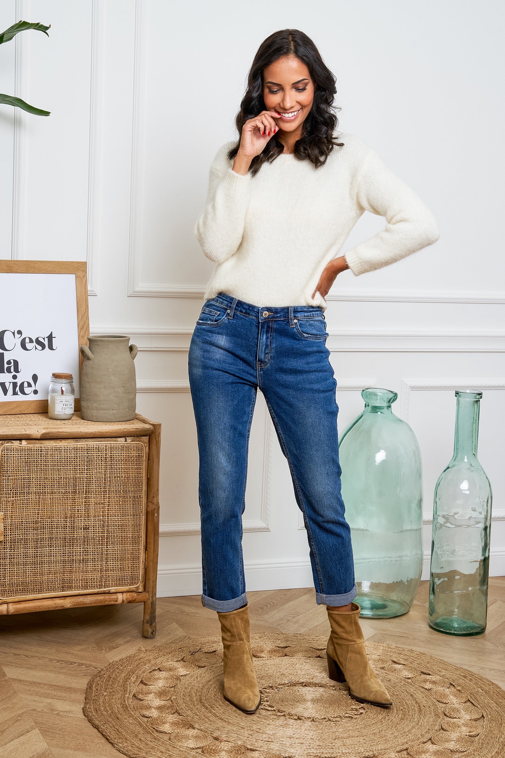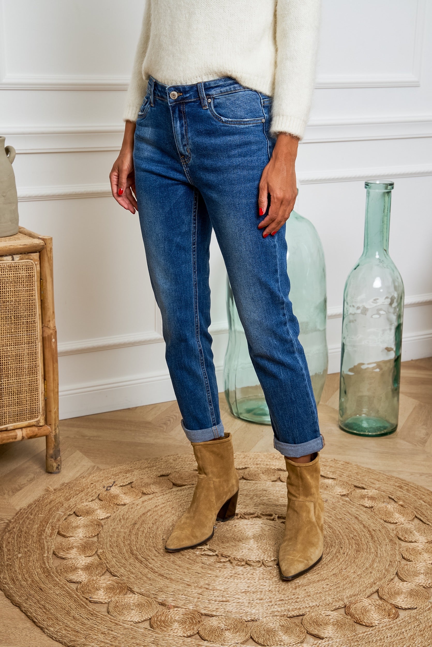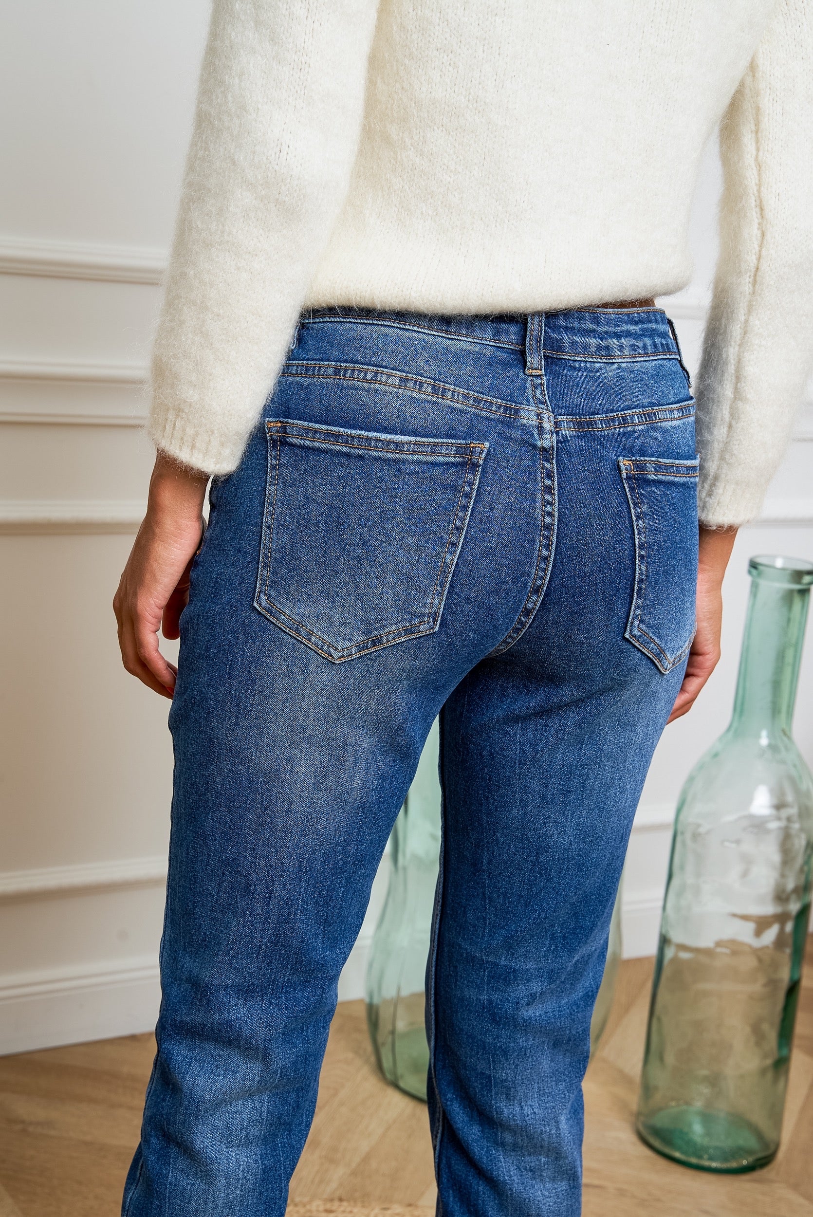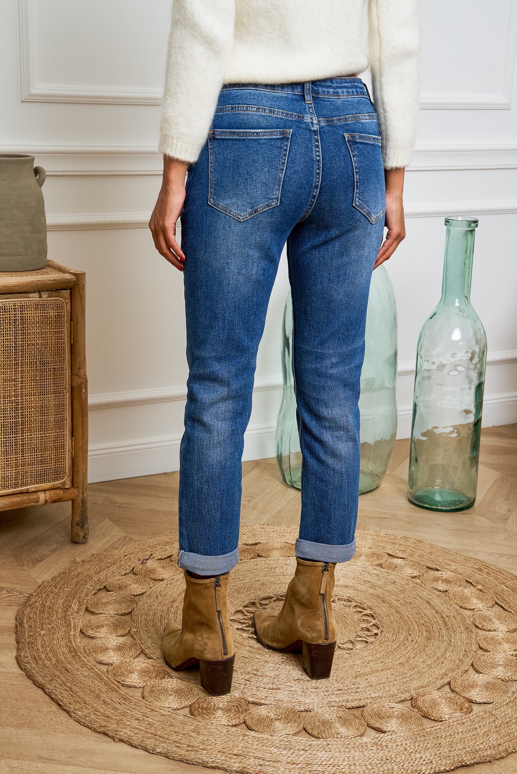 Sa coupe droite légèrement ajustée, associée à un revers apparent, donne une allure moderne et naturelle. Le denim bleu intense légèrement délavé apporte du relief tout en restant facile à assortir.