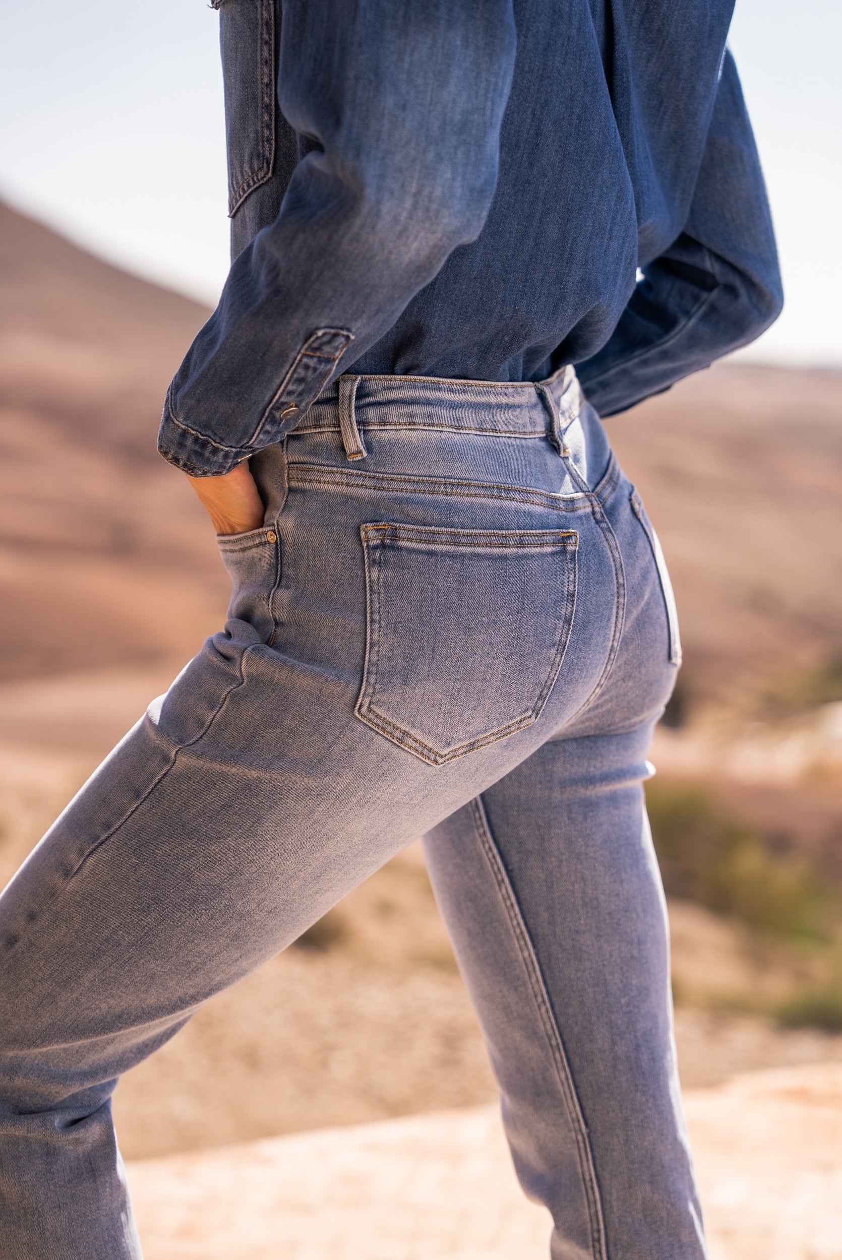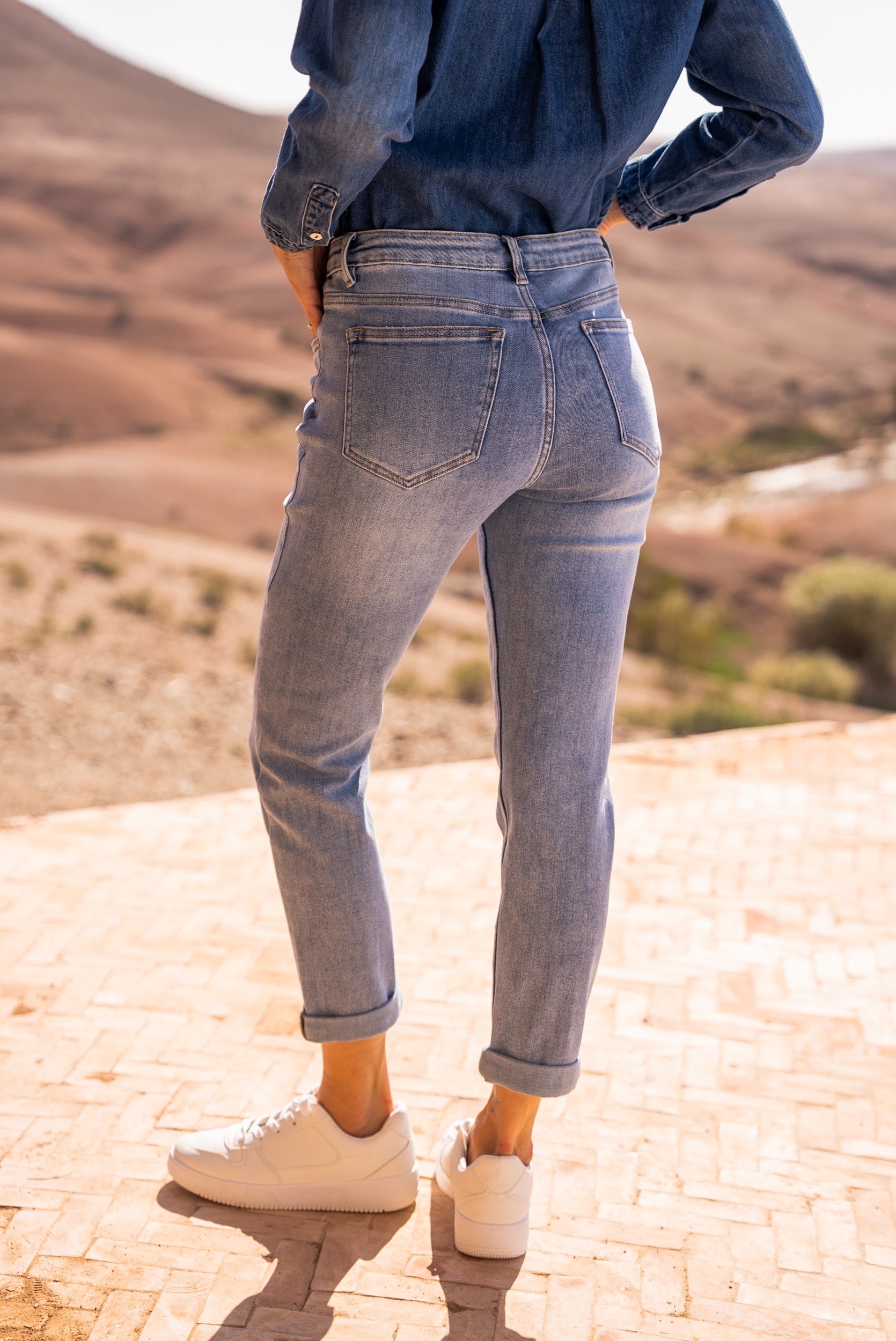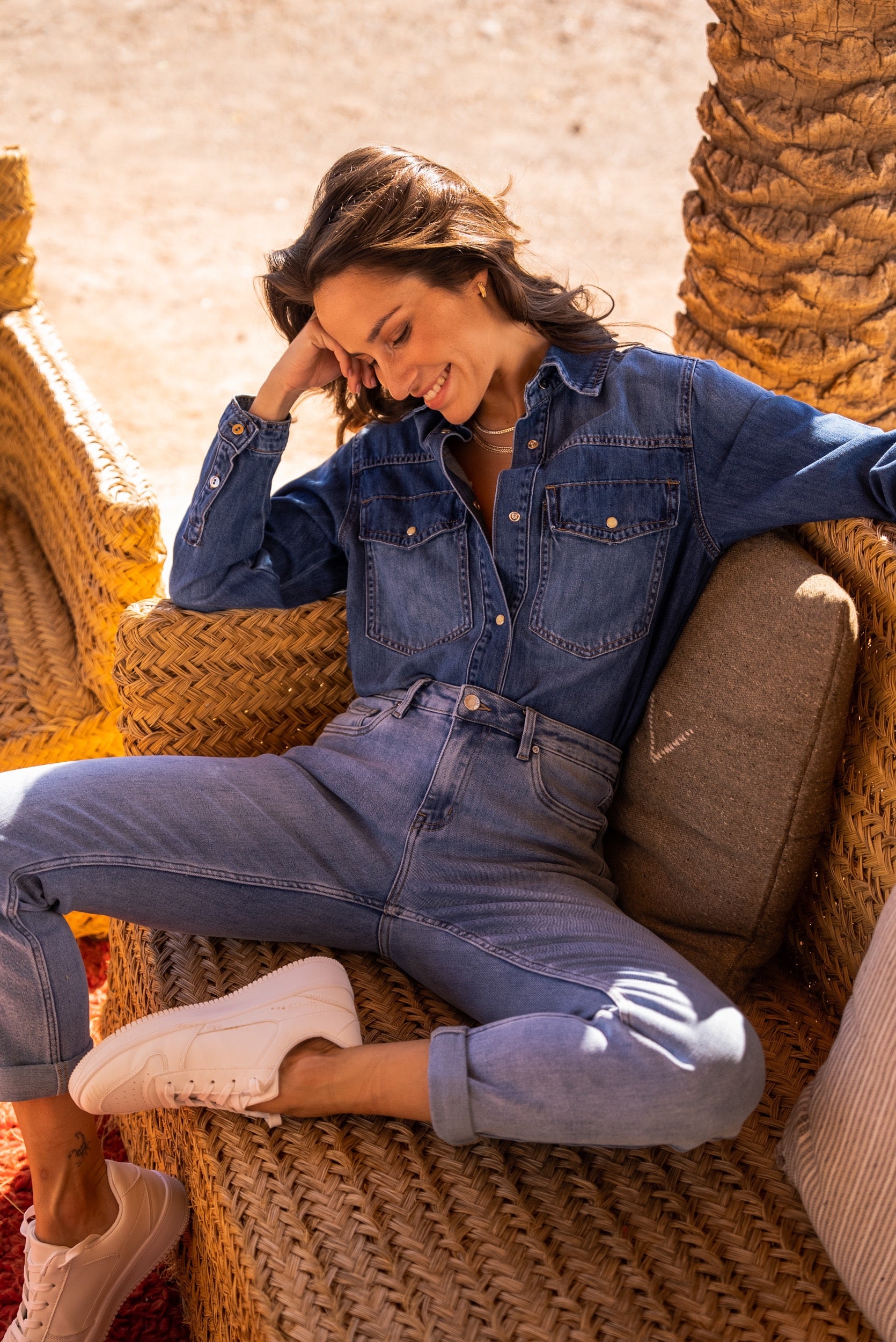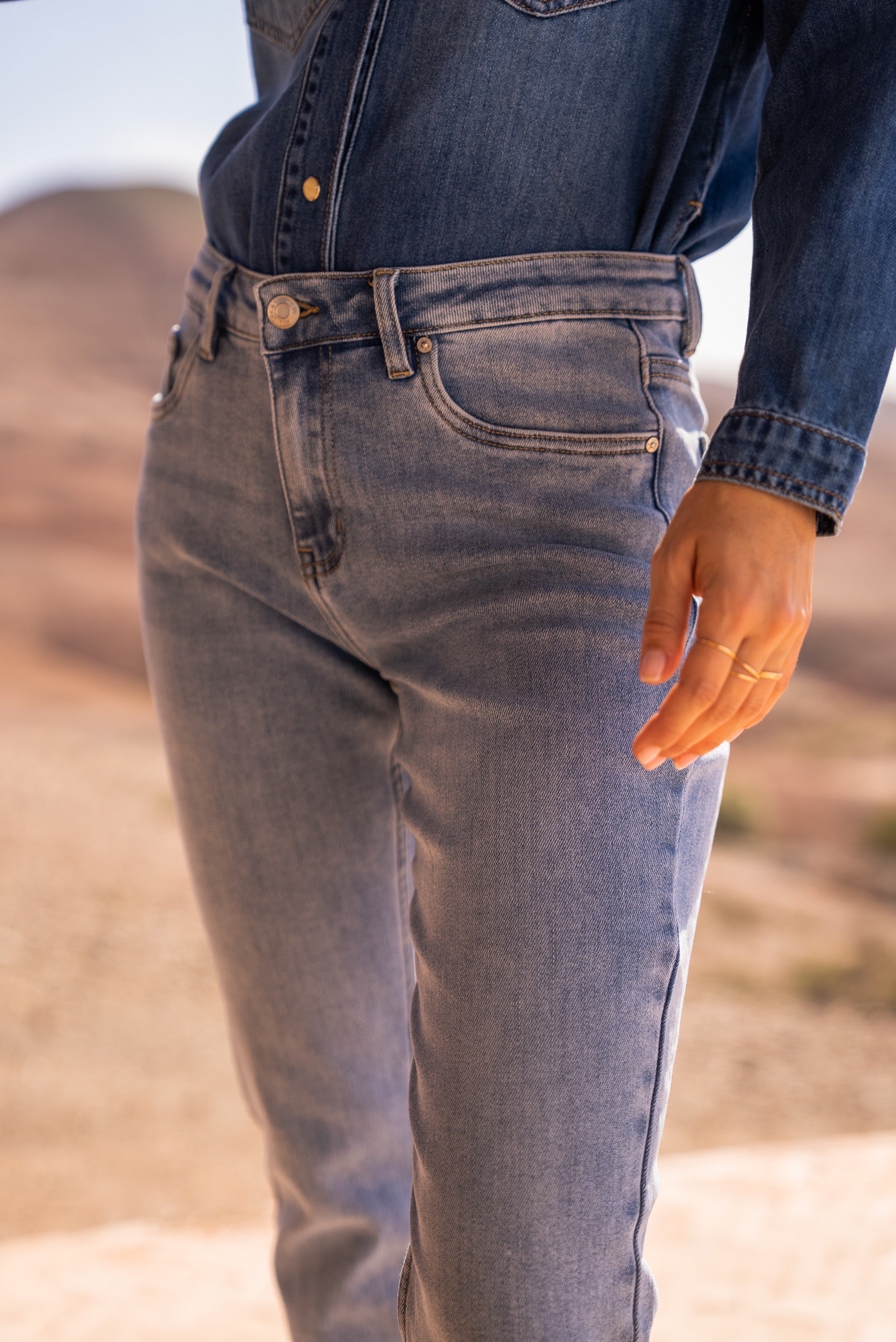 Un jean relax à la coupe droite et fluide, parfait pour un look casual au quotidien. Son délavage clair lui apporte une touche vintage douce et lumineuse, idéale pour les beaux jours.