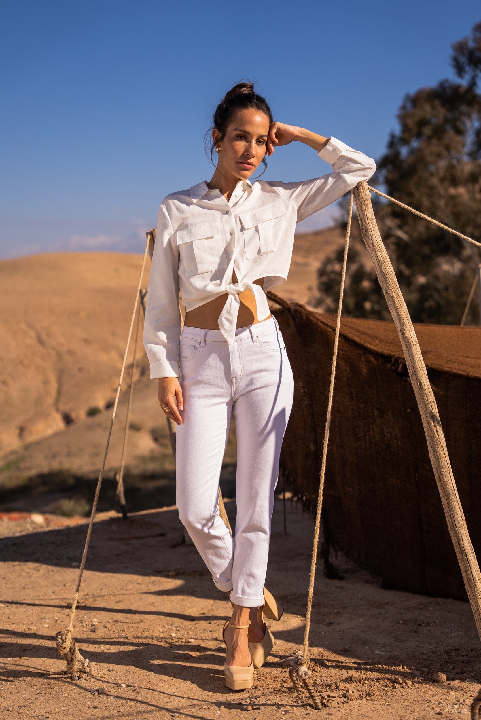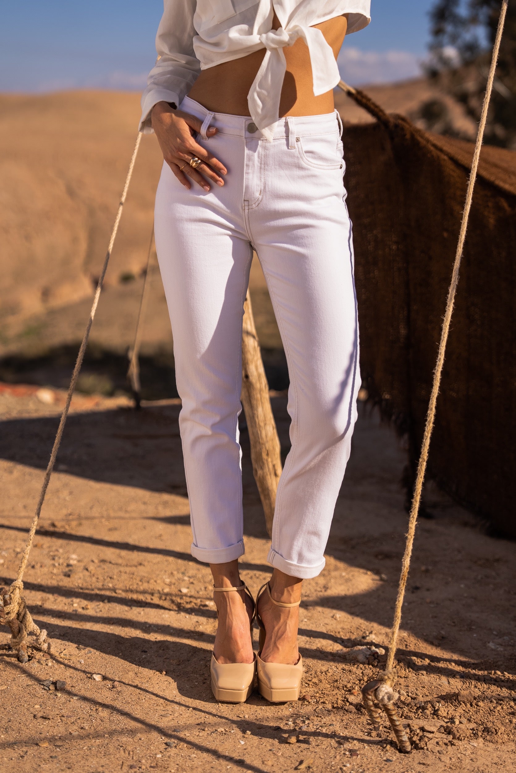 Un jean à la coupe droite et décontractée, dans une teinte blanche lumineuse idéale pour les beaux jours. Son style épuré et sa coupe confortable en font un indispensable du vestiaire estival, facile à associer.