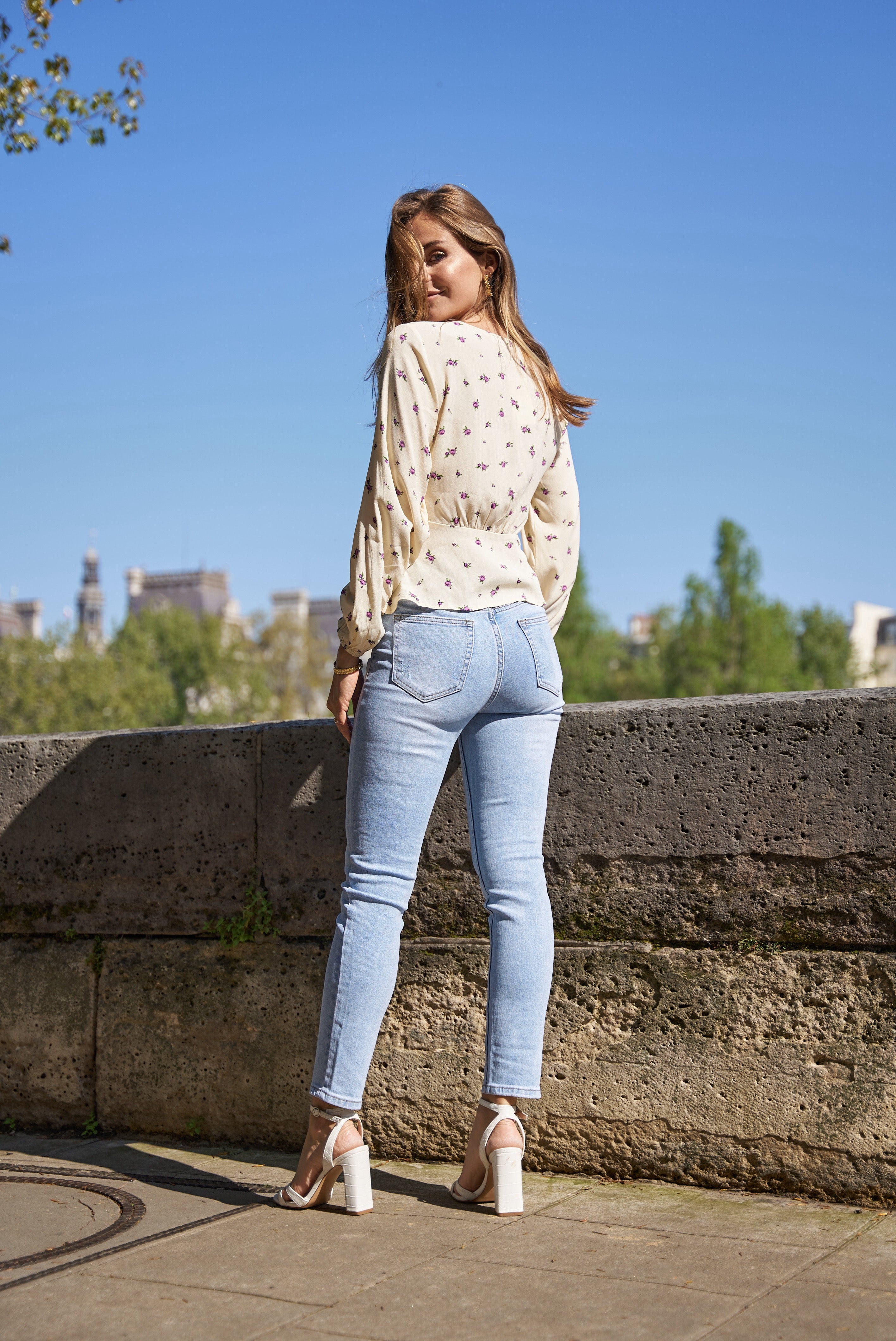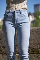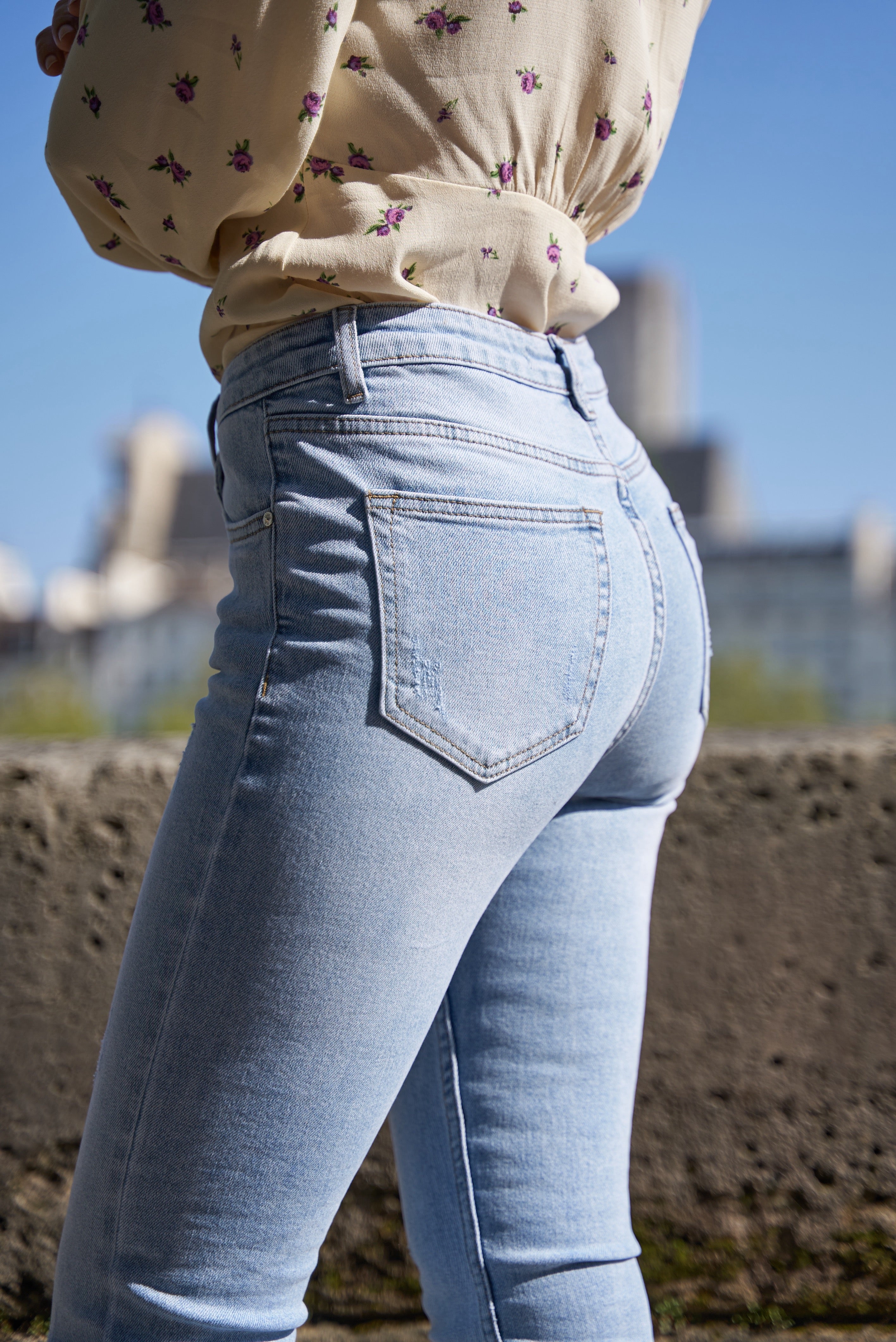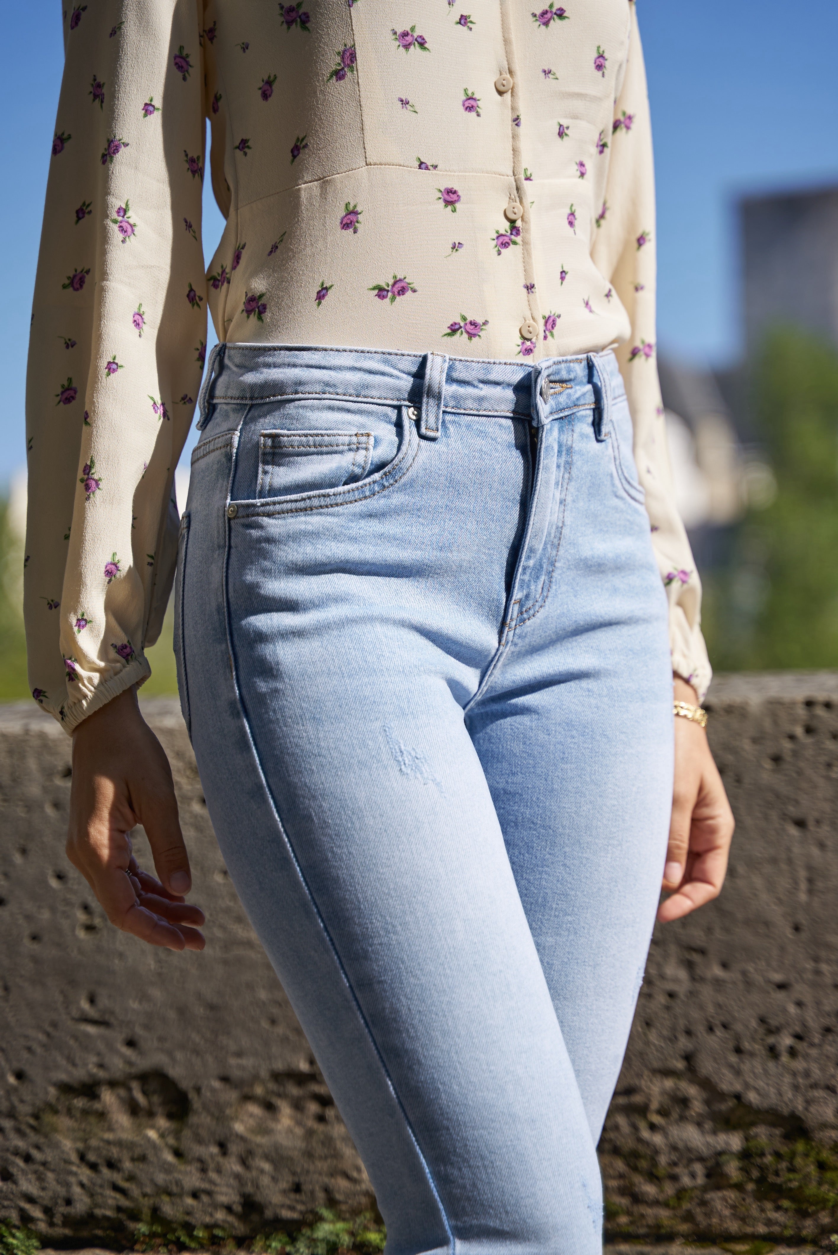 Un jean slim bleu clair à la coupe ajustée, parfait pour mettre en valeur la silhouette avec confort et élégance. Sa teinte lumineuse et son style épuré en font un essentiel facile à associer au quotidien.