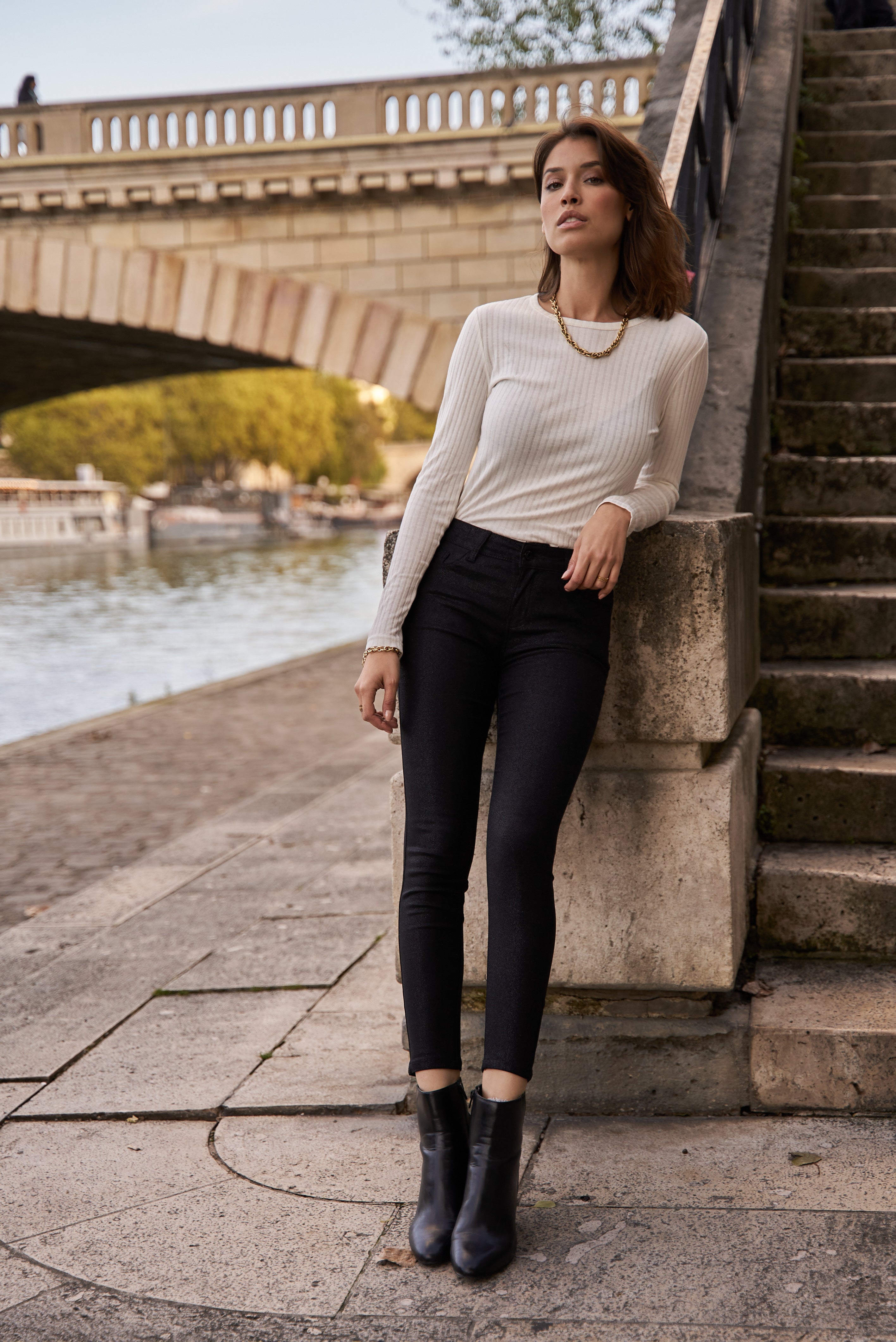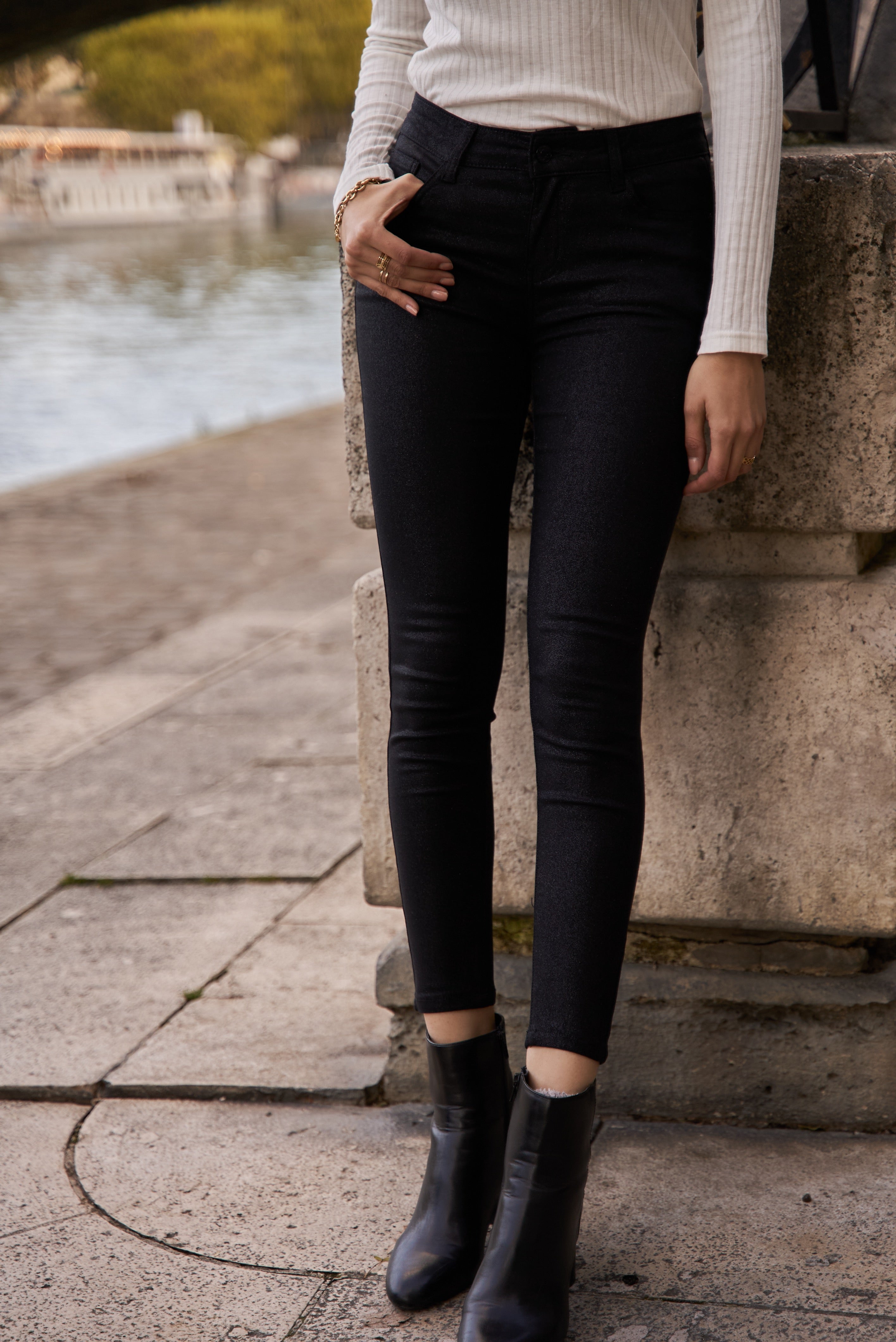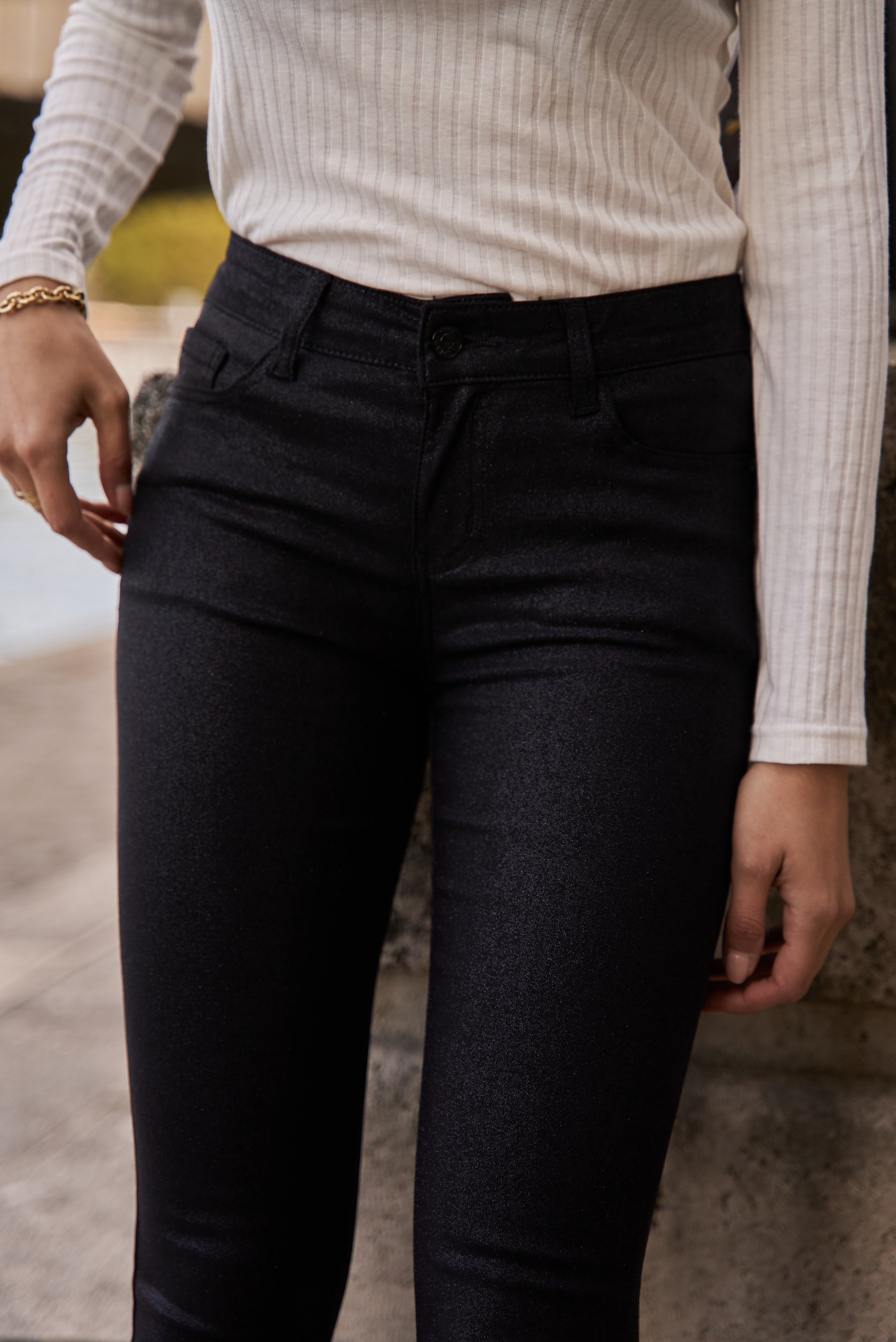 Jean skinny noir à effet pailleté, pour une silhouette galbée et un look glamour. Son tissu stretch assure un confort optimal tout en épousant parfaitement les formes. Idéal en journée comme en soirée.