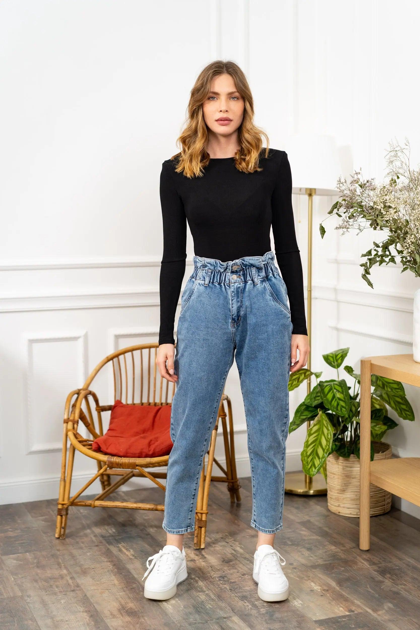 Ce jean en denim bleu clair au style paperbag est une pièce tendance qui allie originalité et confort. Sa taille haute élastiquée avec effet froncé sublime la silhouette tout en garantissant un maintien parfait.