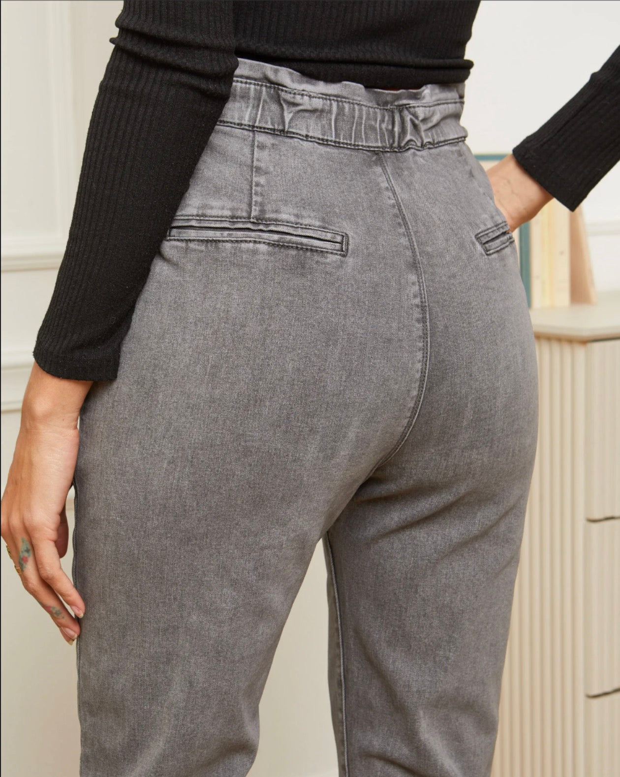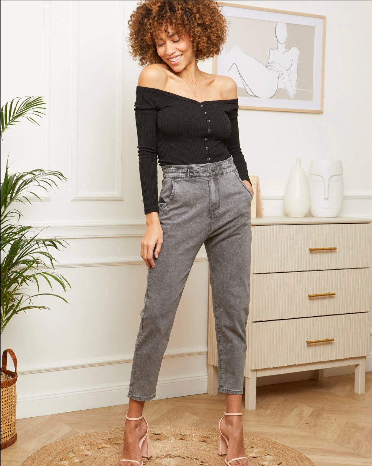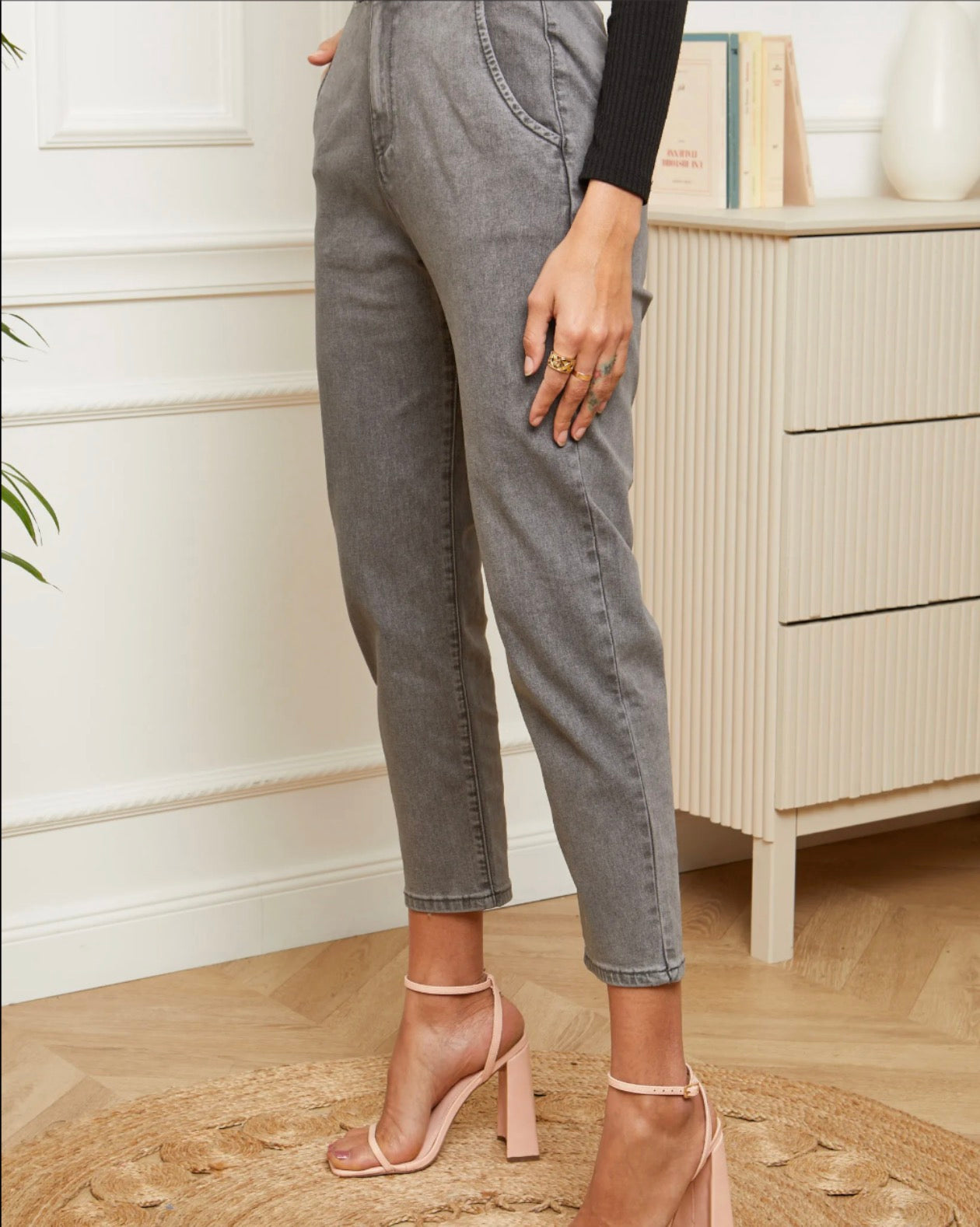 Jean slouchy en denim gris foncé, au style décontracté et tendance. Sa coupe ample apporte une allure moderne tout en assurant un confort optimal au quotidien.