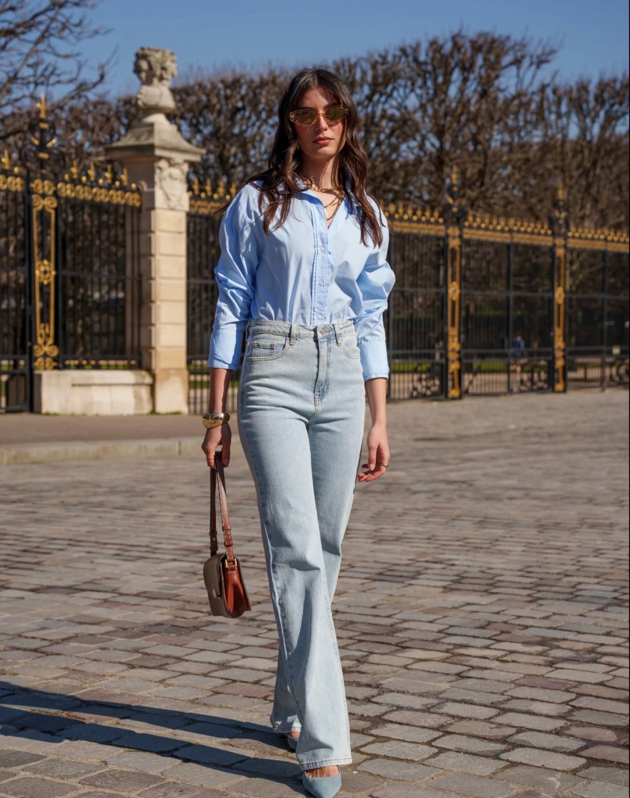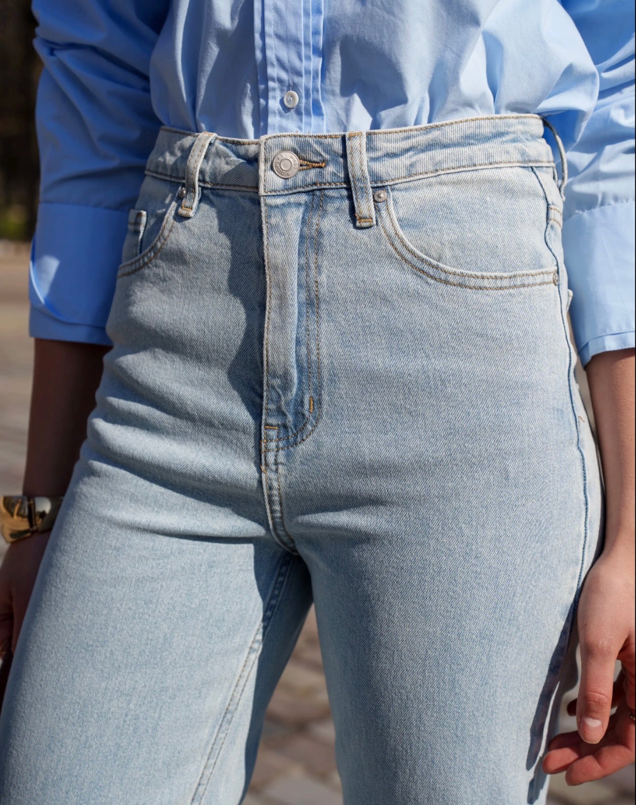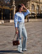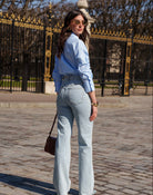 Jean wide leg bleu clair au look vintage, taille haute. Denim souple effet seconde peau. Coupe fluide pour une silhouette allongée. Détail couture contrastée.