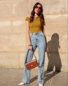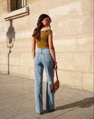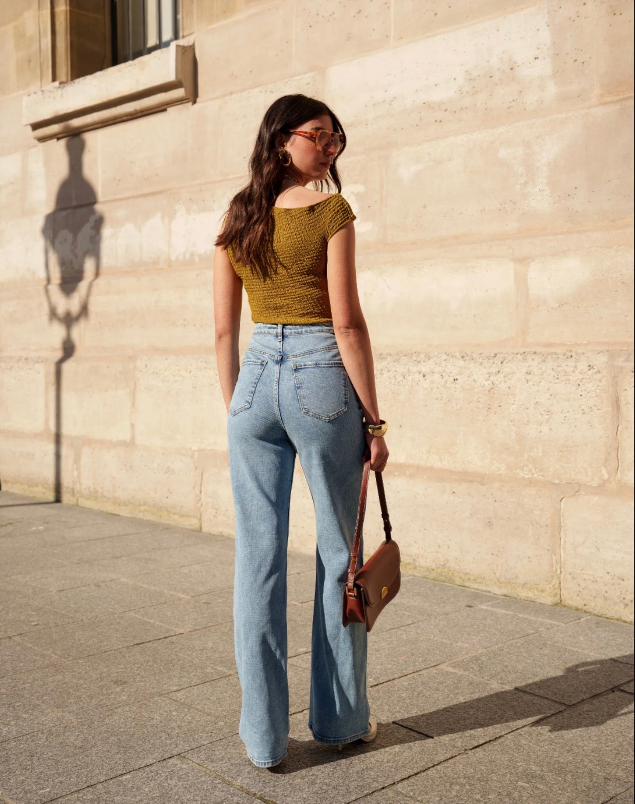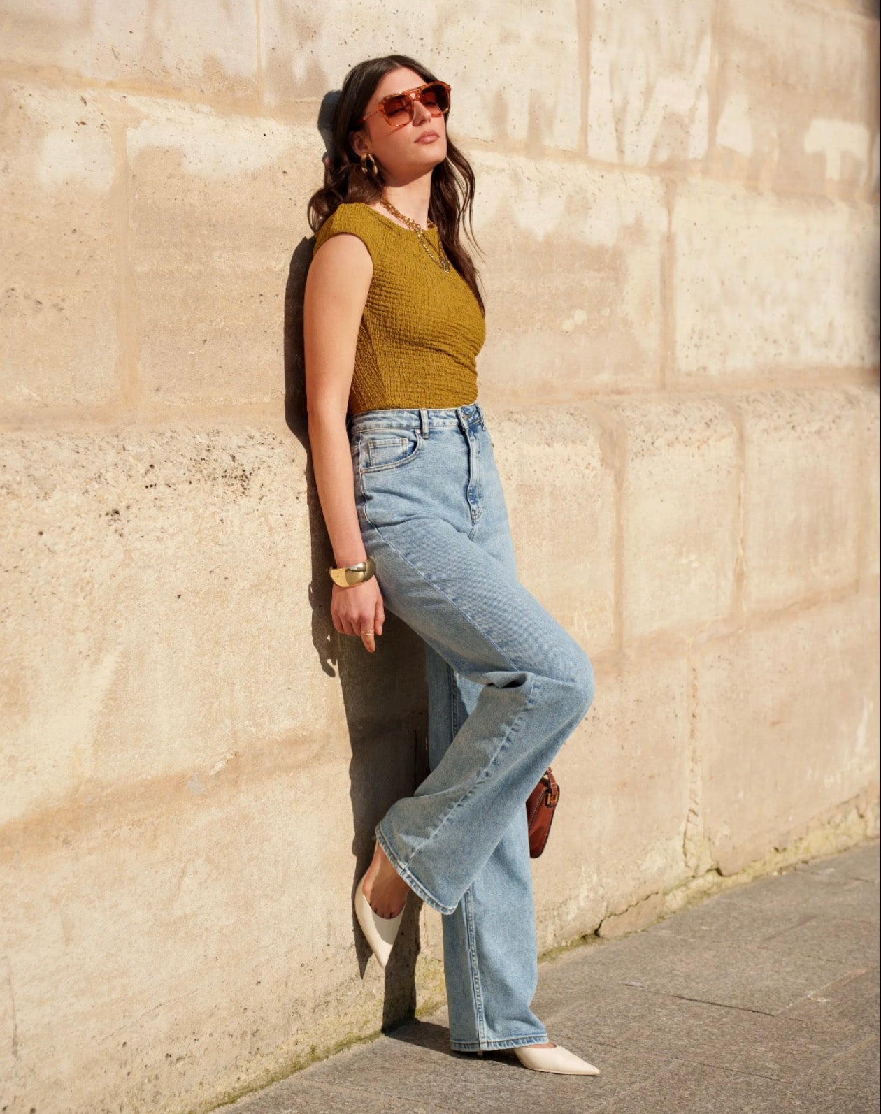 Jean wide leg bleu clair au look casual et lumineux. Taille haute bien marquée et jambe large pour une silhouette élancée. Denim souple et fluide, parfait pour la mi-saison. Finition légèrement délavée et surpiqûres contrastées pour un esprit vintage chic.