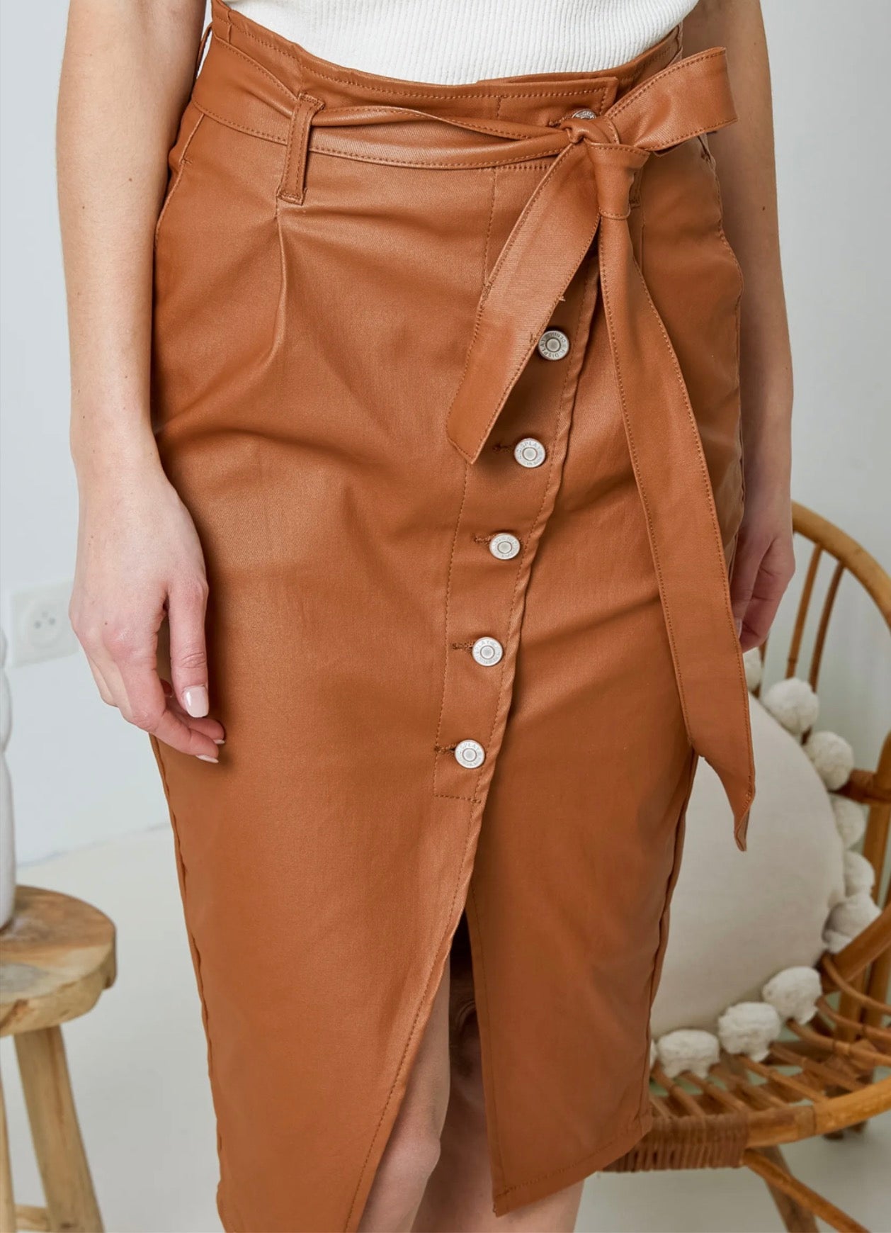 Jupe en enduit noire élégante et moderne, parfaite pour un look city chic. Sa finition légèrement brillante apporte une touche sophistiquée tout en conservant une silhouette structurée.