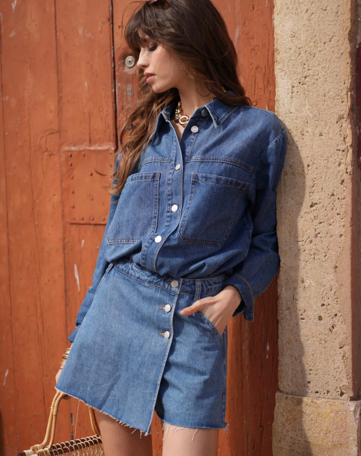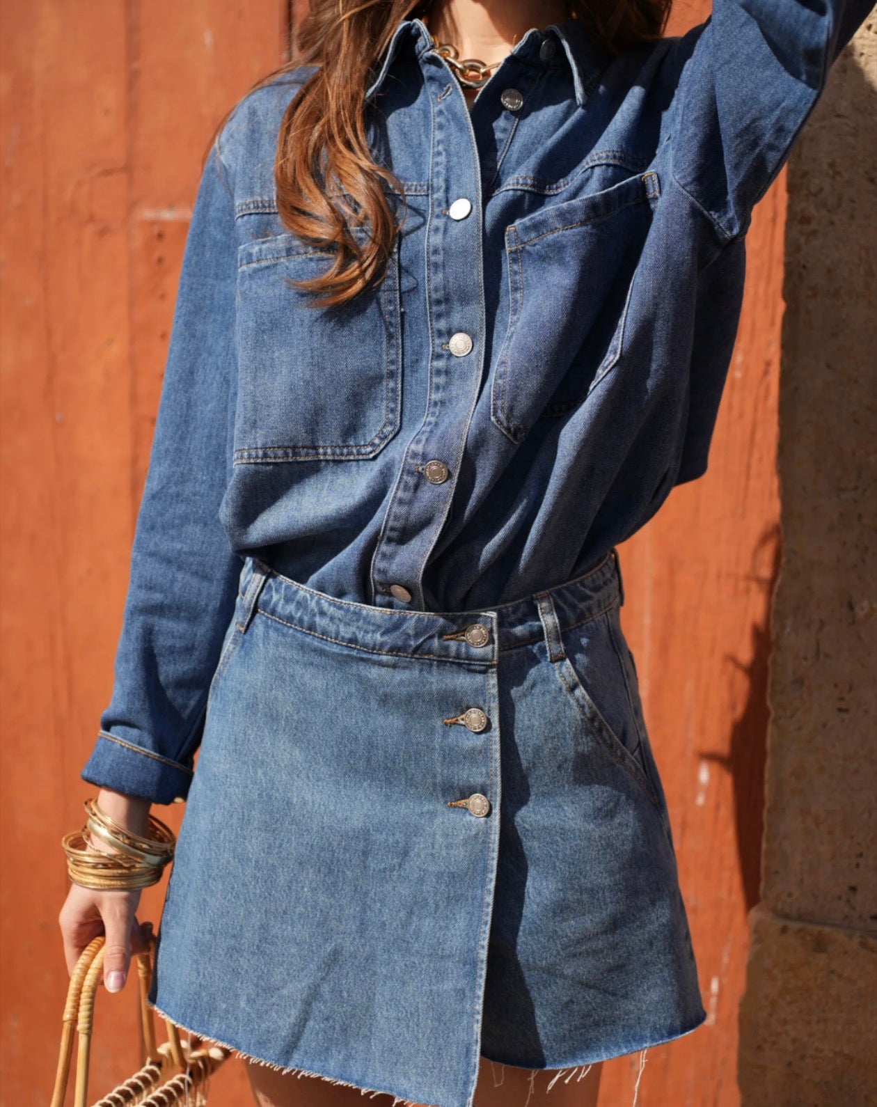 Short jupe en denim asymétrique, alliant style et praticité. Idéal pour une silhouette moderne et féminine avec le confort d’un short et l’allure d’une jupe.