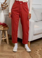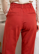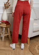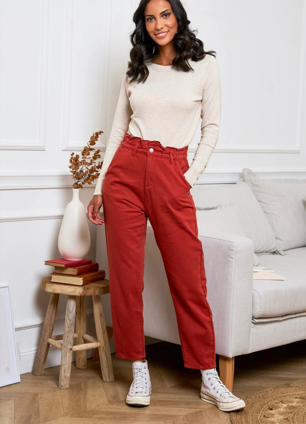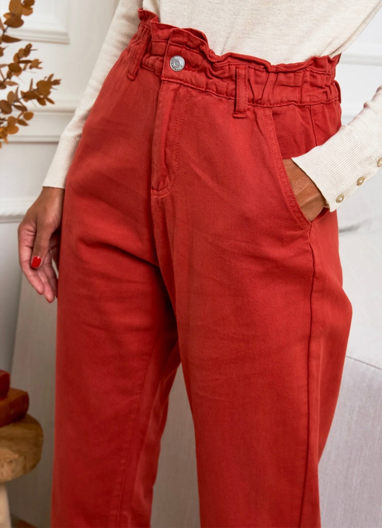 Ce pantalon paperbag couleur rouille séduit par son style à la fois tendance et confortable. Sa taille haute froncée met en valeur la silhouette tandis que sa coupe droite légèrement ample assure une aisance parfaite au quotidien. Confectionné en 100 % coton, il offre un toucher naturel et une tenue structurée, idéale pour des looks casual chic ou plus urbains. Facile à associer, il se porte aussi bien avec un pull rentré qu’une blouse fluide.