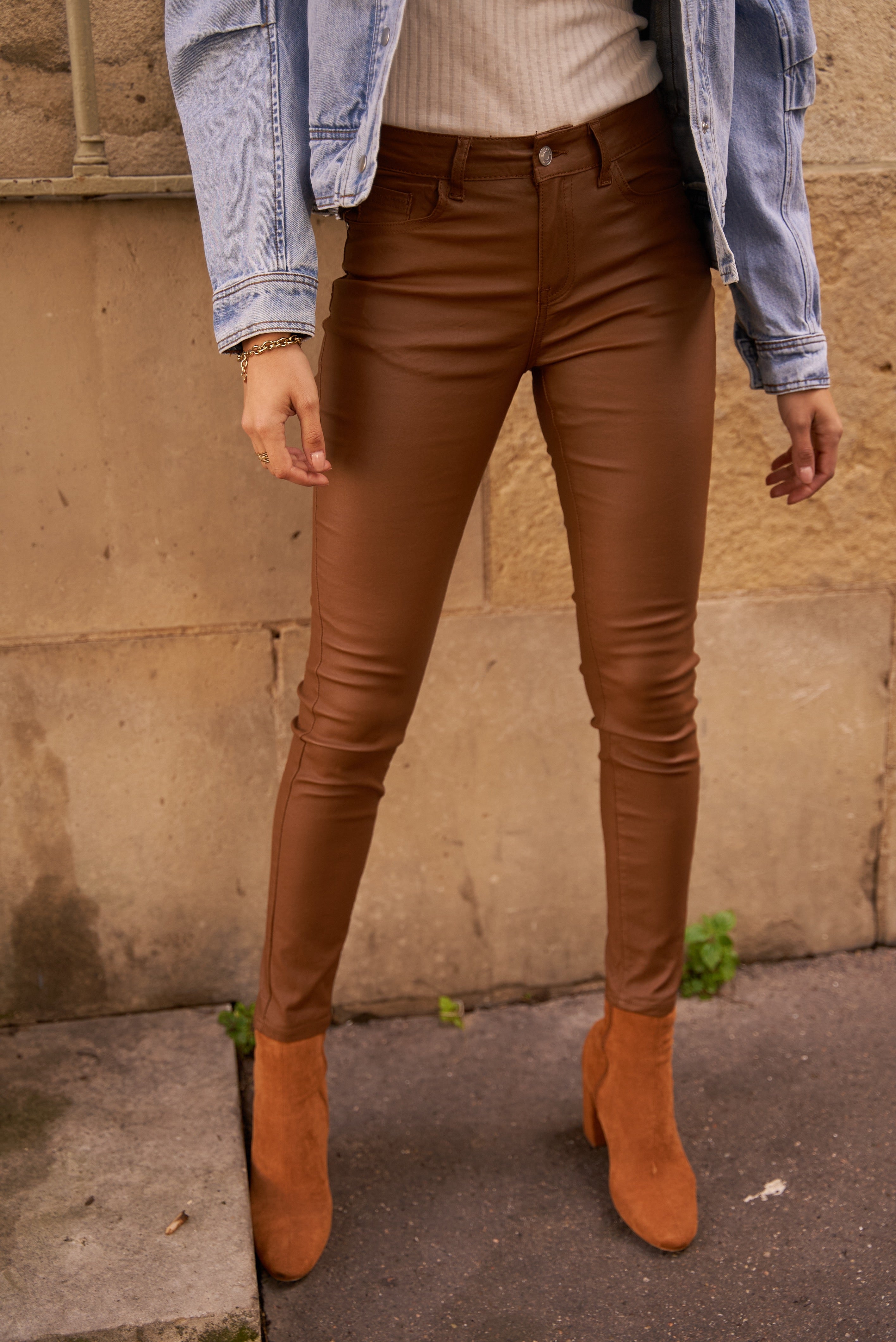 Pantalon slim enduit, taille mi-haute, au look rock et raffiné. Sa coupe ajustée sublime la silhouette, tandis que la finition brillante effet cuir apporte une touche audacieuse et moderne.