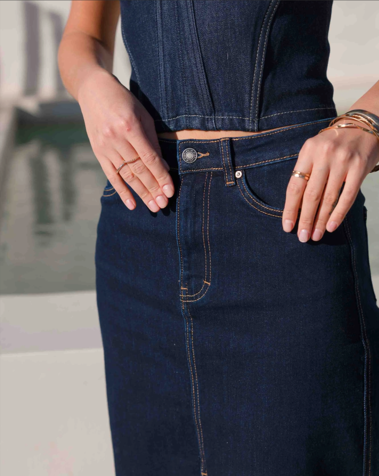 Jupe en denim brut, moderne et féminine. Sa coupe midi fendue sur le devant et son ourlet effiloché apportent une touche contemporaine à un essentiel du dressing. Parfaite pour un look city casual.
