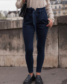 Pantalon paperbag en coton extensible, pour une allure féminine et décontractée. Sa taille haute froncée et sa coupe slim légèrement fuselée apportent structure et confort au quotidien.