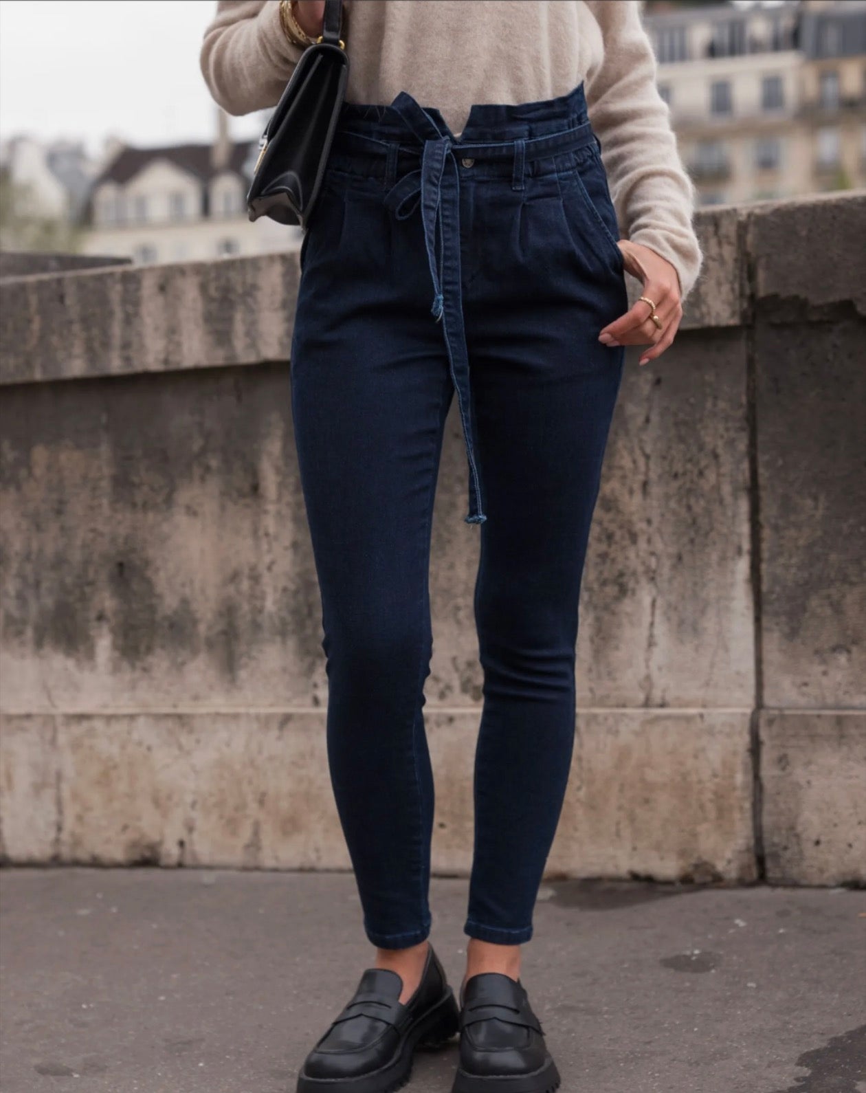 Style et coupe : Pantalon paperbag, taille haute froncée, coupe slim fuselée