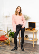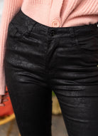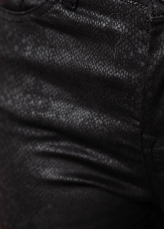 Pantalon noir enduit au motif python discret, coupe slim, matière extensible et confortable. Chic et moderne, parfait pour styliser une tenue simple.