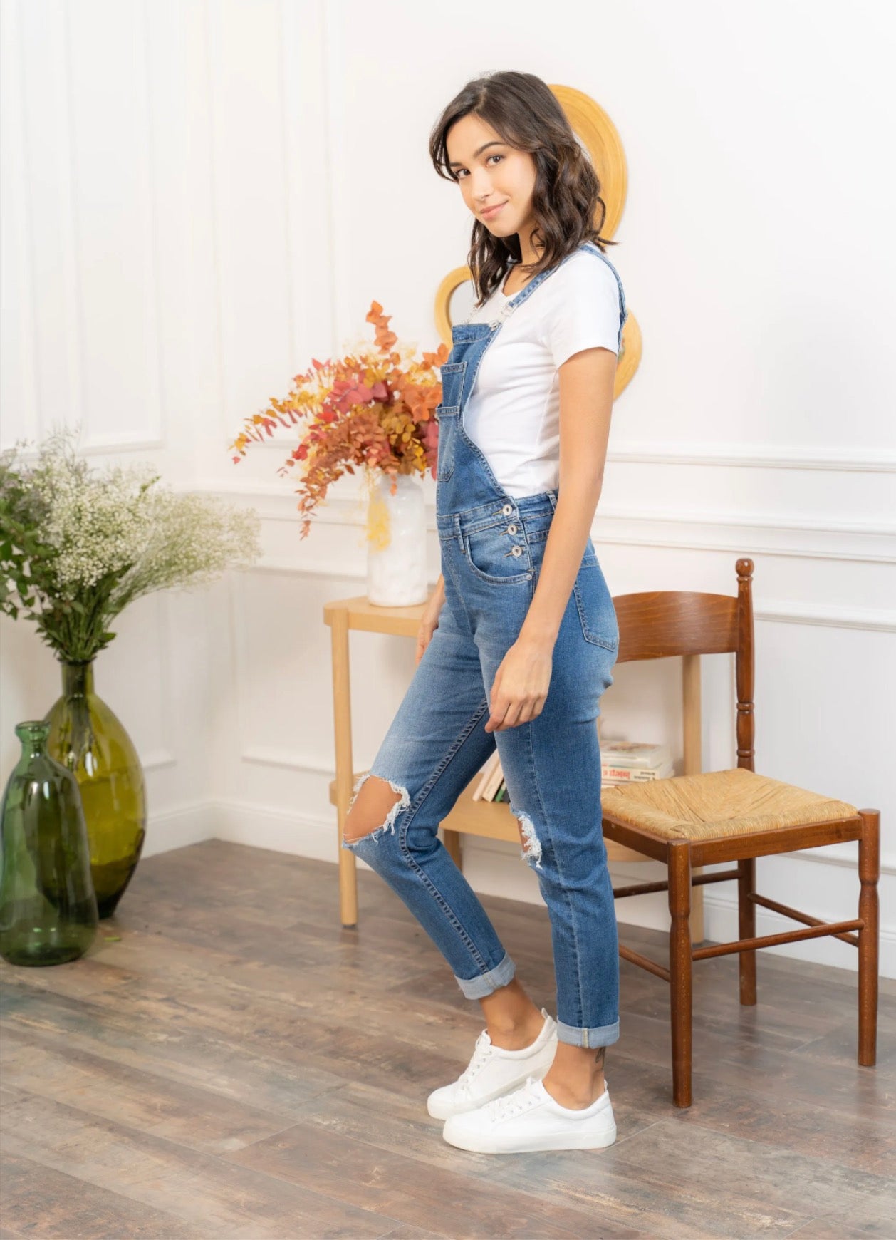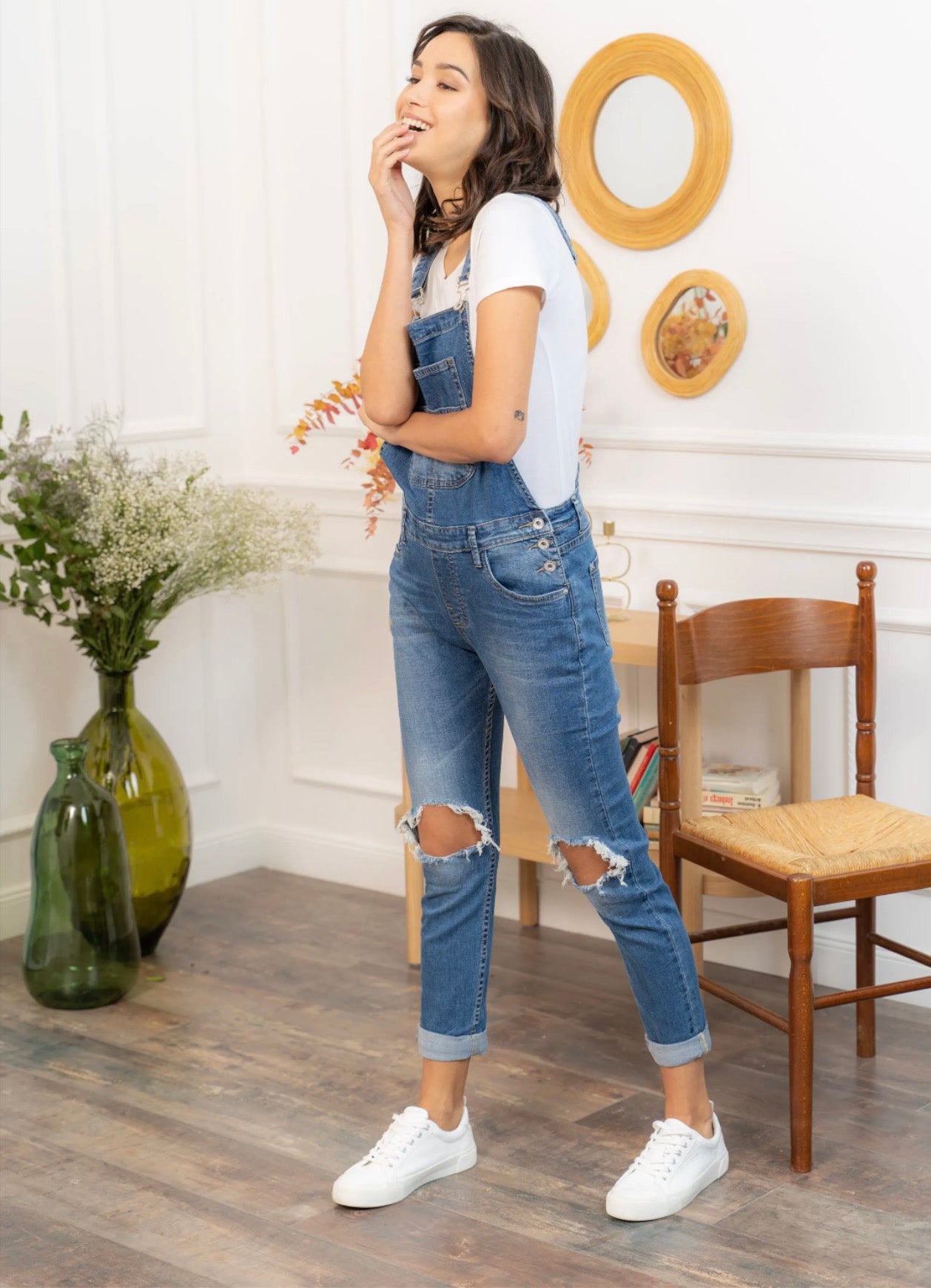 Finitions : bretelles réglables à boucles métal, boutons côtés, genoux déchirés