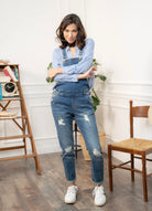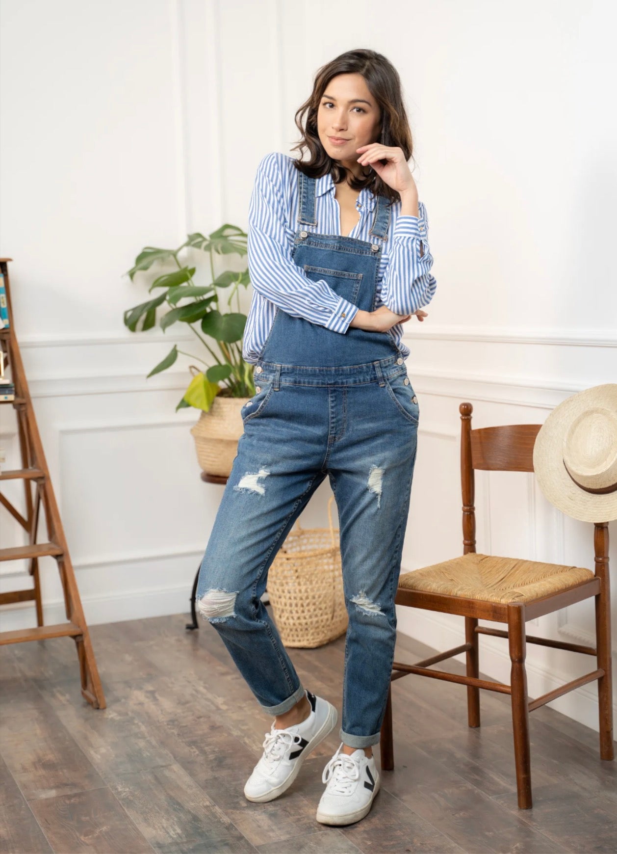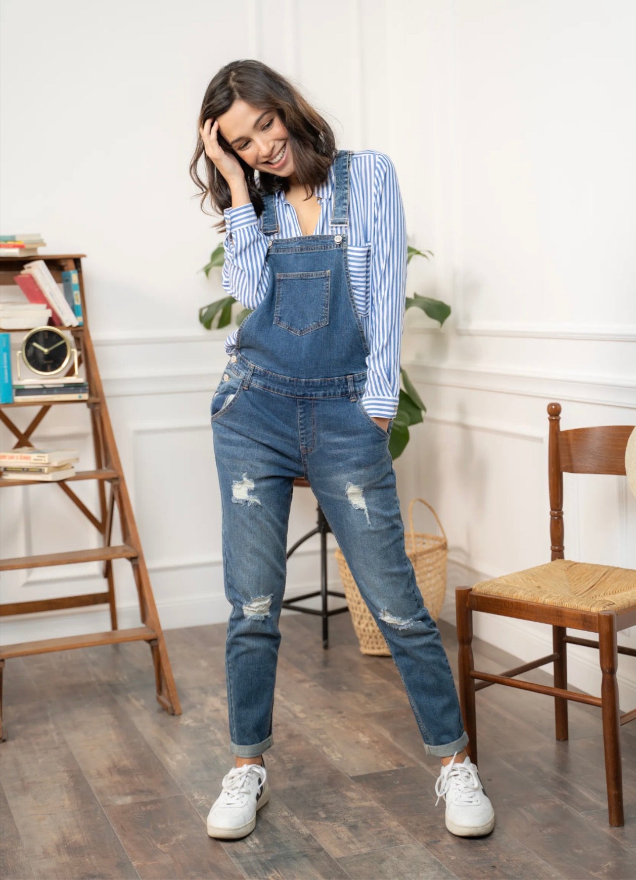 Cette salopette en jean revisite un grand classique du vestiaire avec une touche moderne et décontractée. Sa coupe droite légèrement fuselée met en valeur la silhouette tout en offrant un confort optimal. Le denim authentique, subtilement délavé, est ponctué de détails destroy pour un esprit casual très tendance. Facile à associer avec une chemise, un tee-shirt ou un pull, elle devient un indispensable du dressing quotidien.