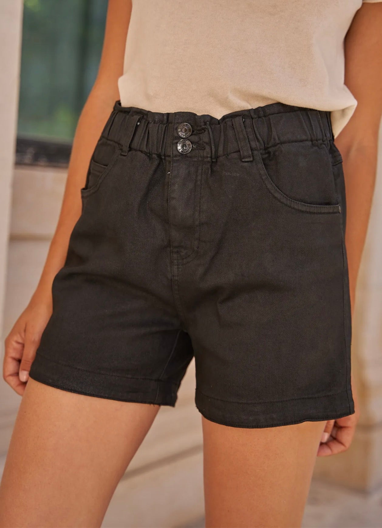 Ce short noir combine confort et allure moderne grâce à sa taille froncée élastiquée qui s’adapte parfaitement à la silhouette. Sa coupe droite flatte la jambe tandis que sa matière en toile souple offre un tombé naturel et agréable à porter. Les doubles boutons à la taille apportent une touche tendance et structurée, idéale pour un look casual chic au quotidien.