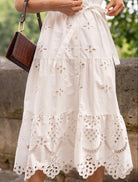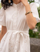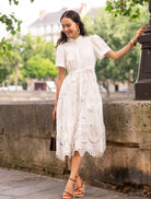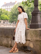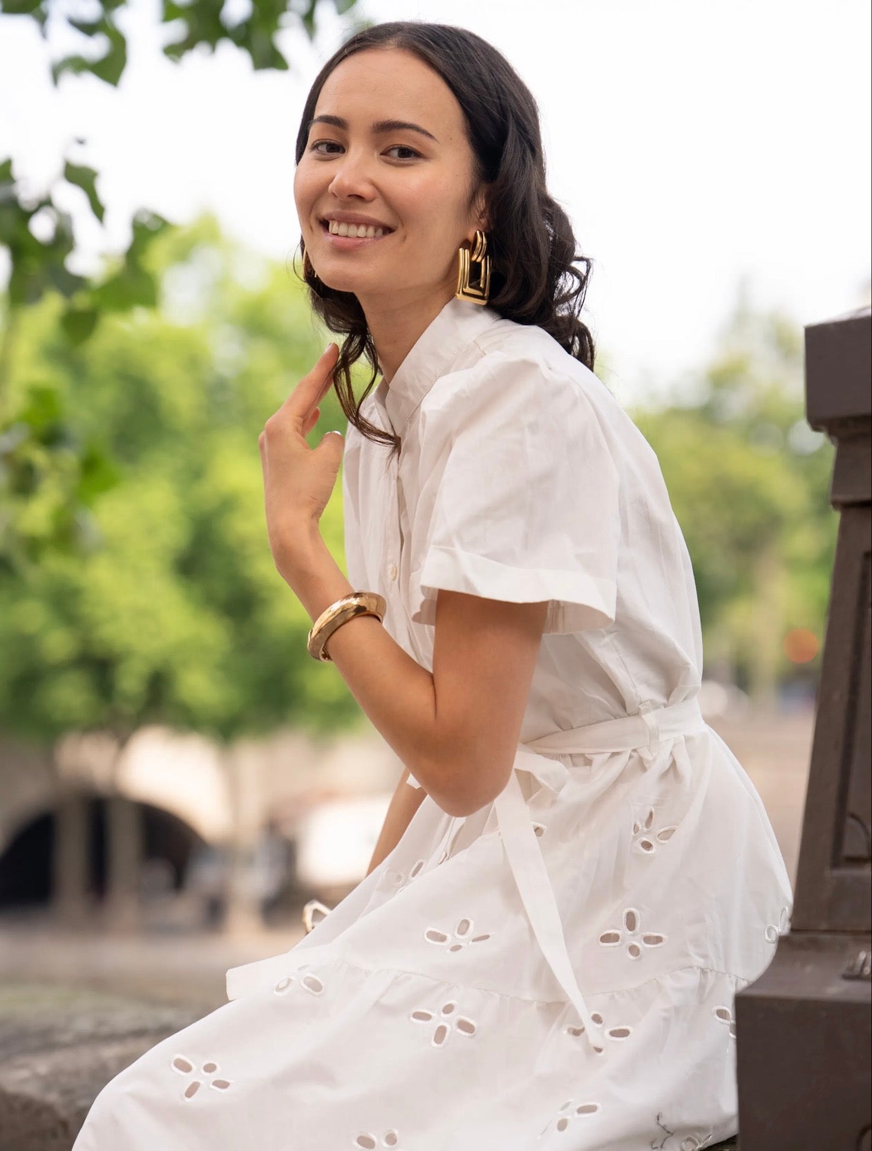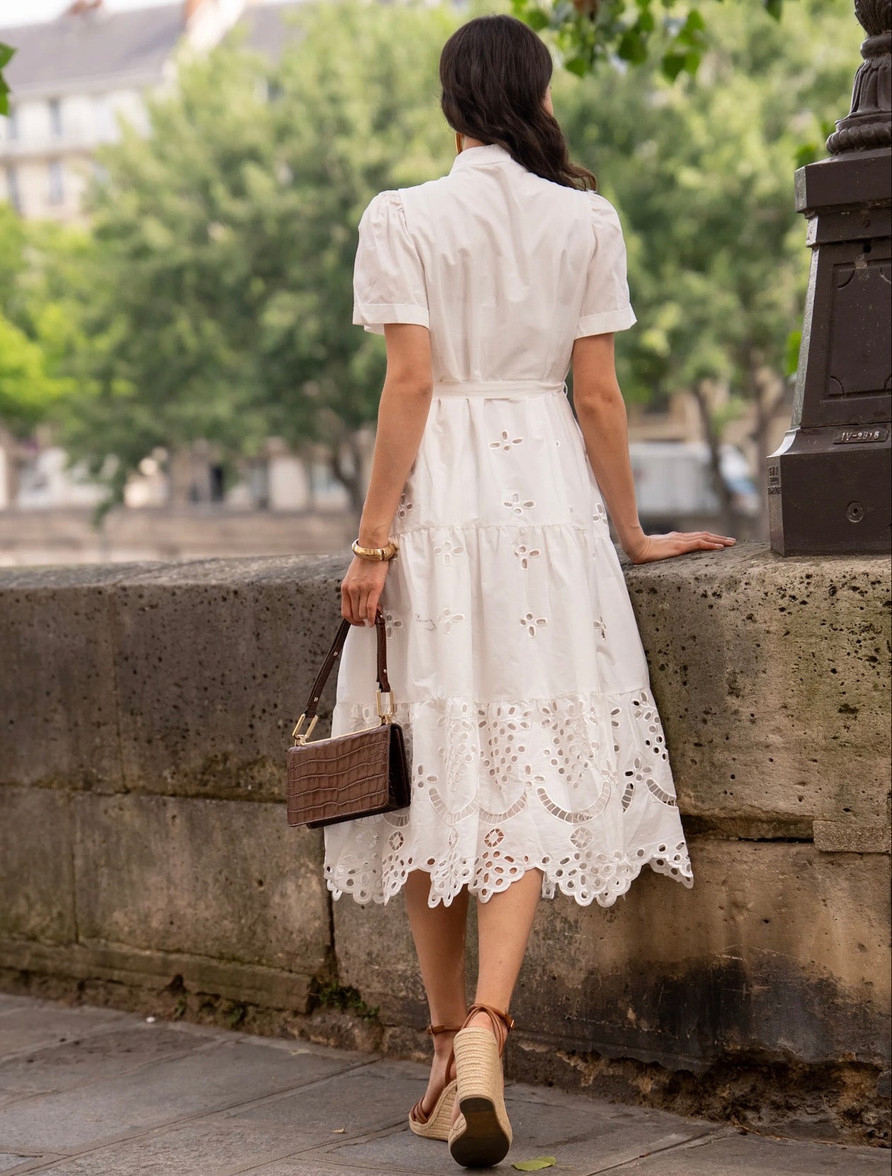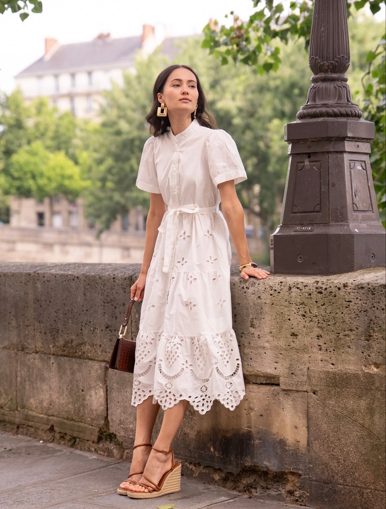 Une robe blanche en broderie anglaise au charme raffiné, idéale pour les journées ensoleillées comme pour les escapades en ville. Sa coupe midi et sa ceinture à nouer soulignent élégamment la taille, tandis que les détails ajourés lui apportent une touche de fraîcheur romantique. Légère, féminine et facile à accessoiriser, elle traverse les saisons avec élégance.