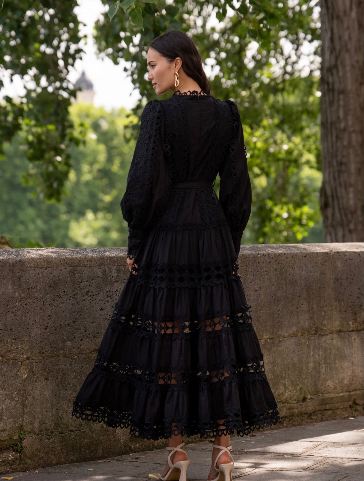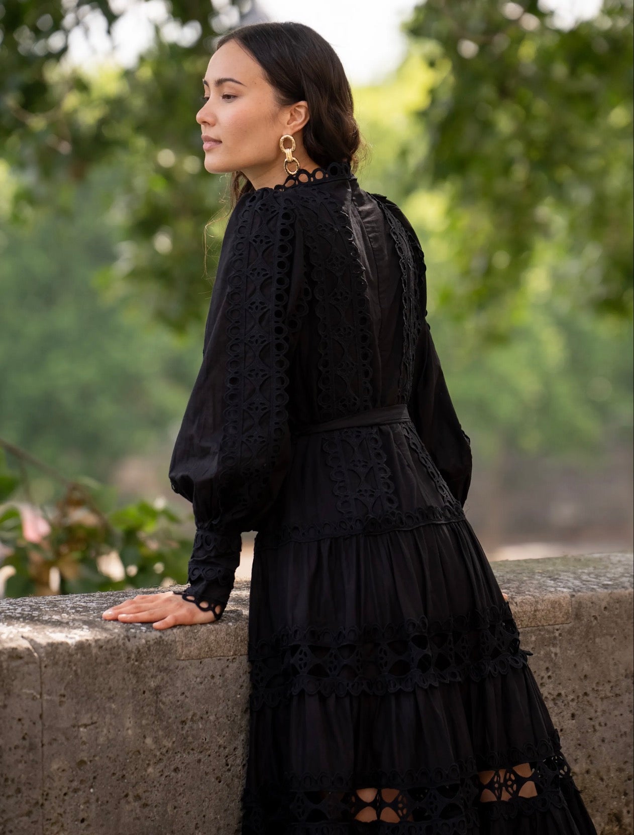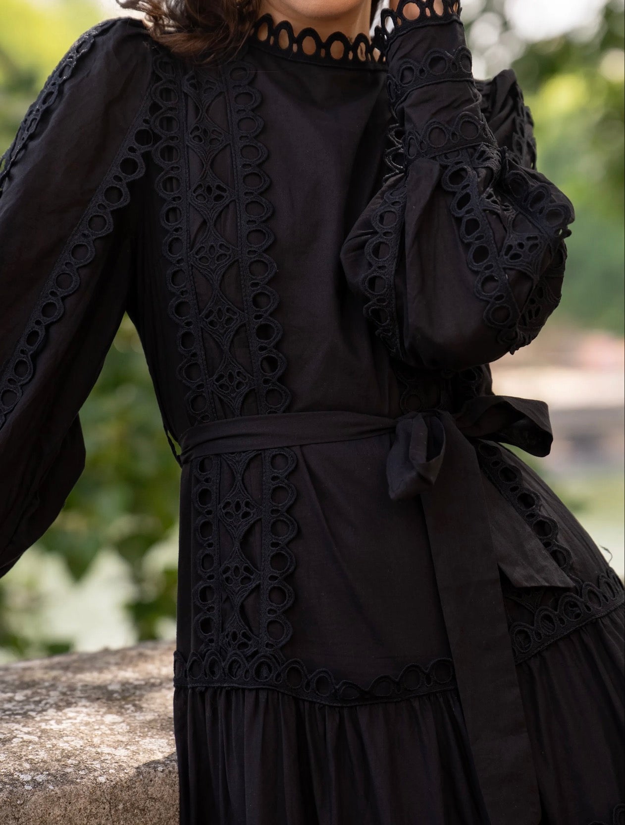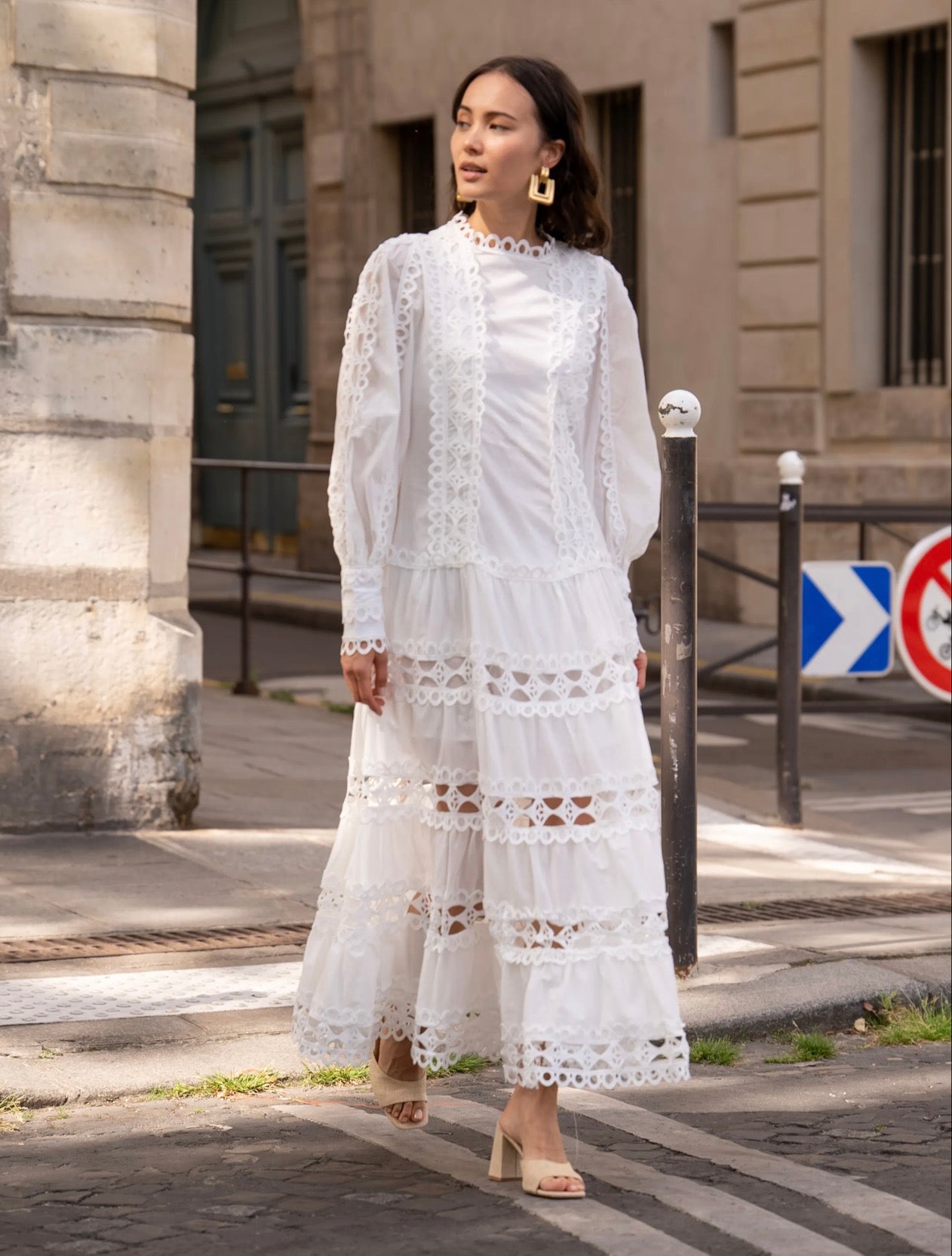 Une robe aérienne et romantique, parfaite pour les journées ensoleillées en ville ou à la campagne. Sa coupe fluide et ses broderies anglaises lui confèrent un charme intemporel, tandis que les manches évasées et les détails festonnés ajoutent une touche bohème-chic.