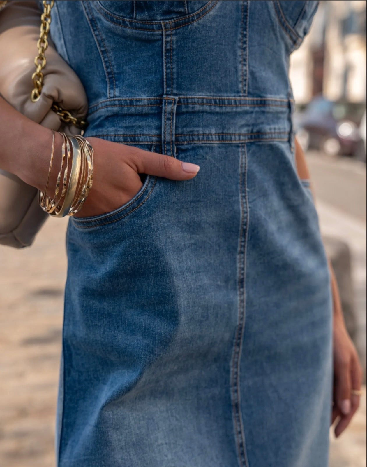 Robe midi en denim structurée, à l’inspiration corset, alliant élégance et modernité. Sa coupe ajustée et ses détails soignés en font une pièce forte, idéale pour un look urbain chic ou un style casual sophistiqué.