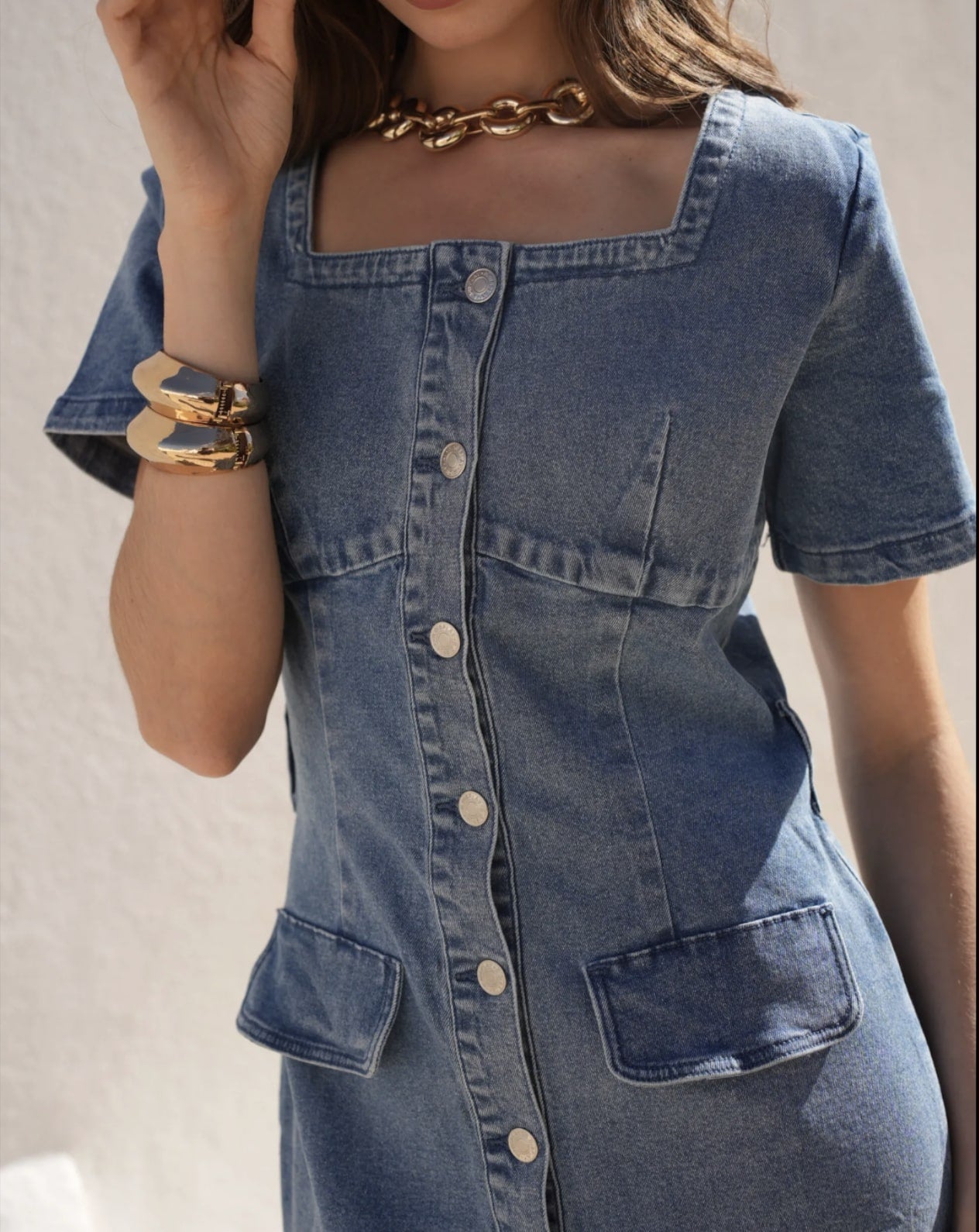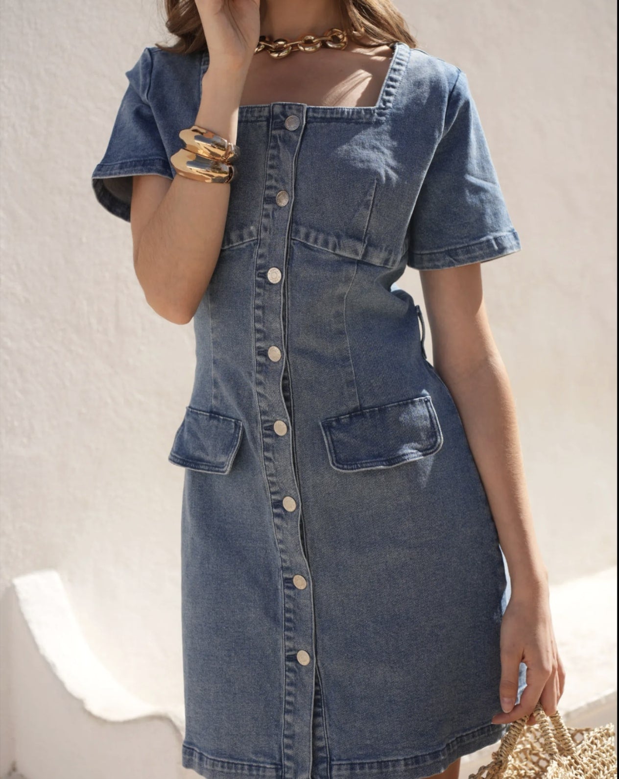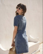 Robe courte en denim au style chic et décontracté, idéale pour la saison estivale. Sa coupe féminine et ses détails utilitaires en font une pièce facile à porter au quotidien, tout en restant tendance.