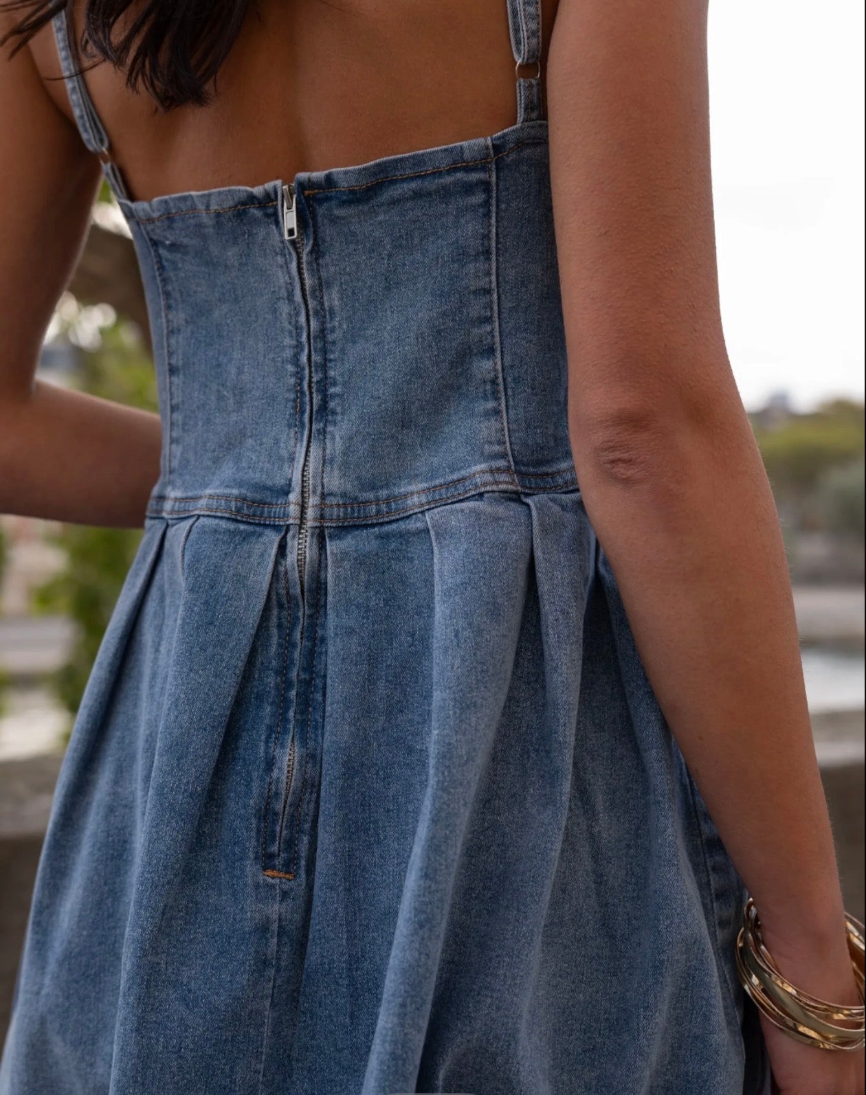 Robe courte en denim au style rétro-chic et féminin, parfaite pour les journées ensoleillées ou un look décontracté raffiné. Sa coupe flatteuse met en valeur la silhouette tout en offrant un joli volume grâce aux plis de la jupe.