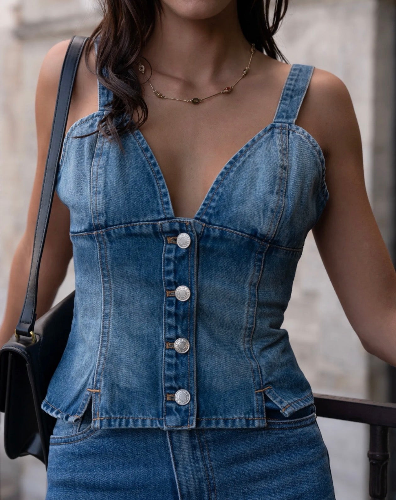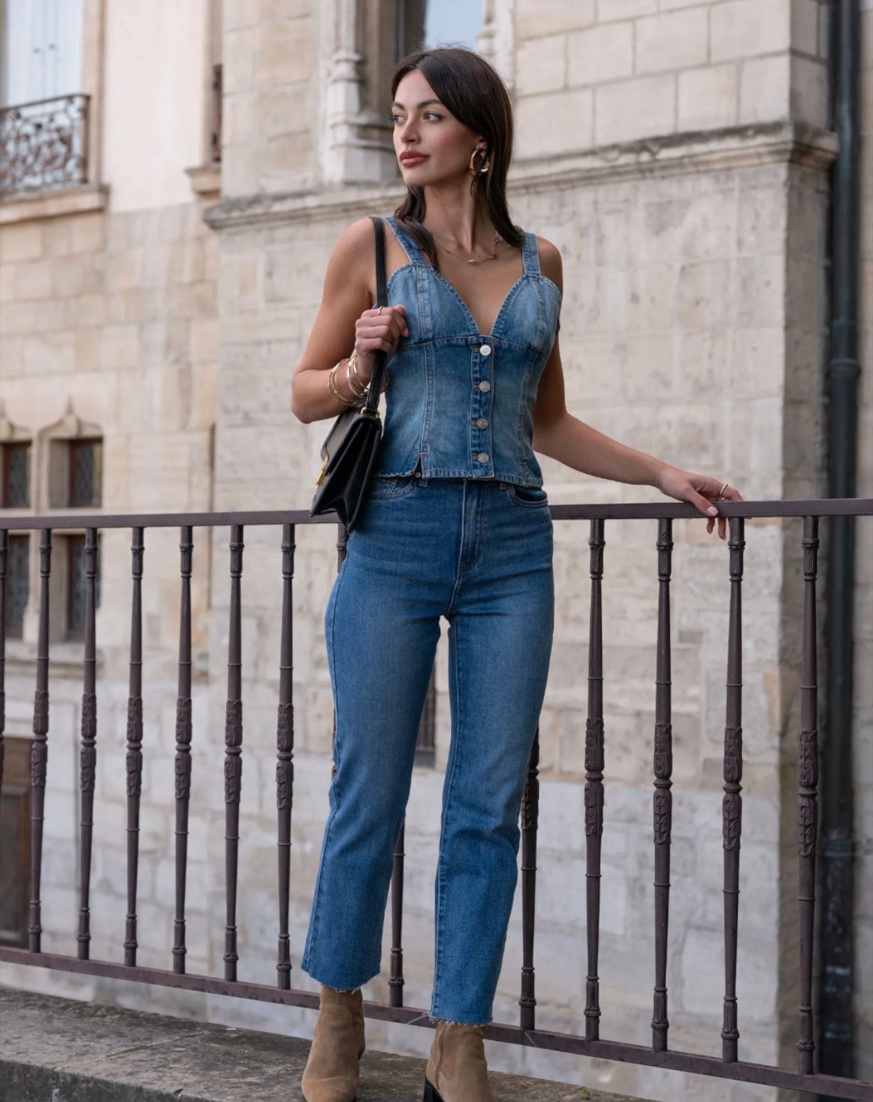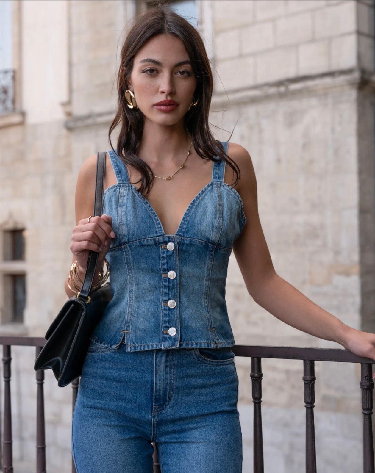 Ce top bustier en denim est la pièce forte de la saison. Avec son décolleté en V structuré, sa taille cintrée et ses boutons métal, il sublime la silhouette tout en apportant une touche rétro et audacieuse. Sa matière stretch assure un maintien parfait, tandis que le dos smocké s’ajuste confortablement à toutes les morphologies.