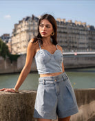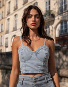 Top bustier en denim bleu clair, pour une allure féminine et structurée. Inspiré du corset, ce modèle souligne le buste tout en apportant confort et modernité grâce à son dos smocké et ses bretelles réglables.