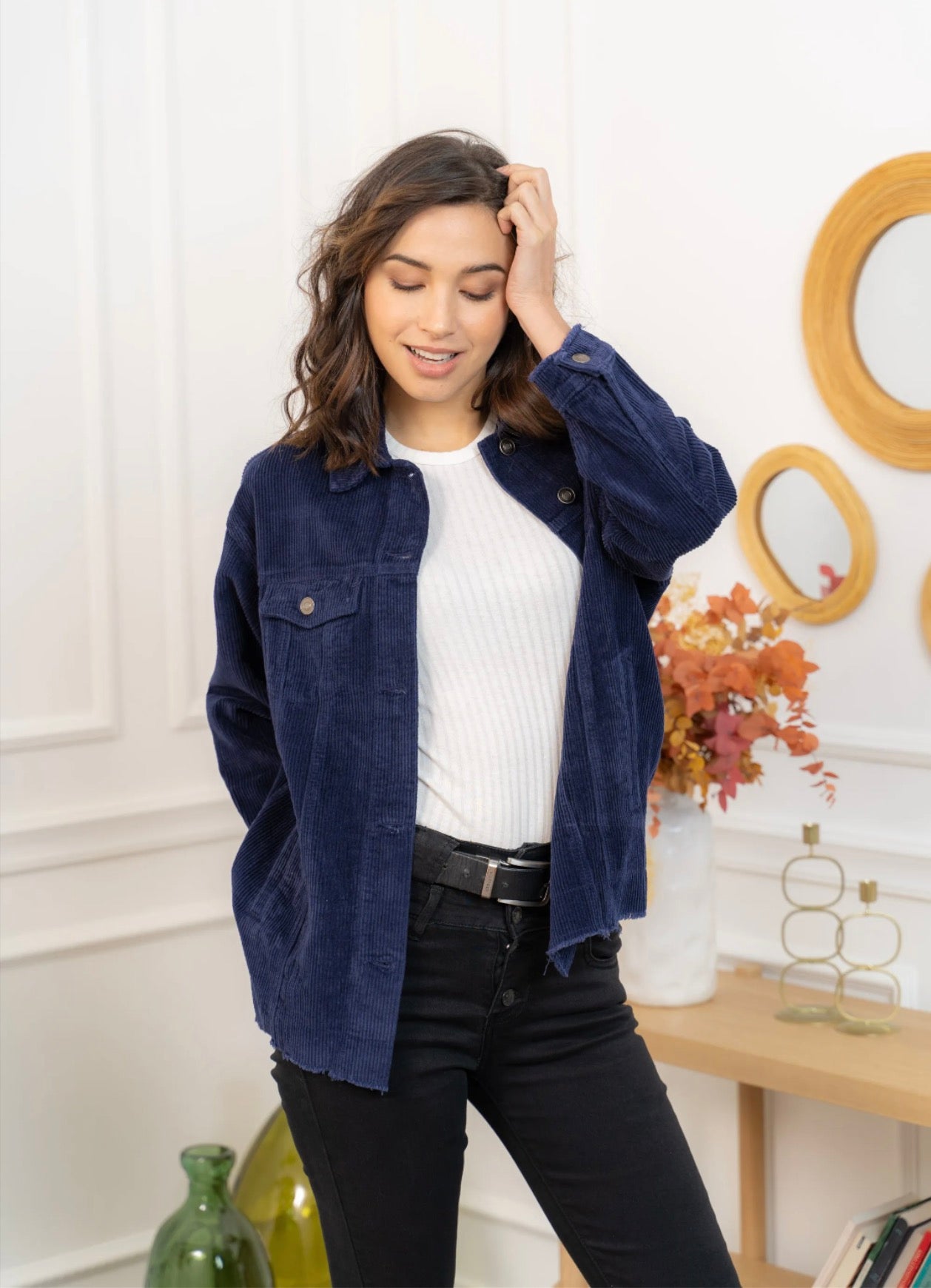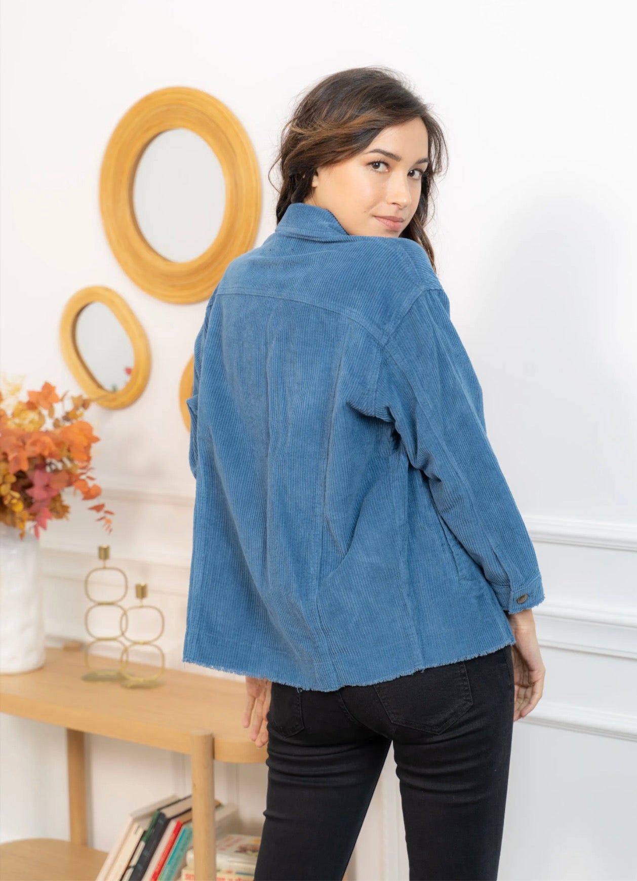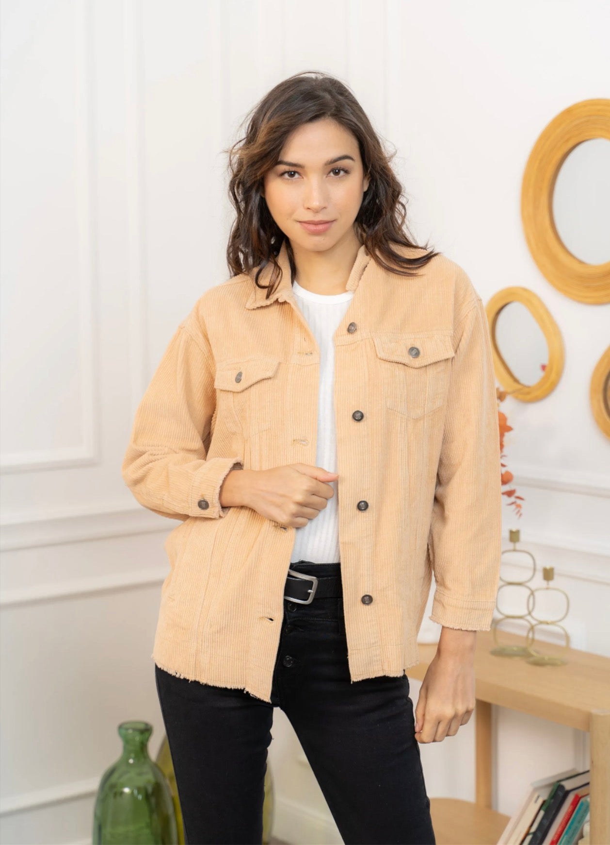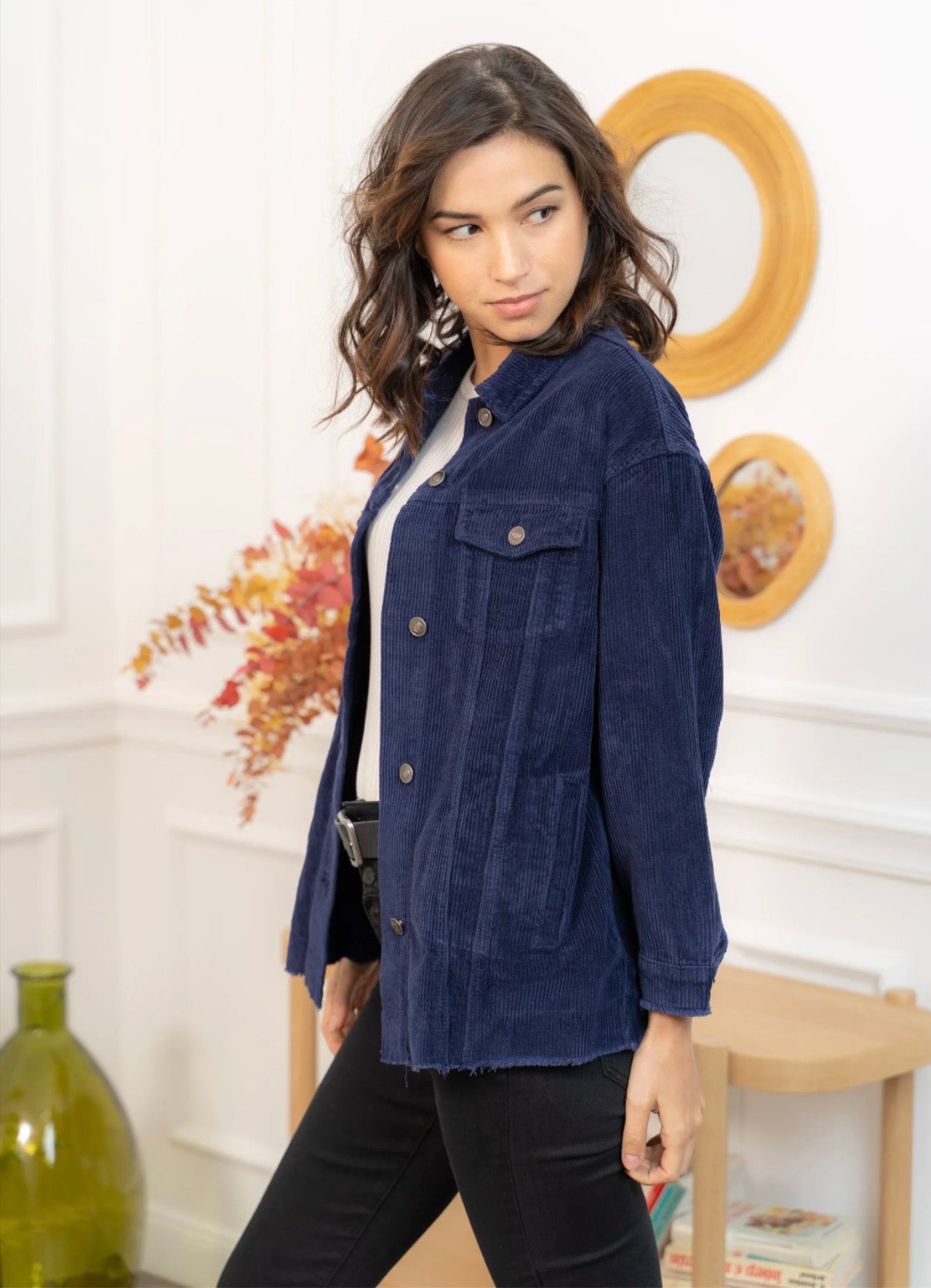 Cette veste en velours offre une allure à la fois cosy et tendance grâce à sa coupe oversize et sa texture côtelée ultra-douce. Facile à superposer, elle apporte immédiatement du style à une tenue simple comme un tee-shirt blanc et un jean, tout en restant confortable pour le quotidien. Ses poches plaquées, ses boutons pression métalliques et ses finitions légèrement effilochées lui donnent une touche casual-chic parfaite. Déclinée en plusieurs couleurs, elle s’adapte à toutes les envies et se porte aussi bien ouverte que boutonnée pour varier les looks.