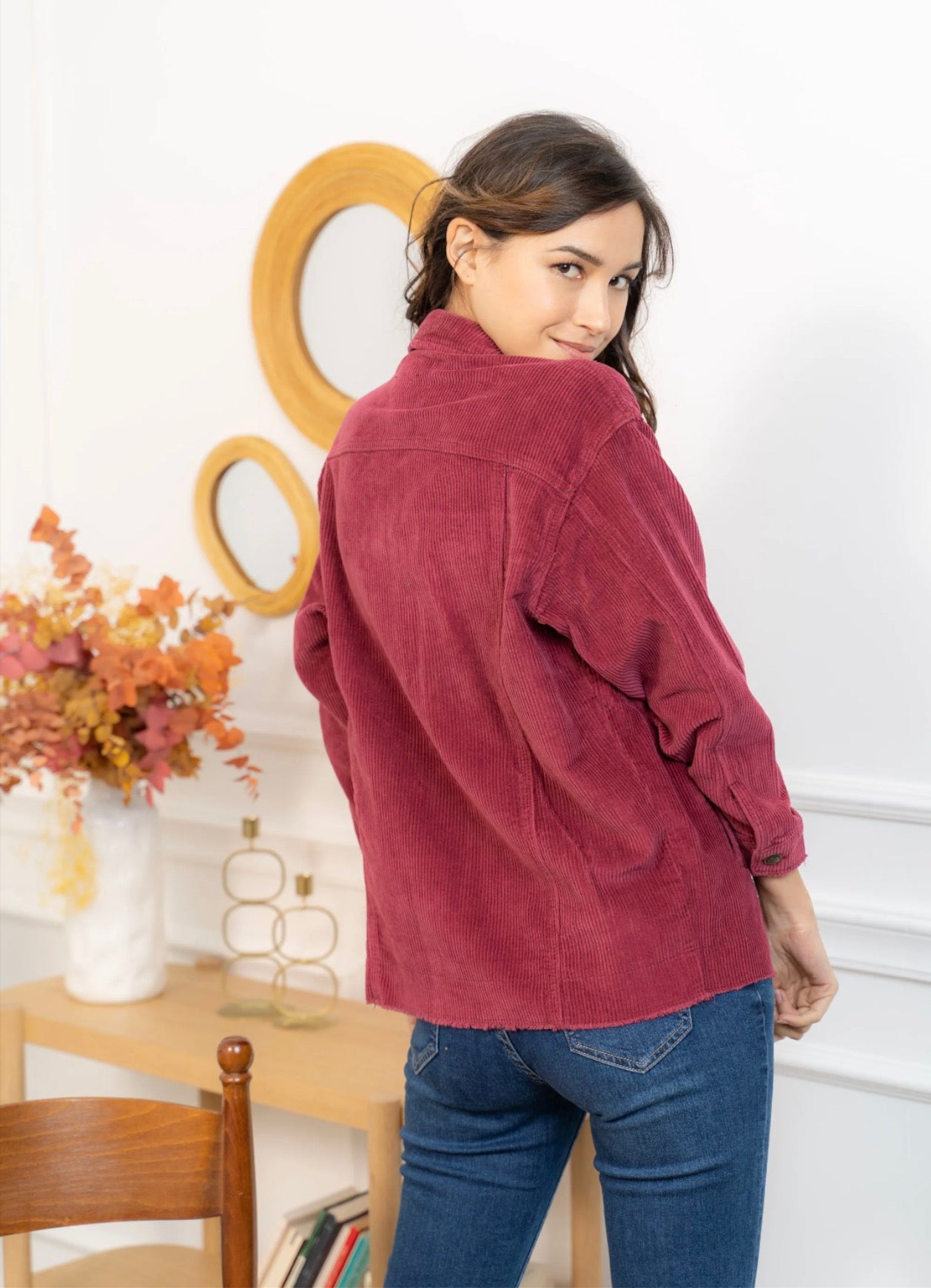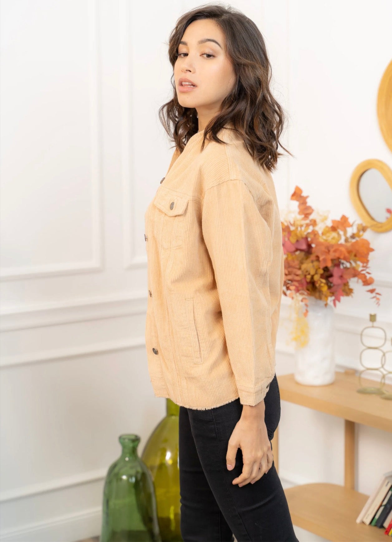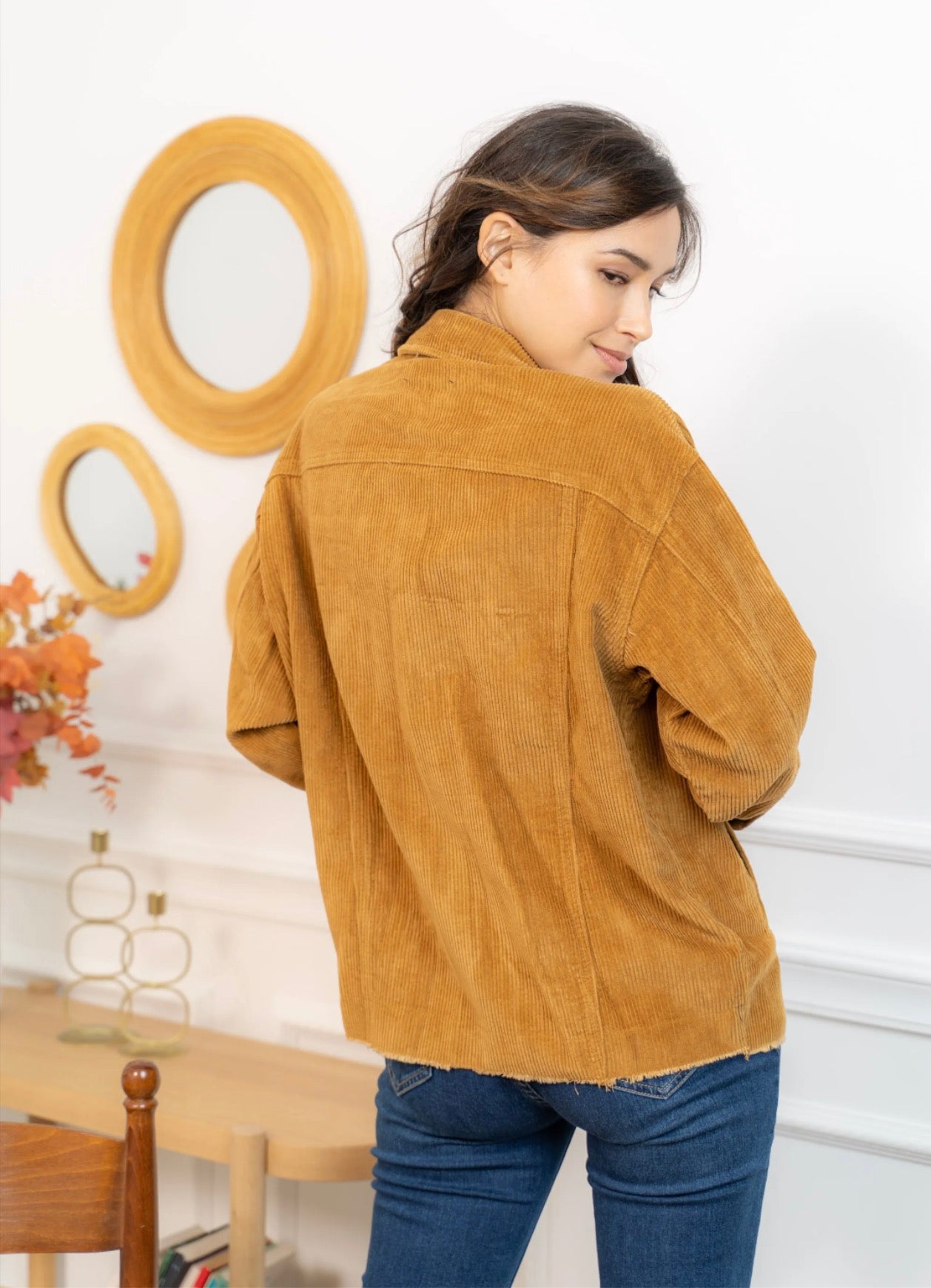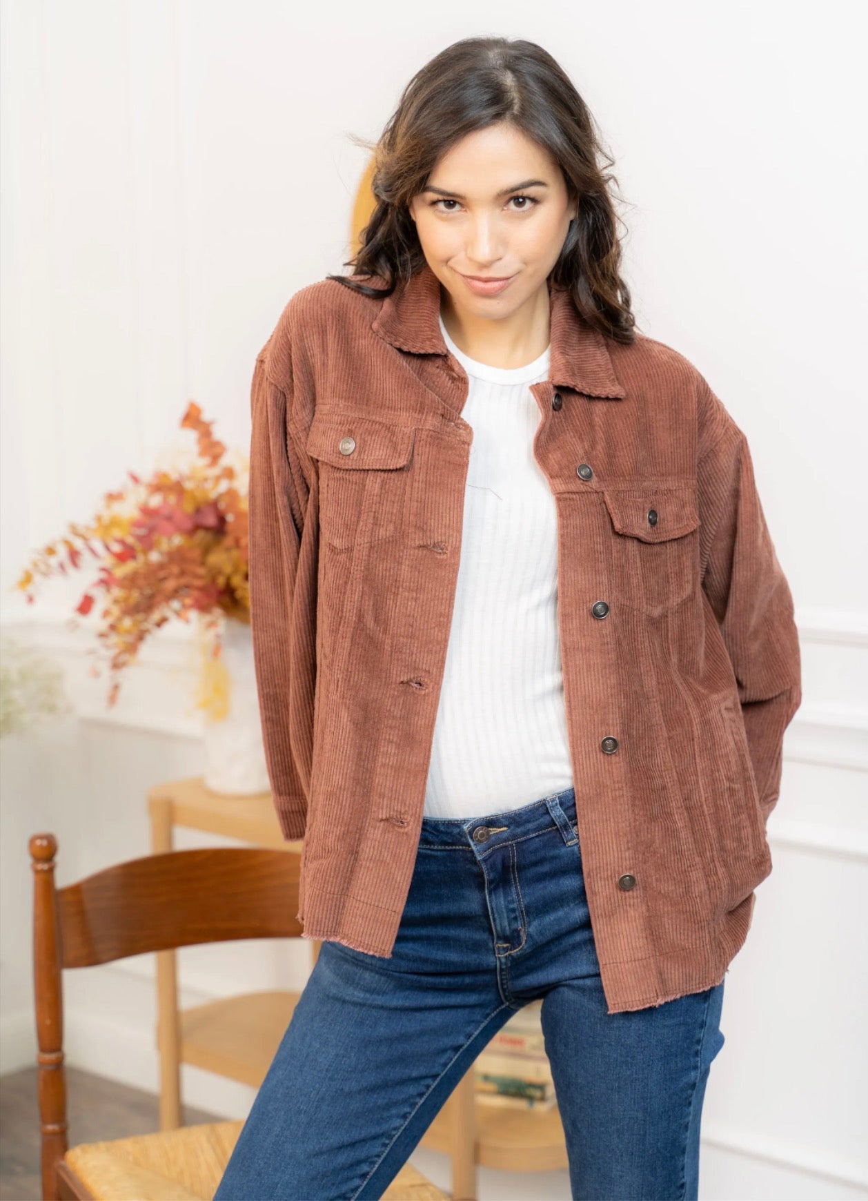 Cette veste en velours offre une allure à la fois cosy et tendance grâce à sa coupe oversize et sa texture côtelée ultra-douce. Facile à superposer, elle apporte immédiatement du style à une tenue simple comme un tee-shirt blanc et un jean, tout en restant confortable pour le quotidien. Ses poches plaquées, ses boutons pression métalliques et ses finitions légèrement effilochées lui donnent une touche casual-chic parfaite. Déclinée en plusieurs couleurs, elle s’adapte à toutes les envies et se porte aussi bien ouverte que boutonnée pour varier les looks.
