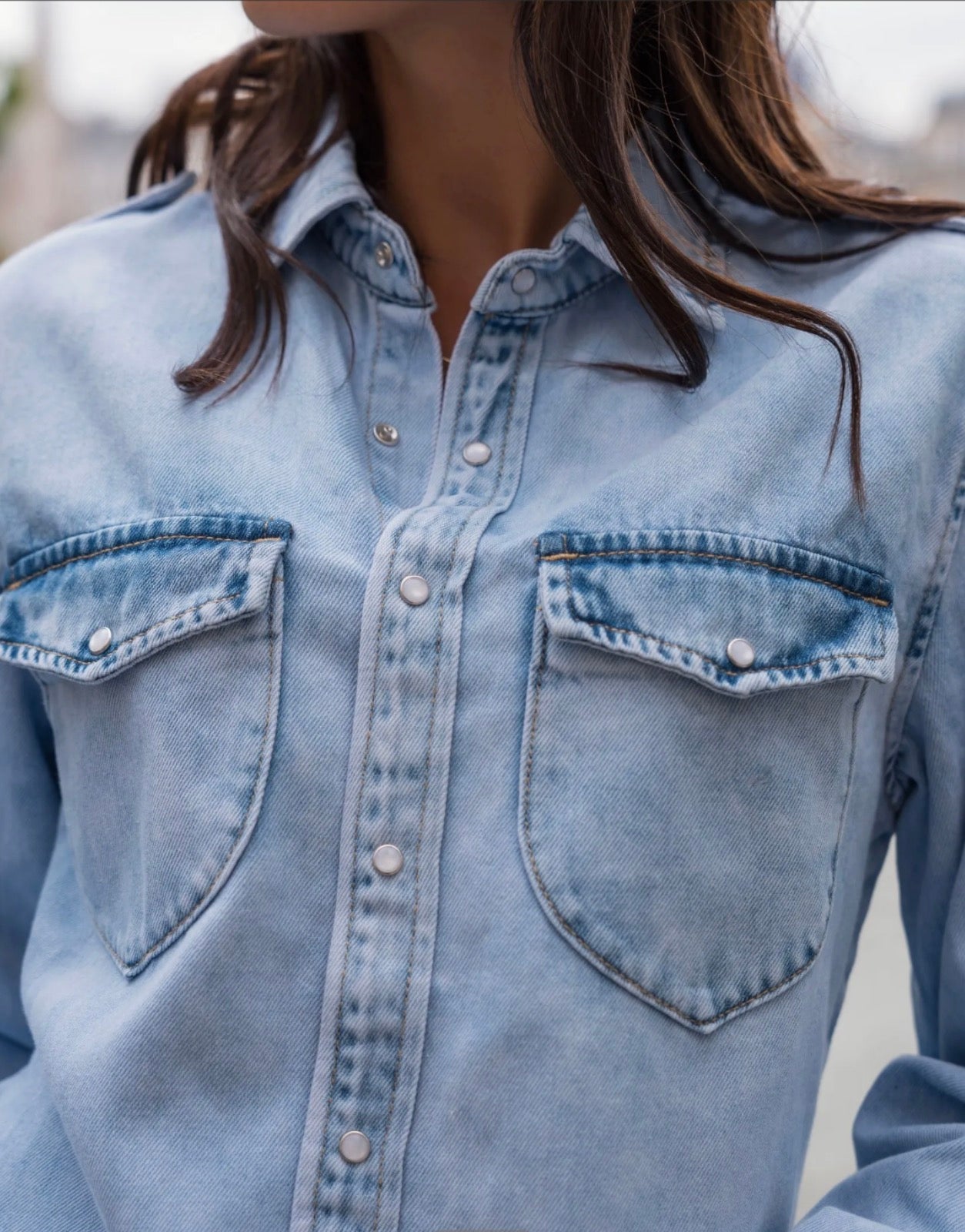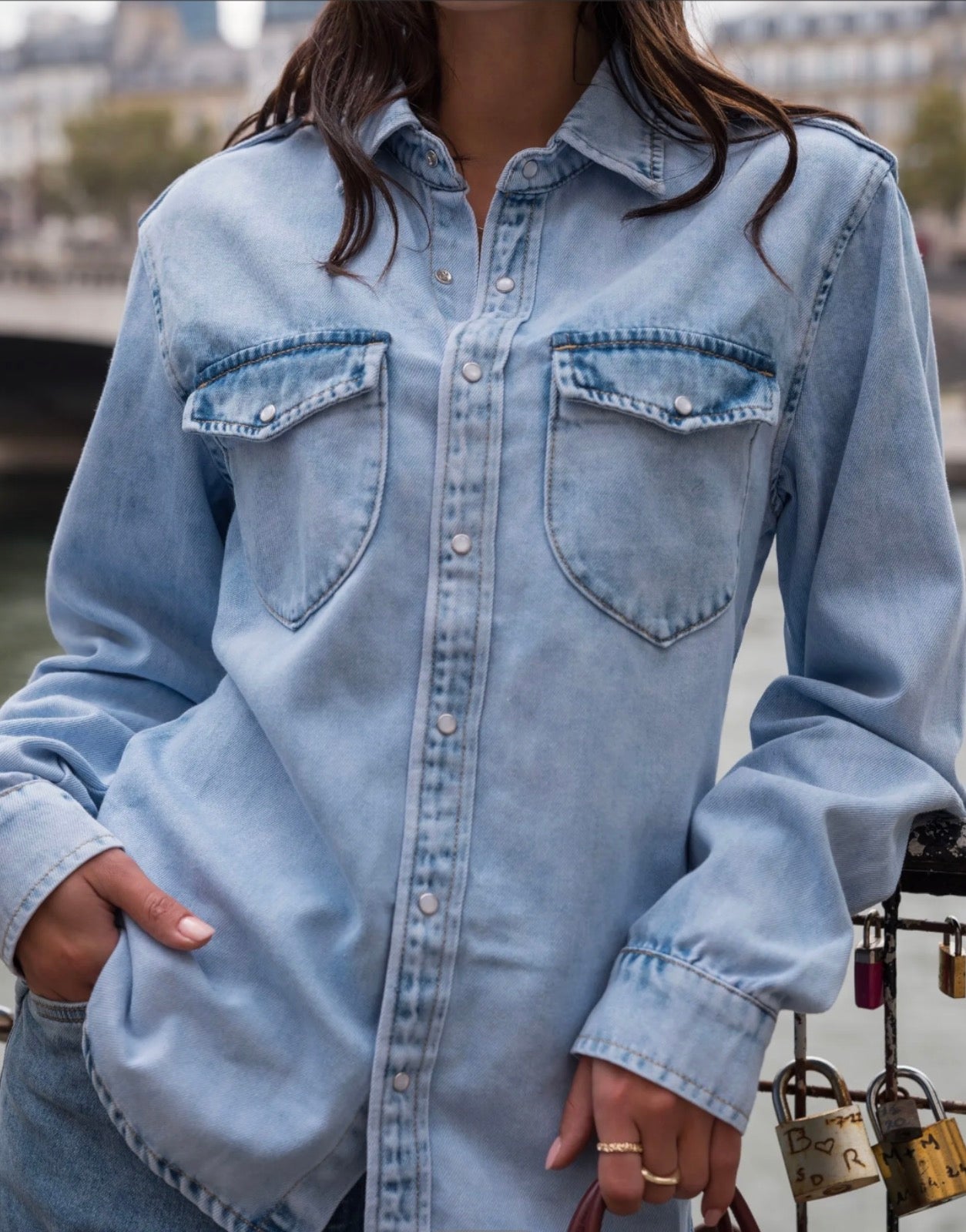 This light blue denim shirt is a staple revisited in a chic western style. Its soft fabric, straight cut, and signature details make it a trendy and easy-to-wear piece, whatever the season.