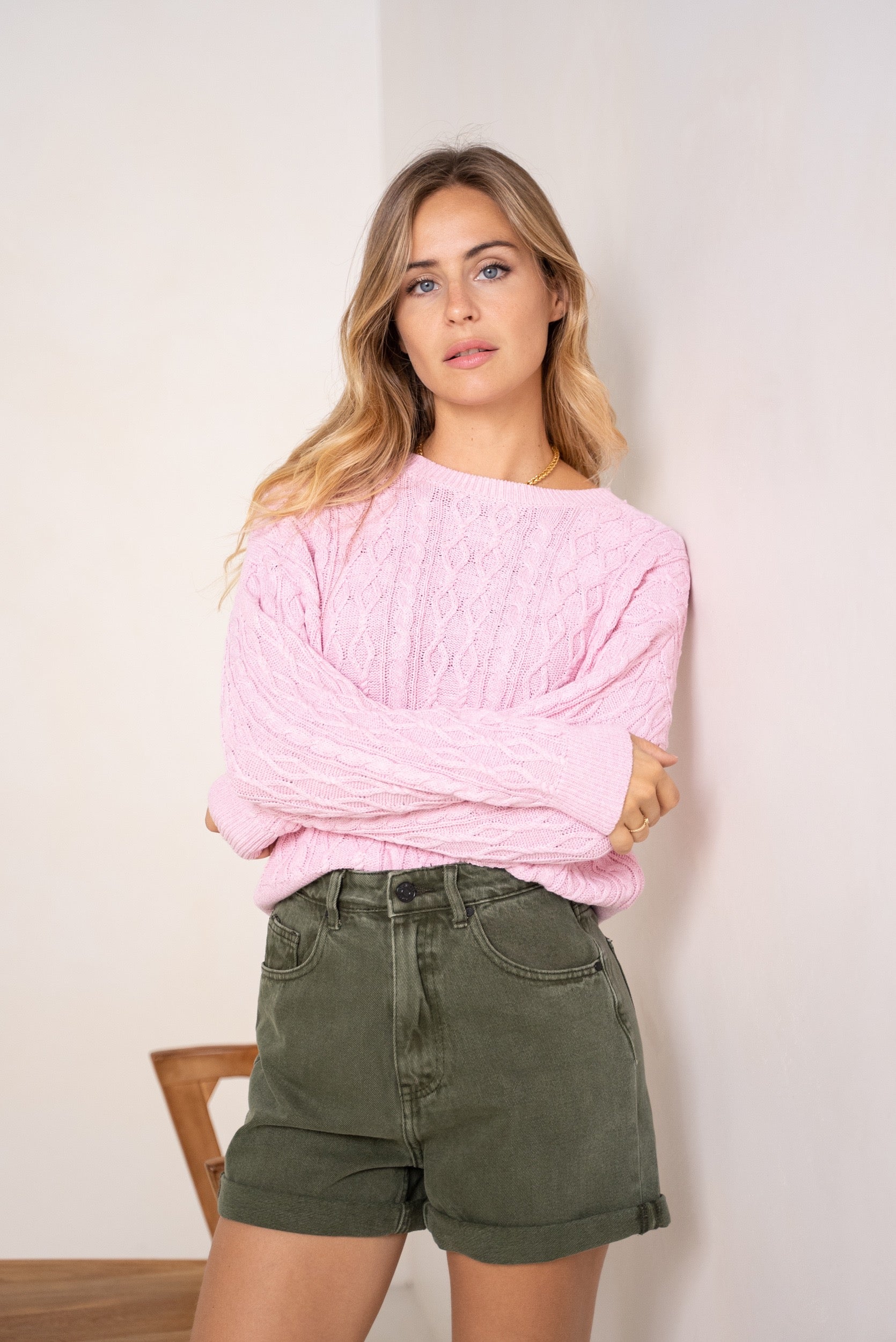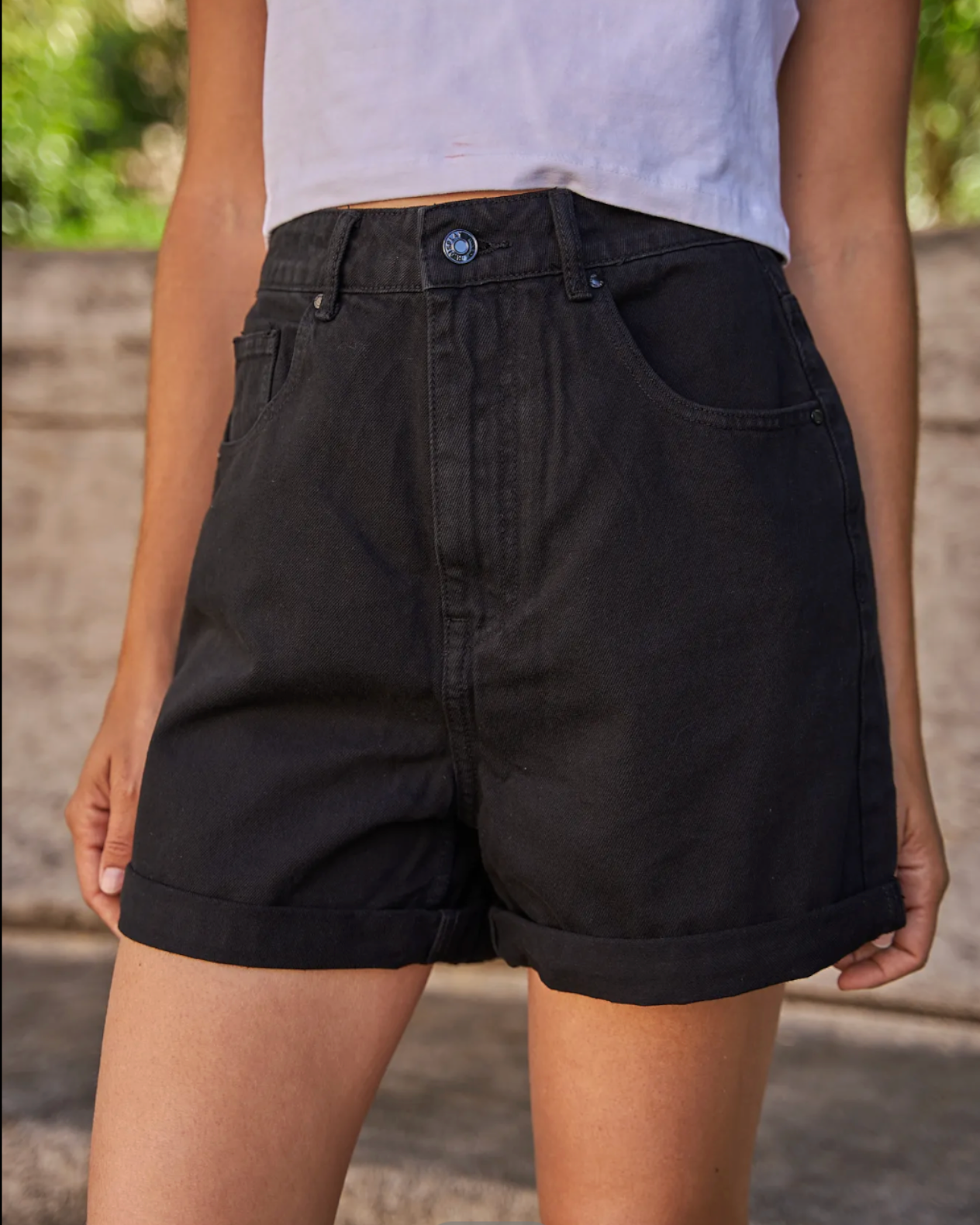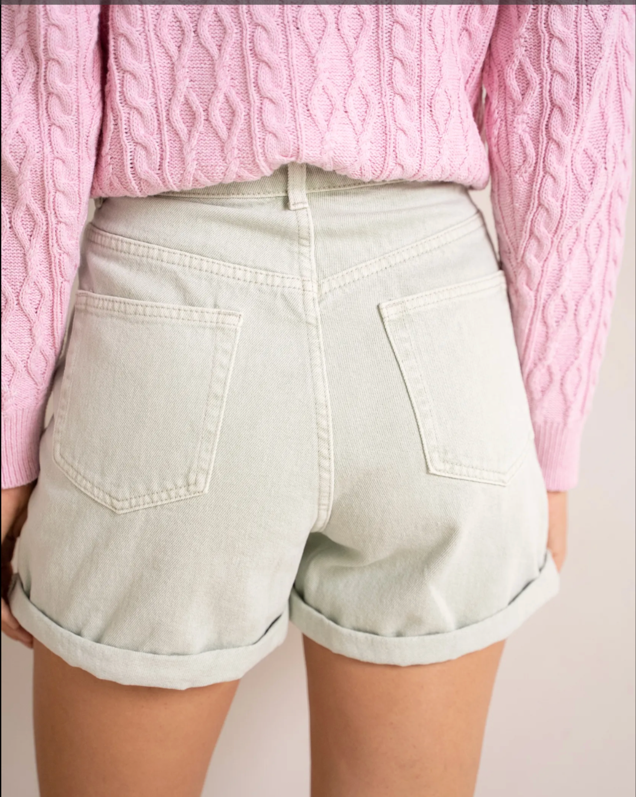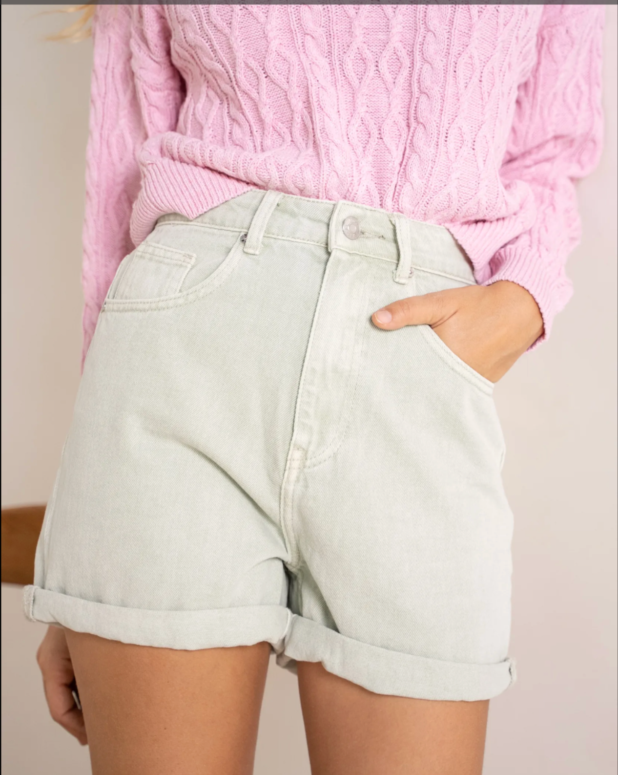 Rolled-up straight-leg denim shorts, perfect for a casual yet elegant look. Ideal for sunny days or summer walks.