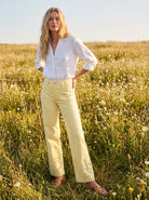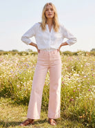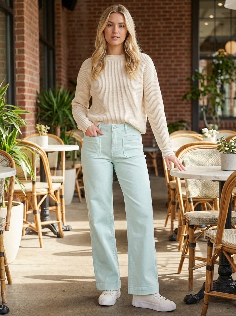 Slim-fit jeans with a fresh, natural style, perfect for sunny days. They combine comfort, elegance, and practicality for a polished everyday look.