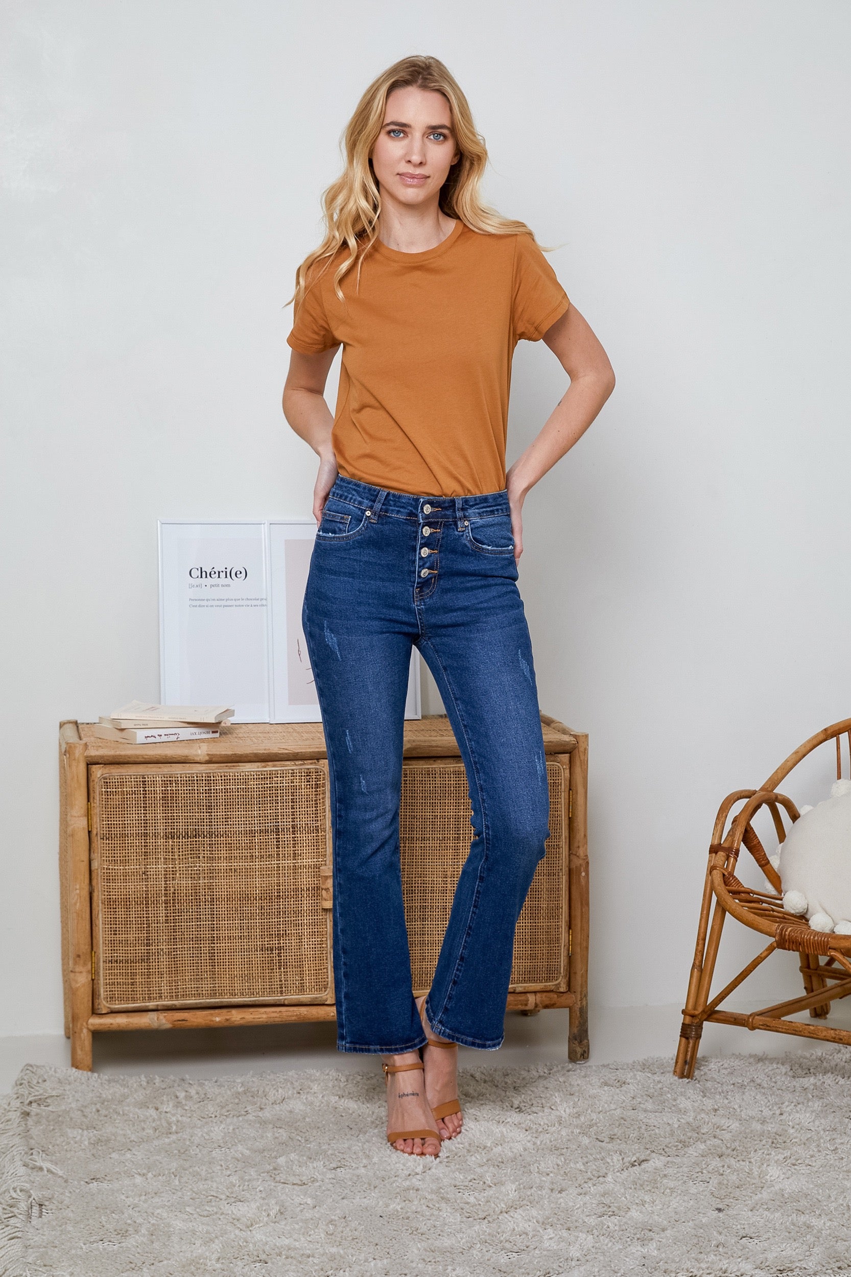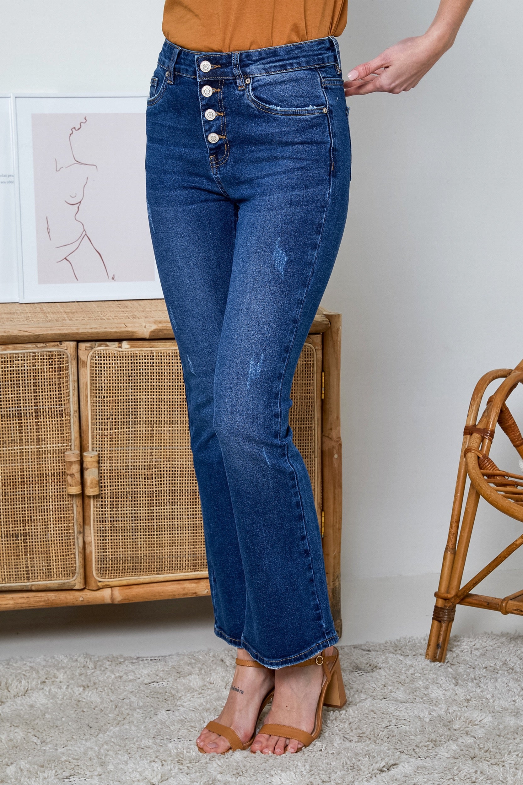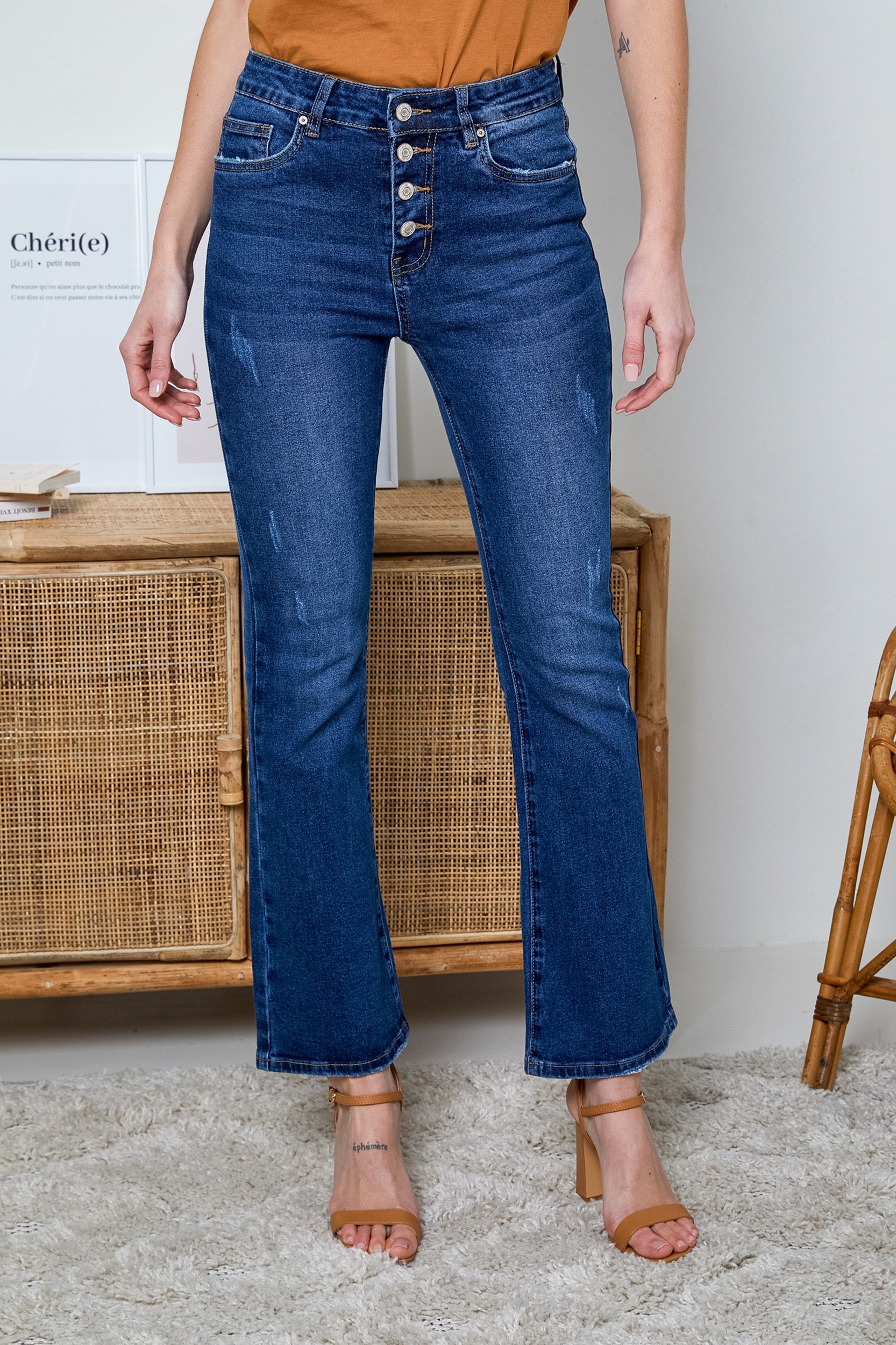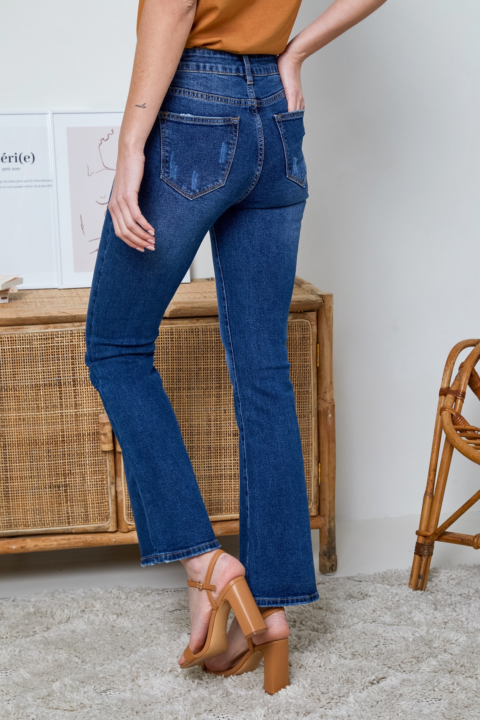 Dark blue denim flare jeans for a sleek, feminine silhouette. Their flared cut from the knee creates a lovely movement and elongates the leg, ideal for a stylish and on-trend look.