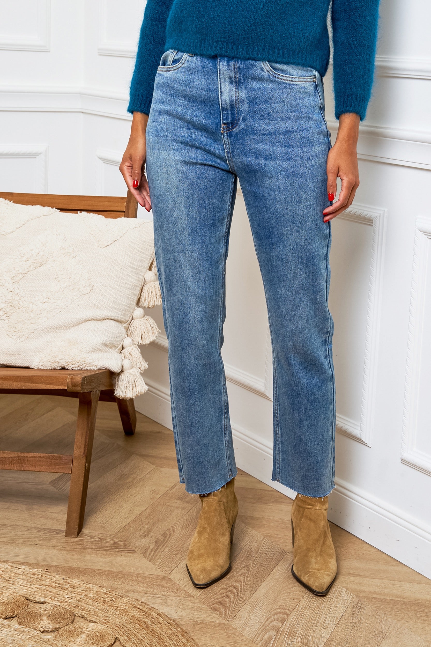 • Hem: Ankle length with raw, tapered finish
