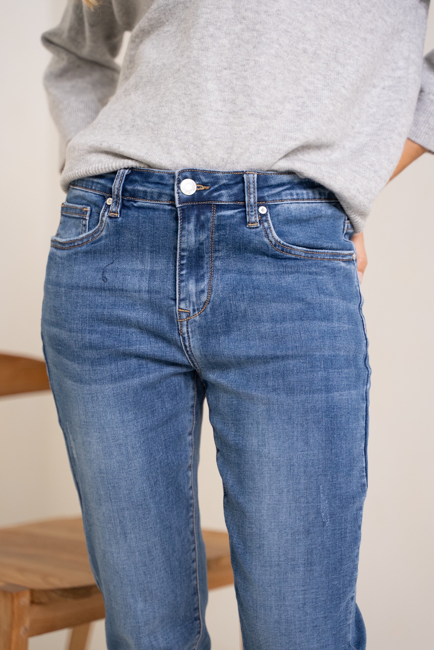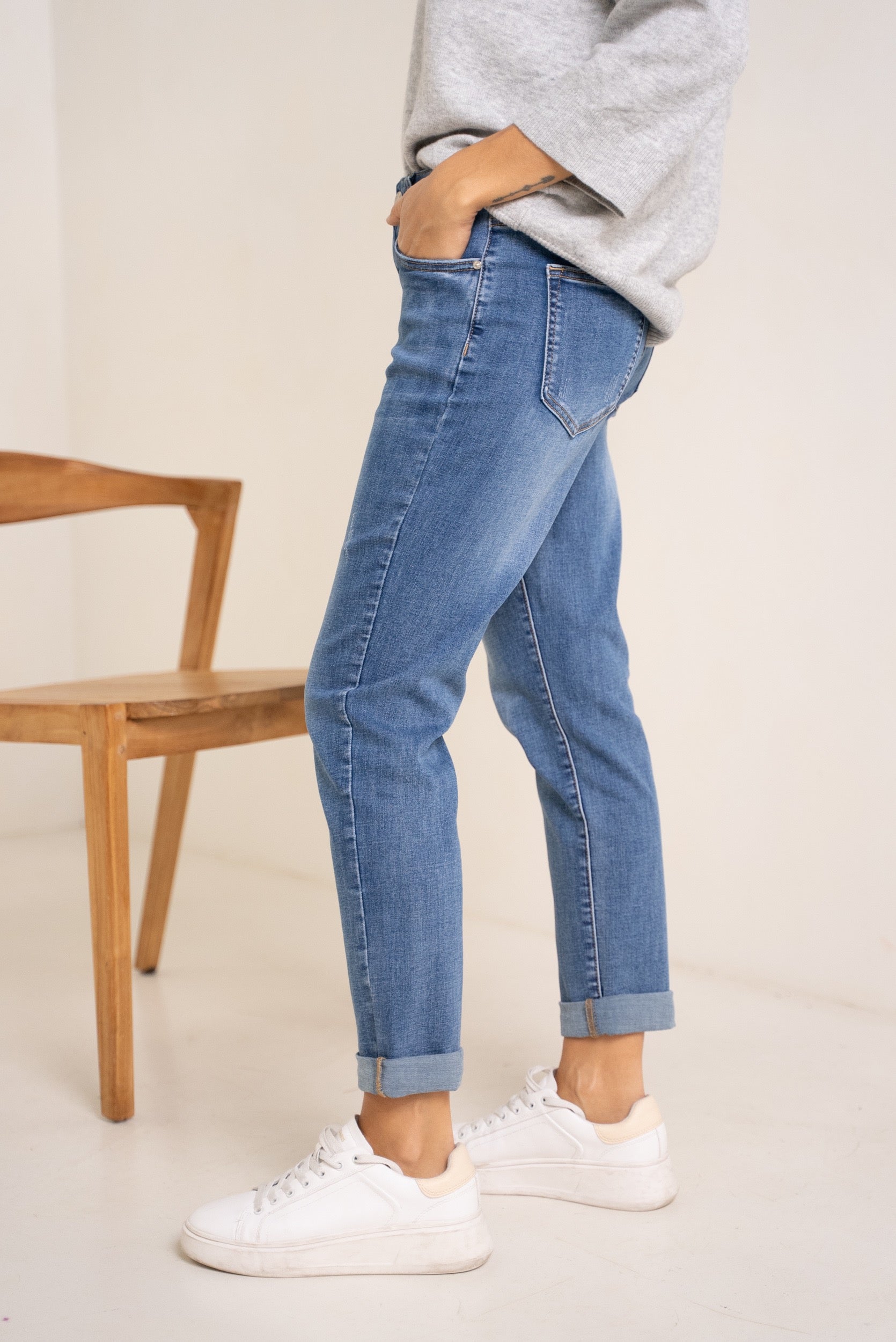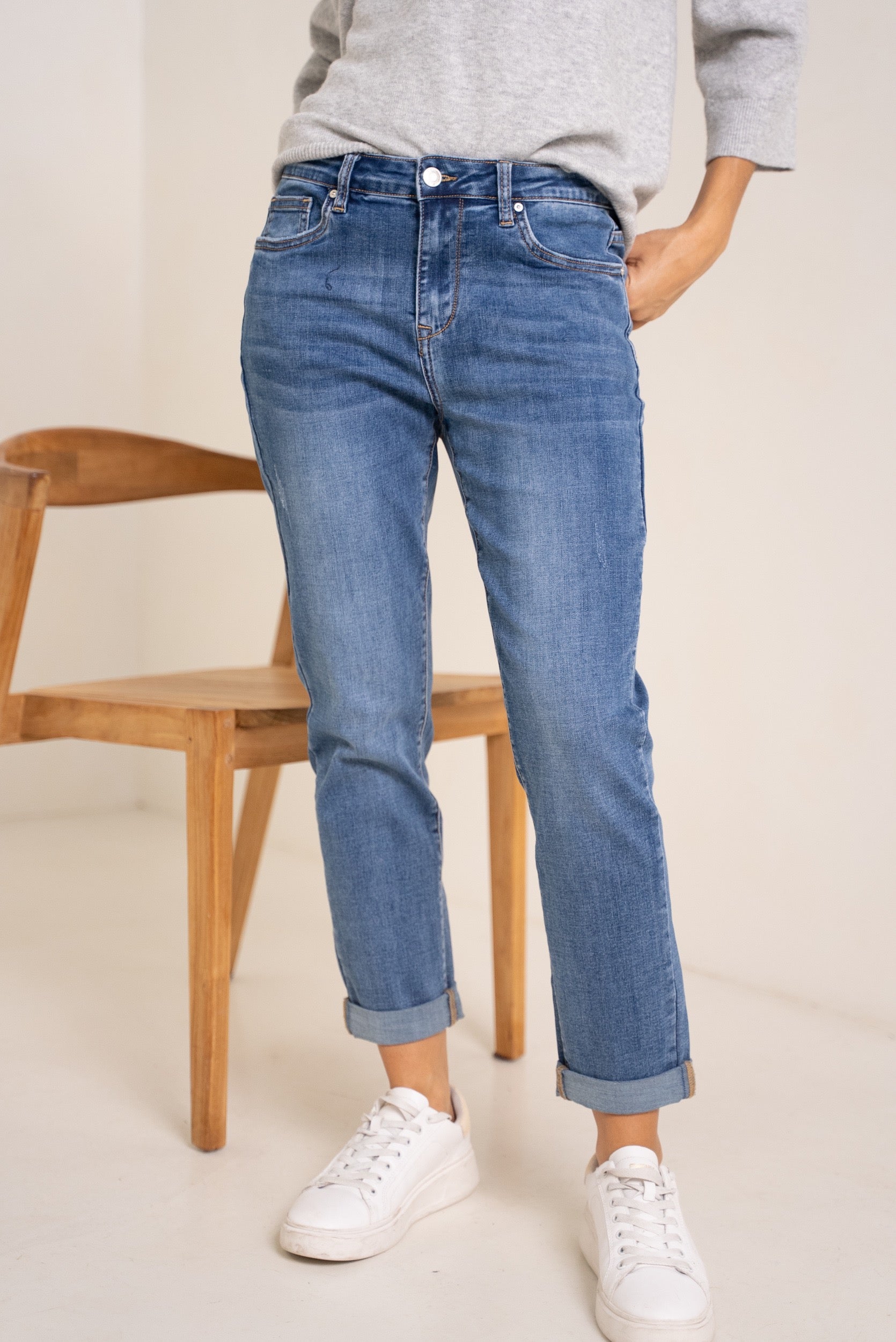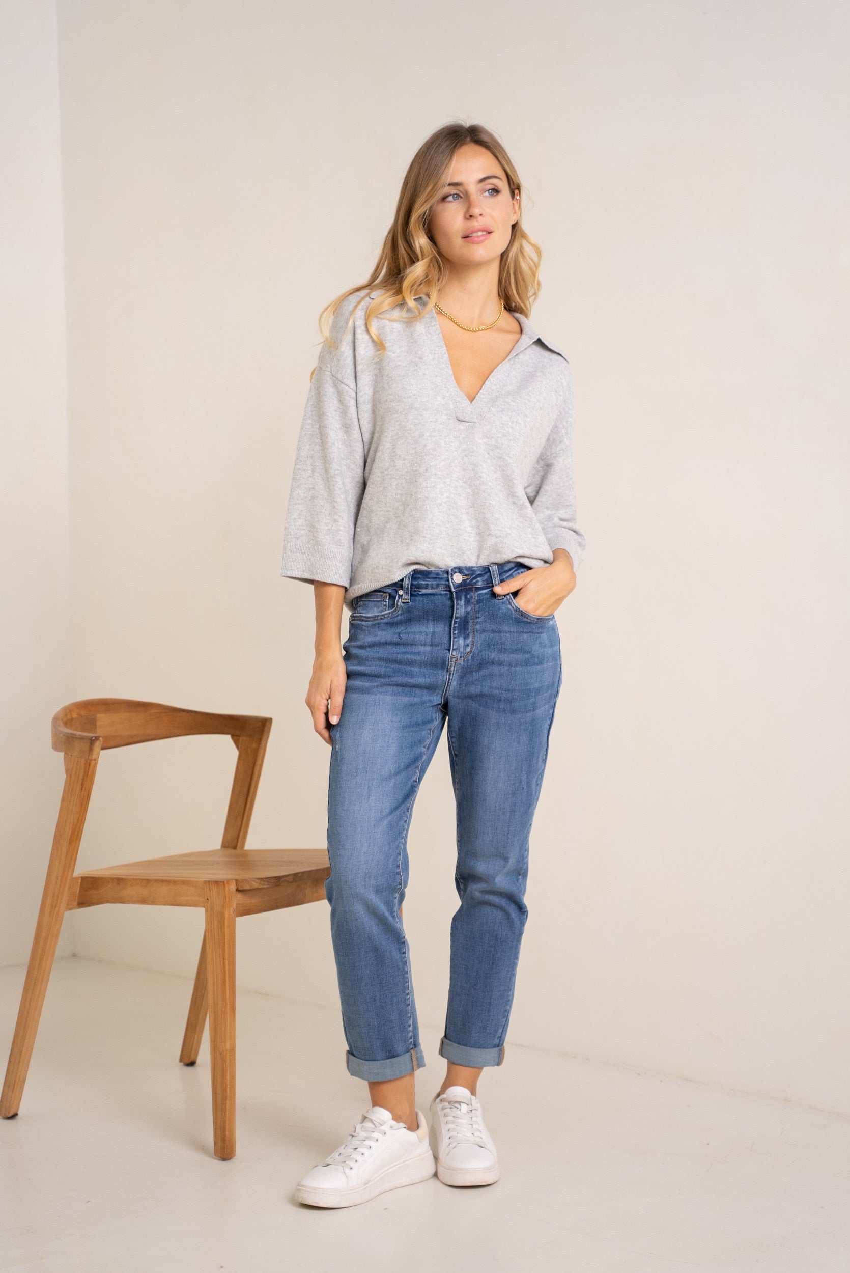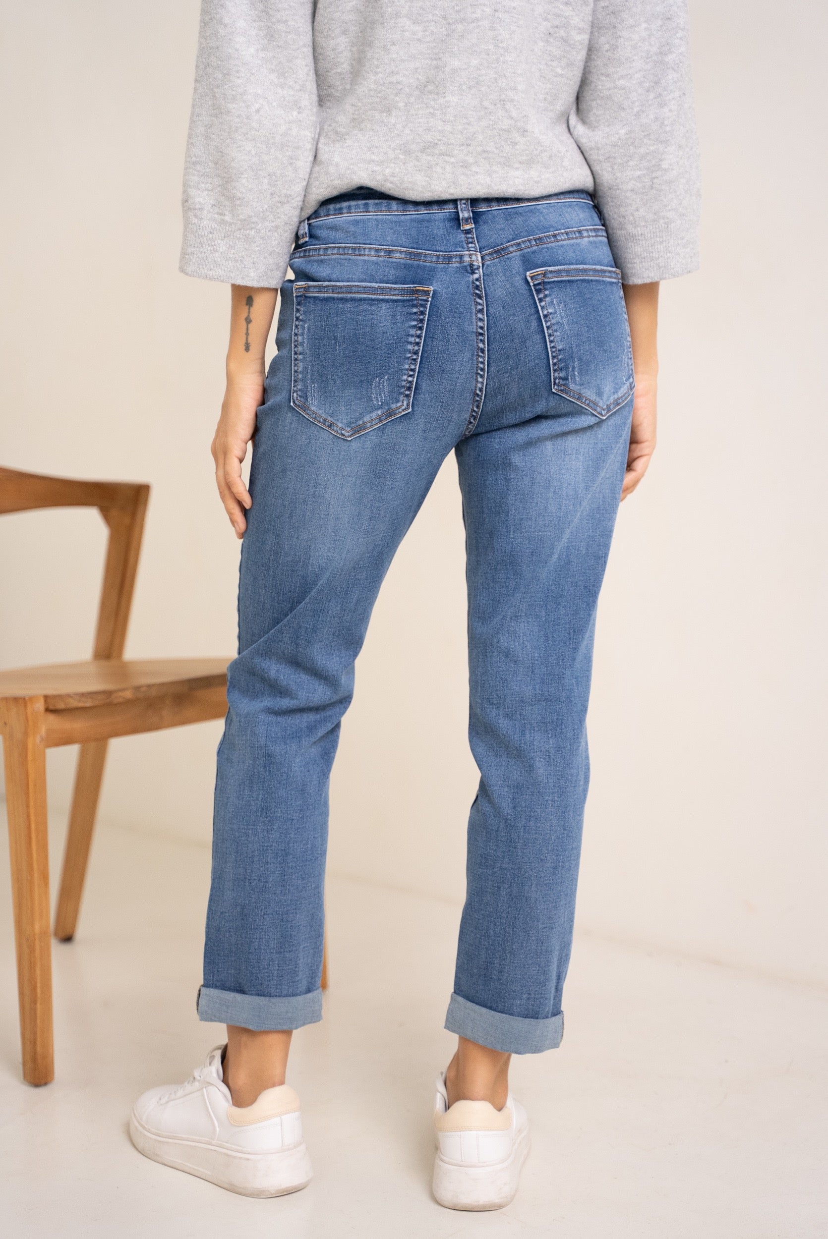 These jeans have a slightly loose, straight cut, perfect for a casual, laid-back look. Their slightly faded effect and stitched cuffs give them a trendy vintage touch.
