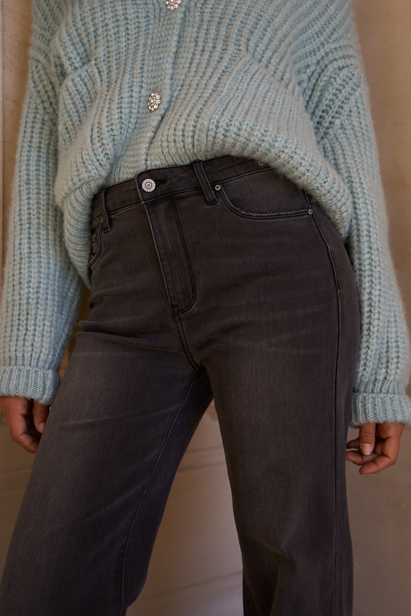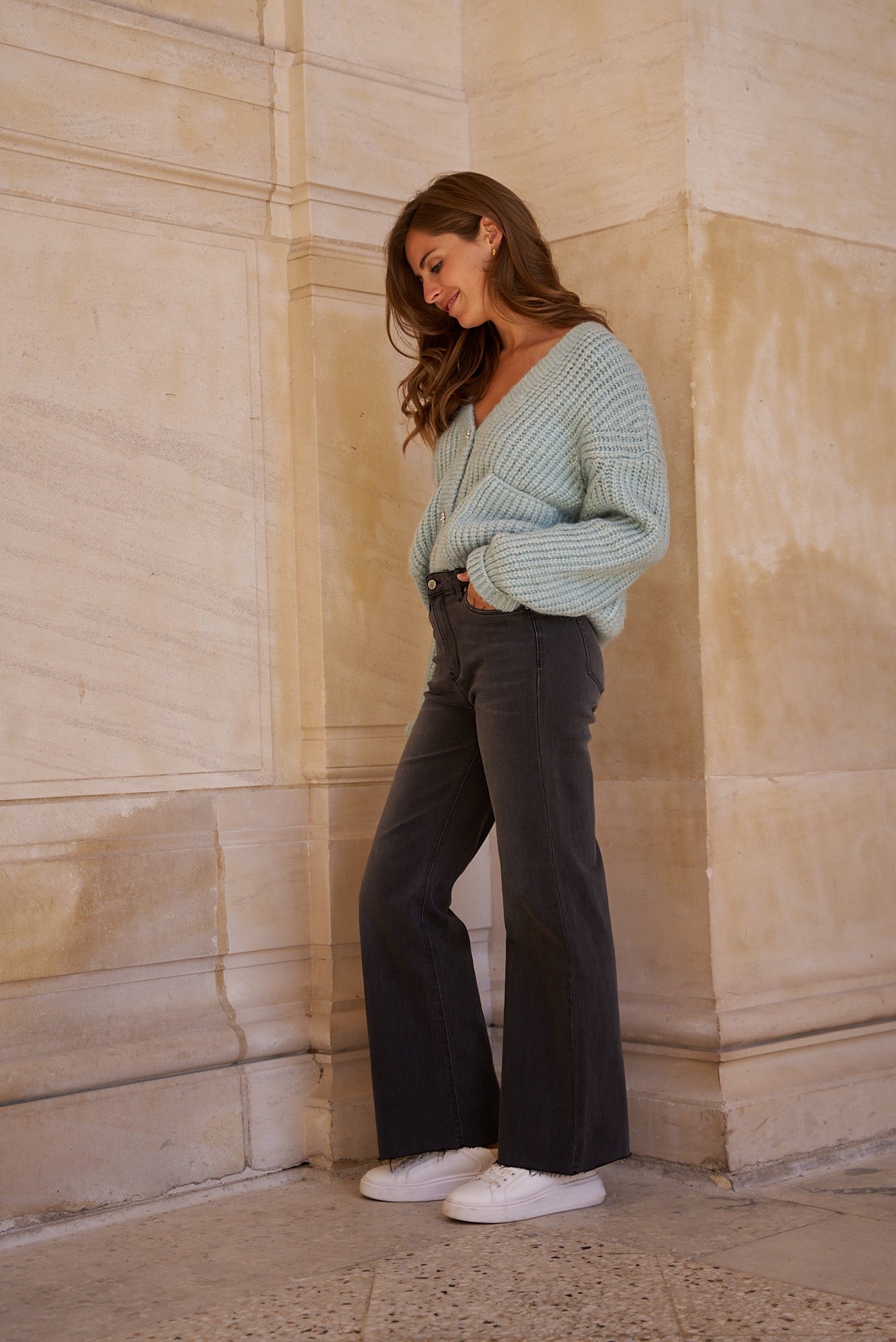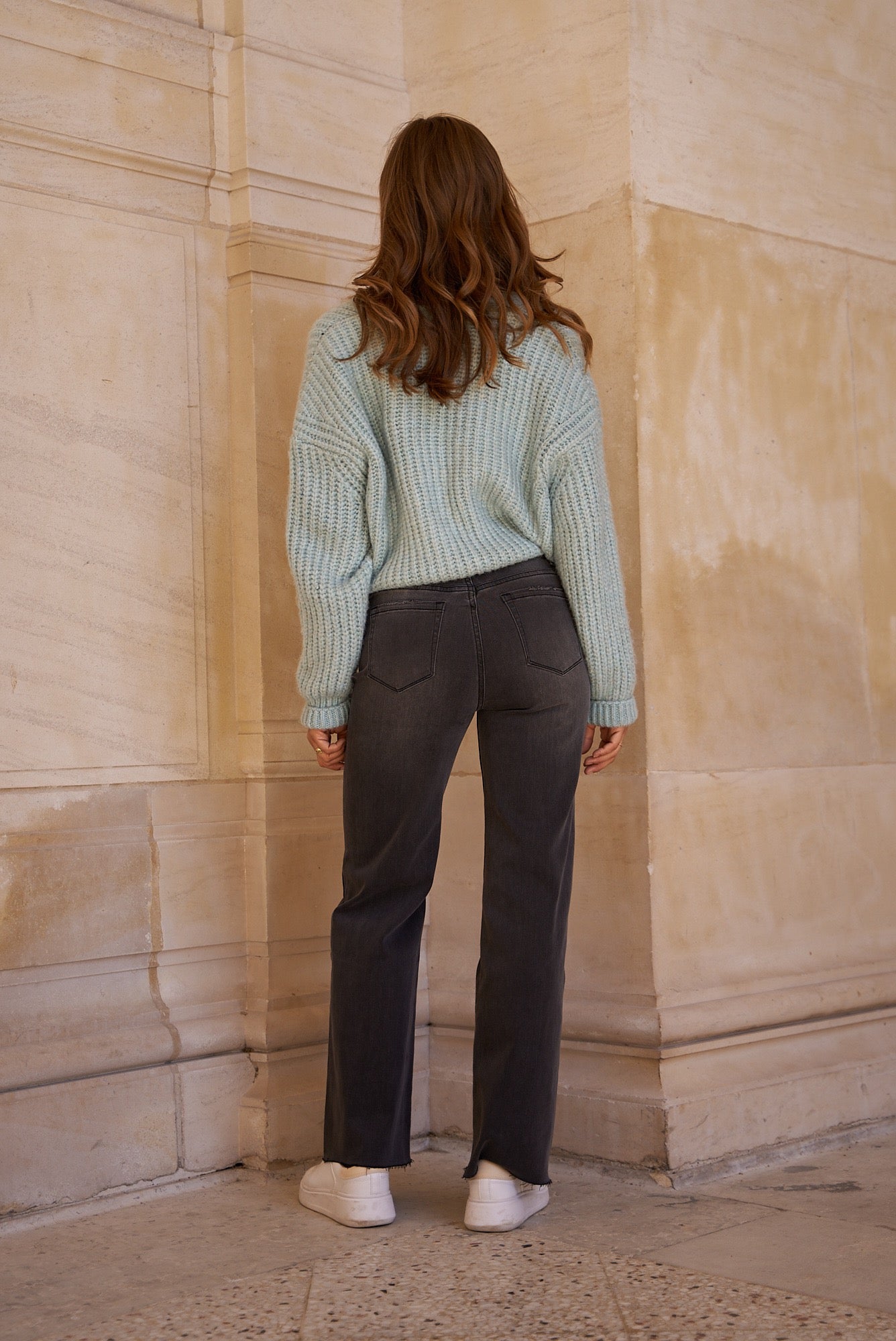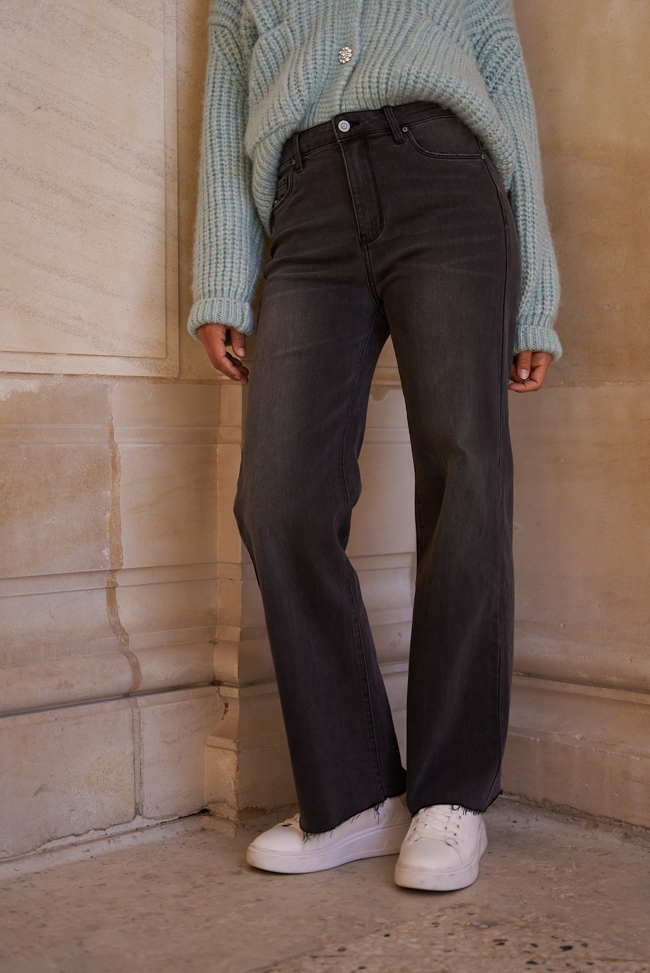 Wide-leg jeans in dark gray denim for a casual yet modern look. Their long, flared cut adds structure to the silhouette while offering a fluid, elegant fit.