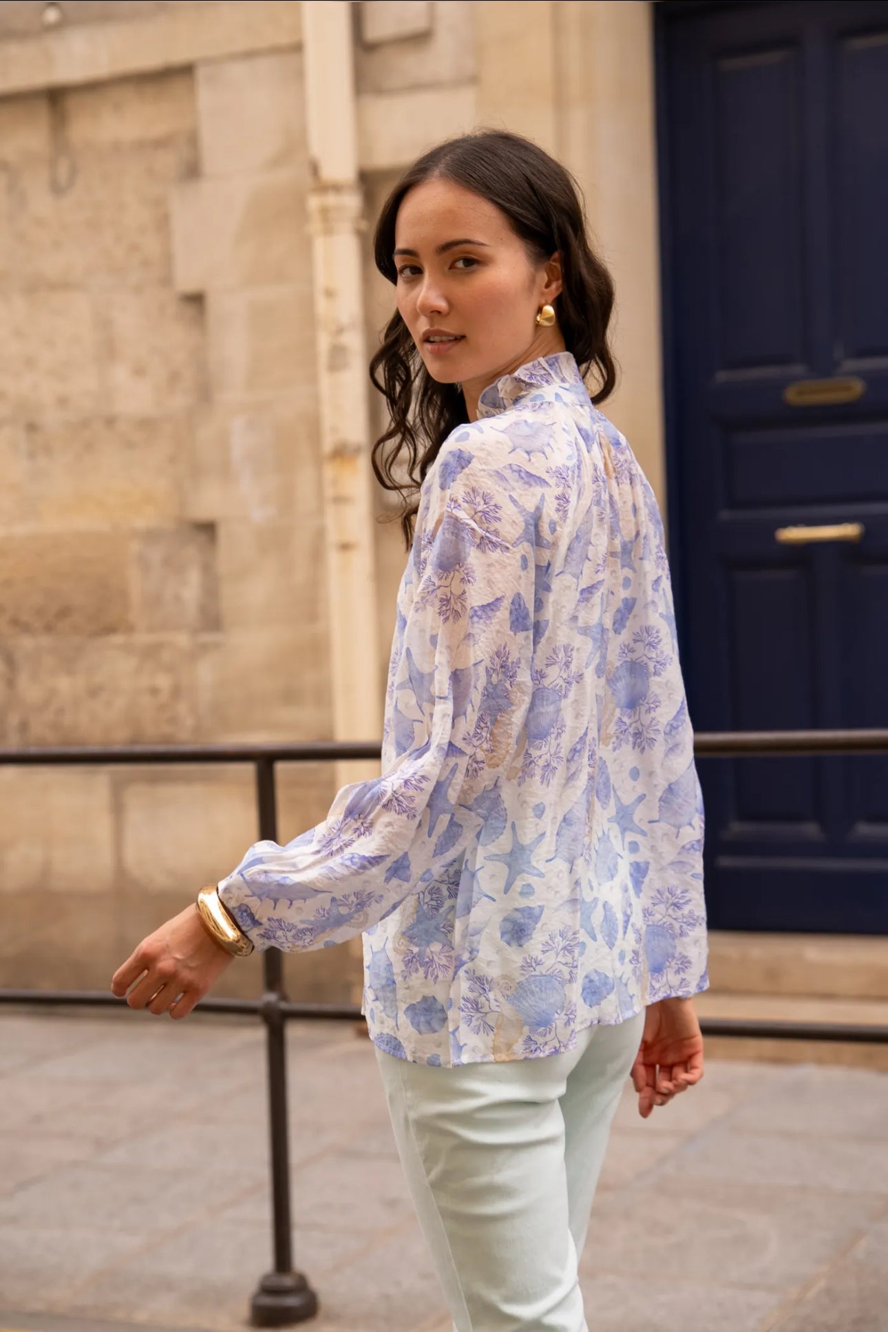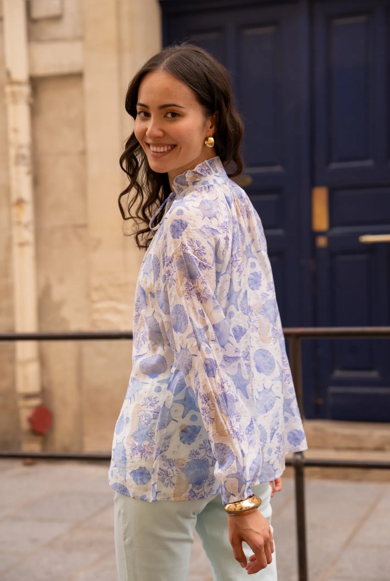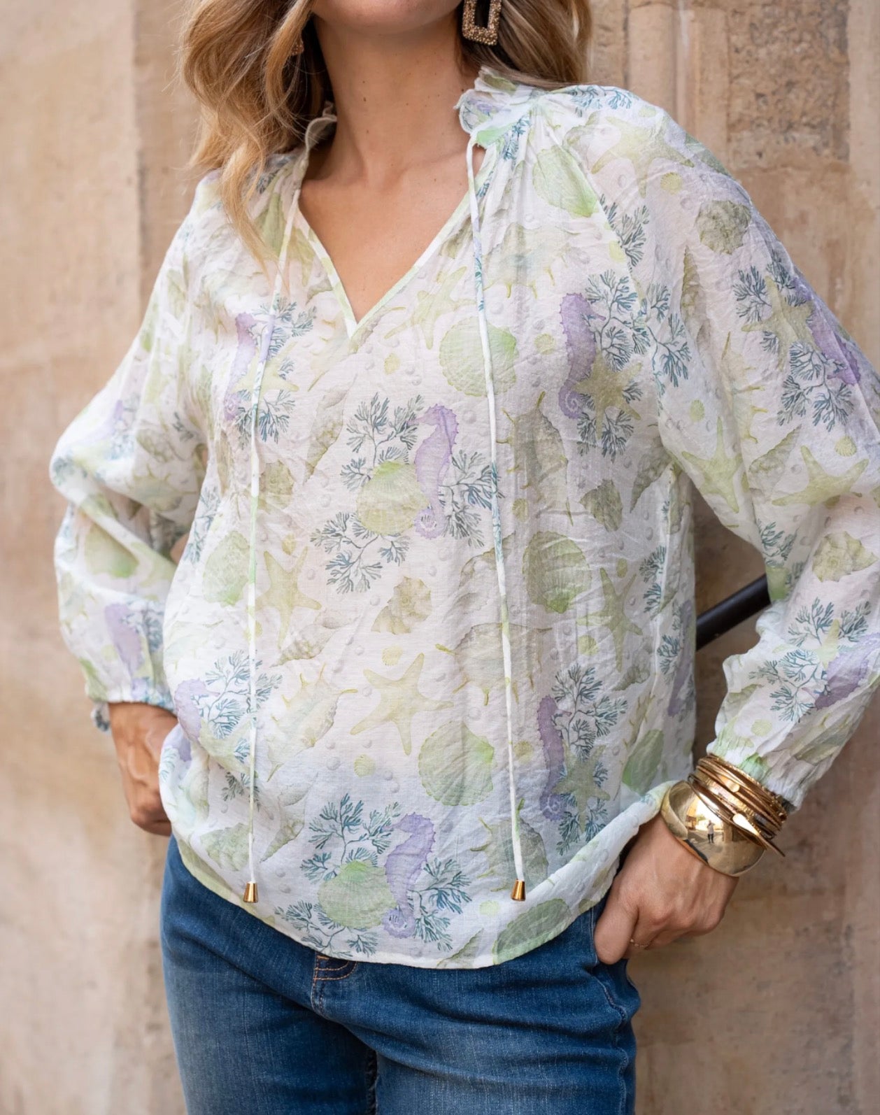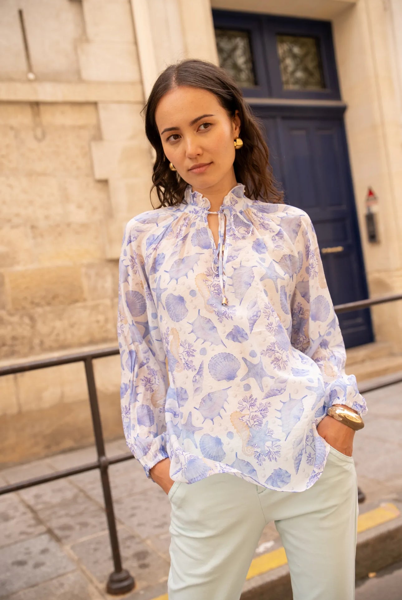 Lightweight blouse with a pastel nautical print, ideal for a fresh and romantic look during the summer. Its flowing cut and feminine details make it both comfortable and elegant.