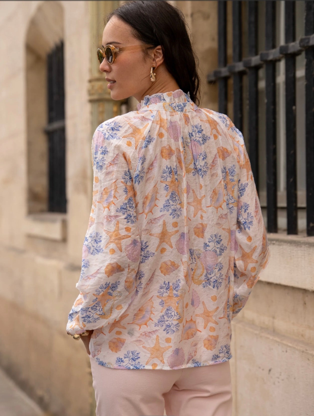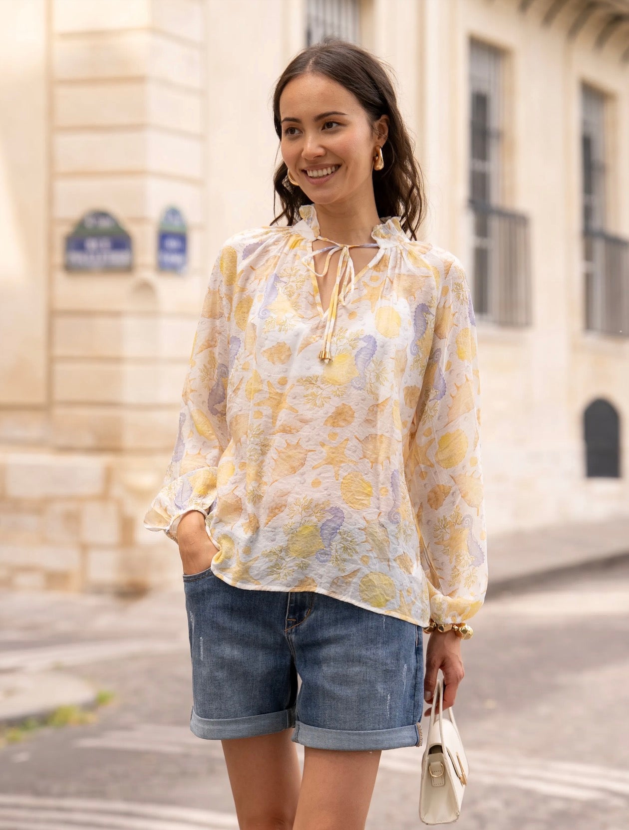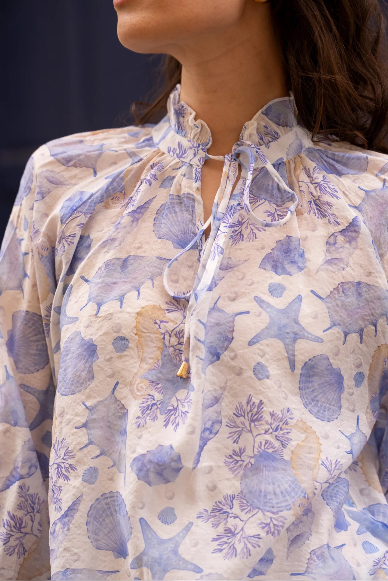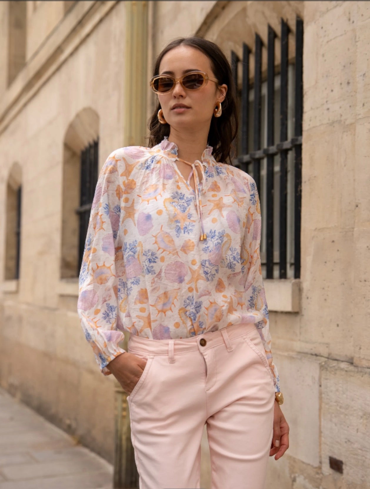 Lightweight blouse with a pastel nautical print, ideal for a fresh and romantic look during the summer. Its flowing cut and feminine details make it both comfortable and elegant.
