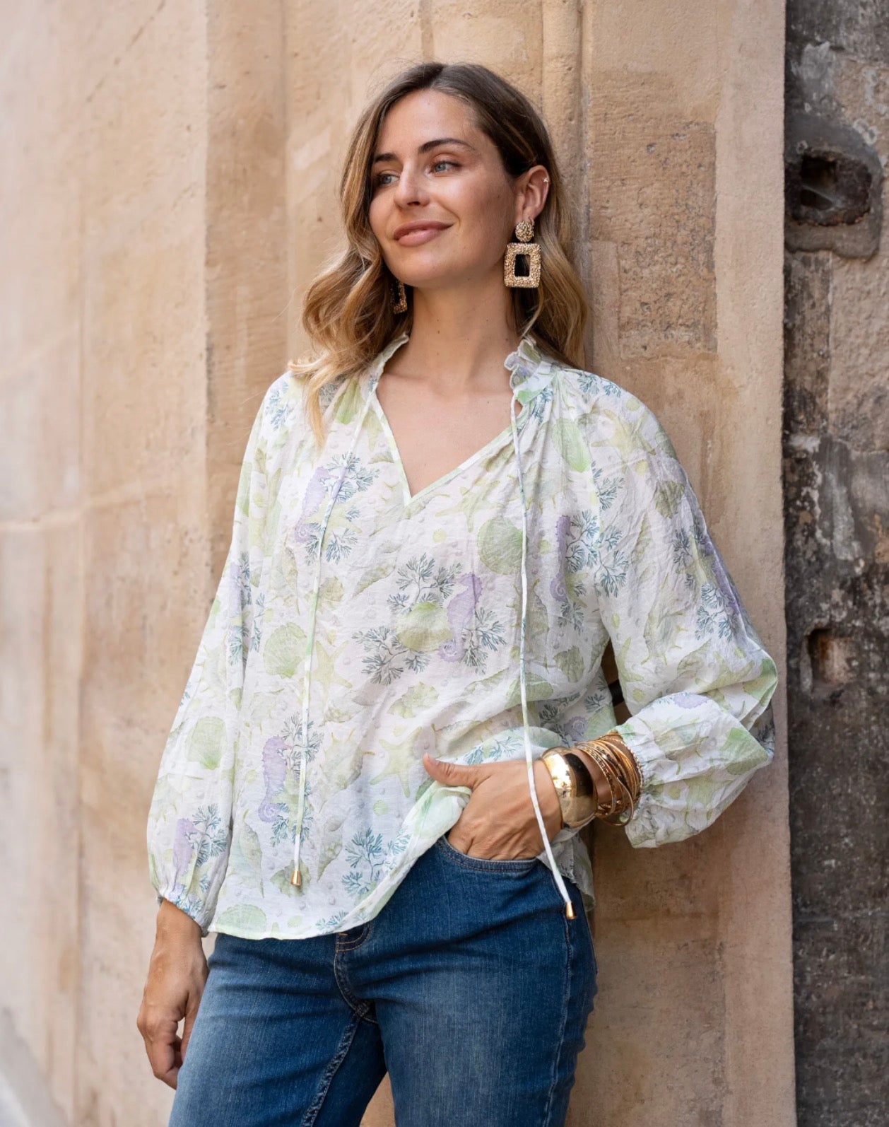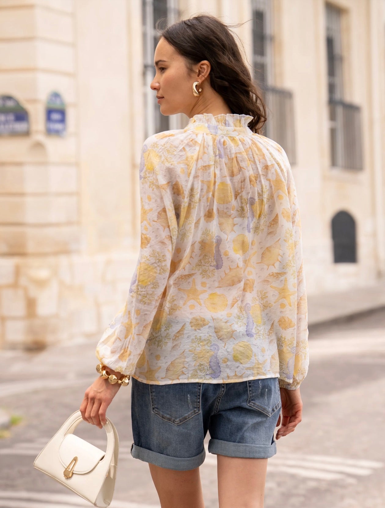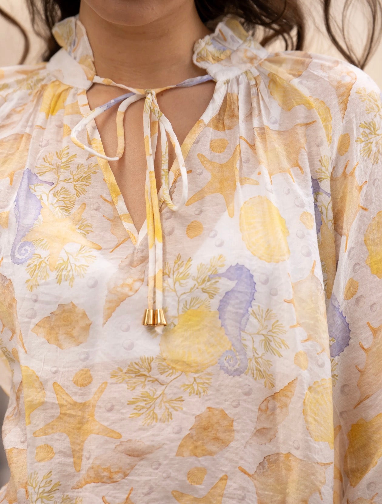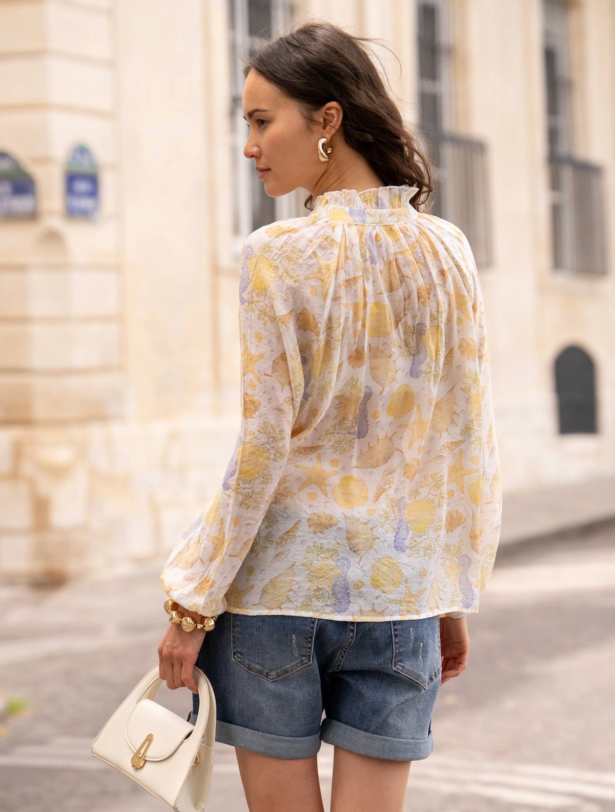 Lightweight blouse with a pastel nautical print, ideal for a fresh and romantic look during the summer. Its flowing cut and feminine details make it both comfortable and elegant.