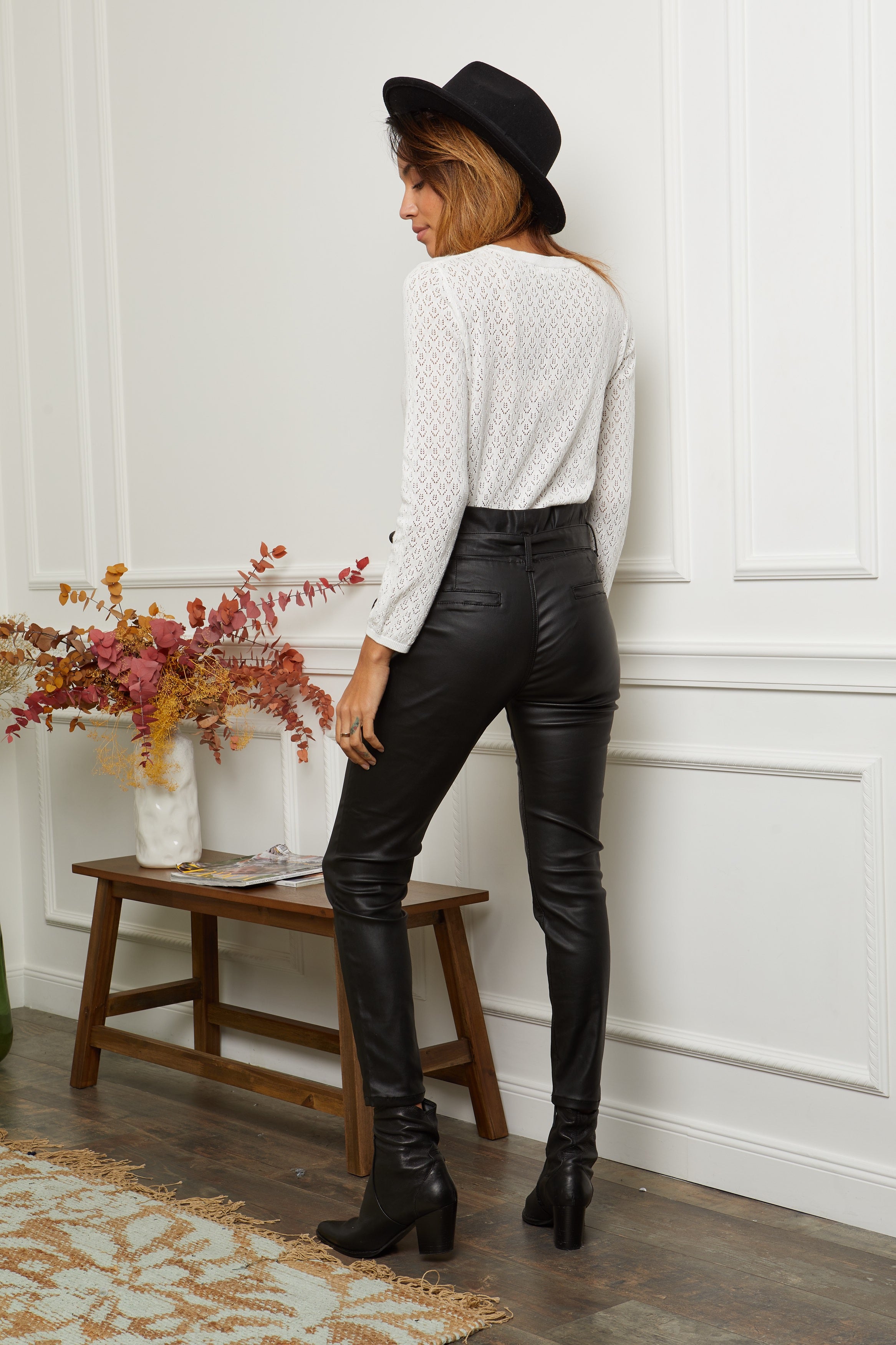 Black coated paperbag pants combine modern style with optimal comfort. Their gathered waist and slim fit create an elegant silhouette, ideal for a chic and structured look.