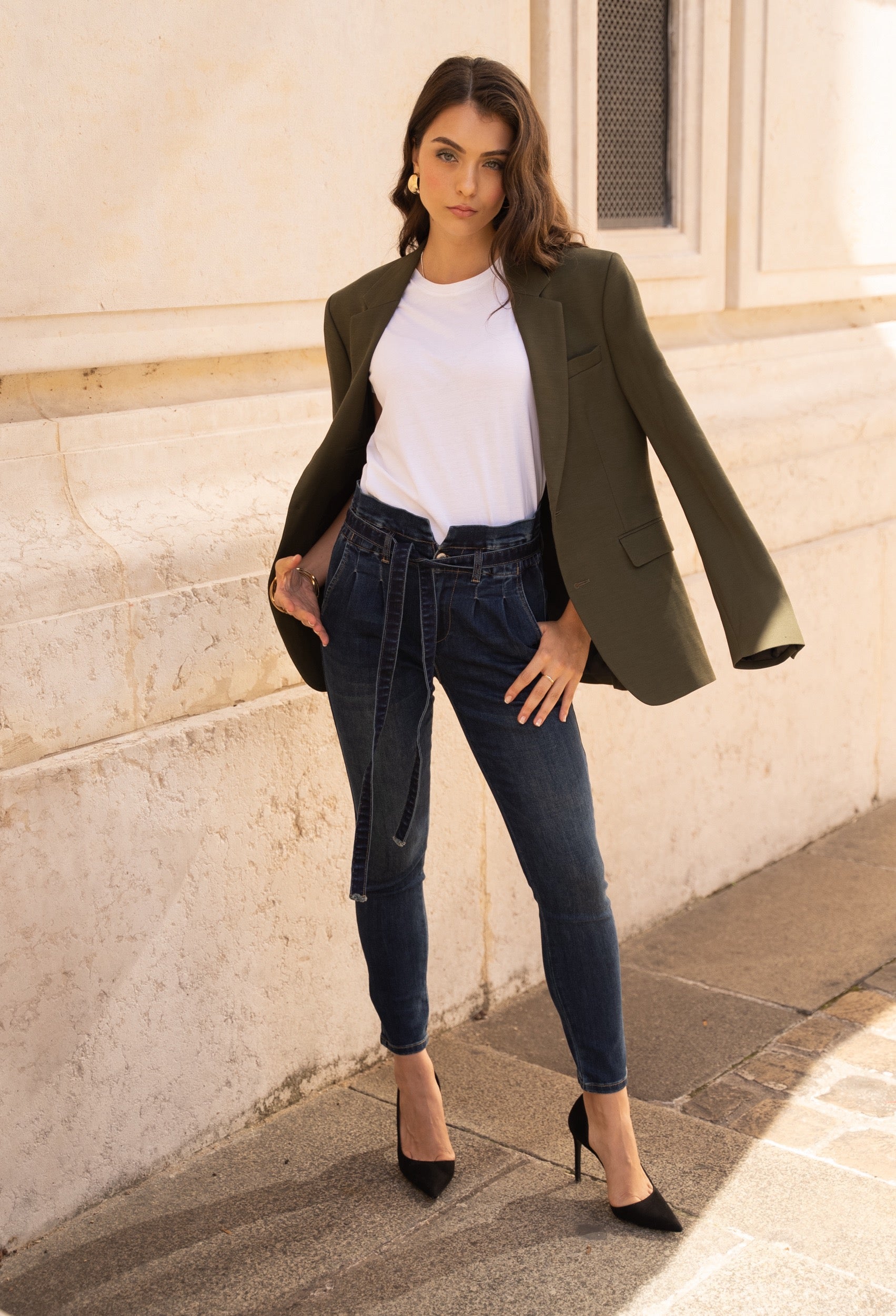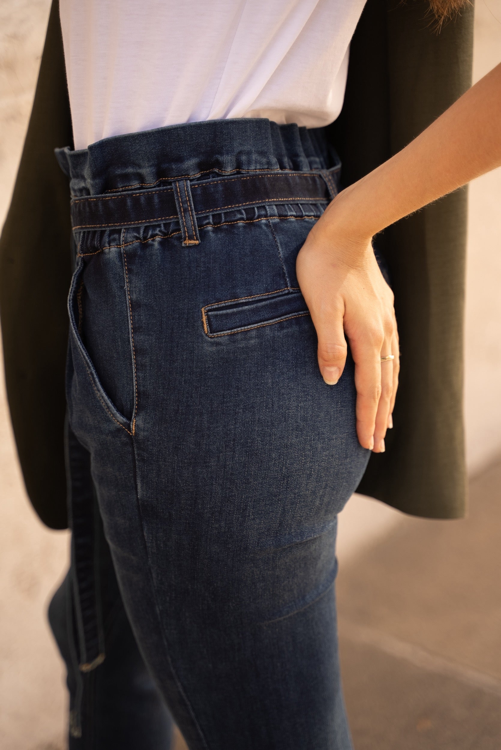 Style and fit : Paperbag, high-waisted gathered waist with a slightly tapered slim fit