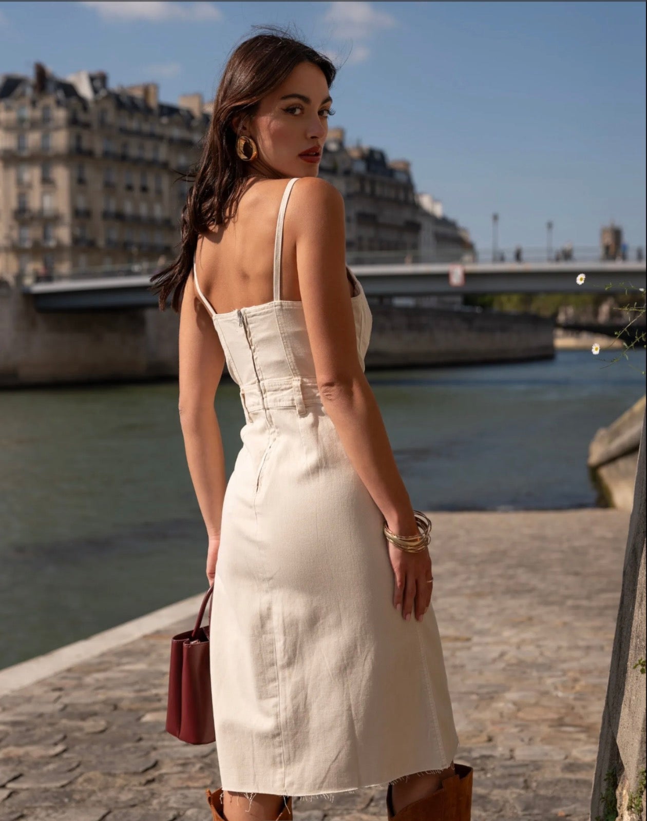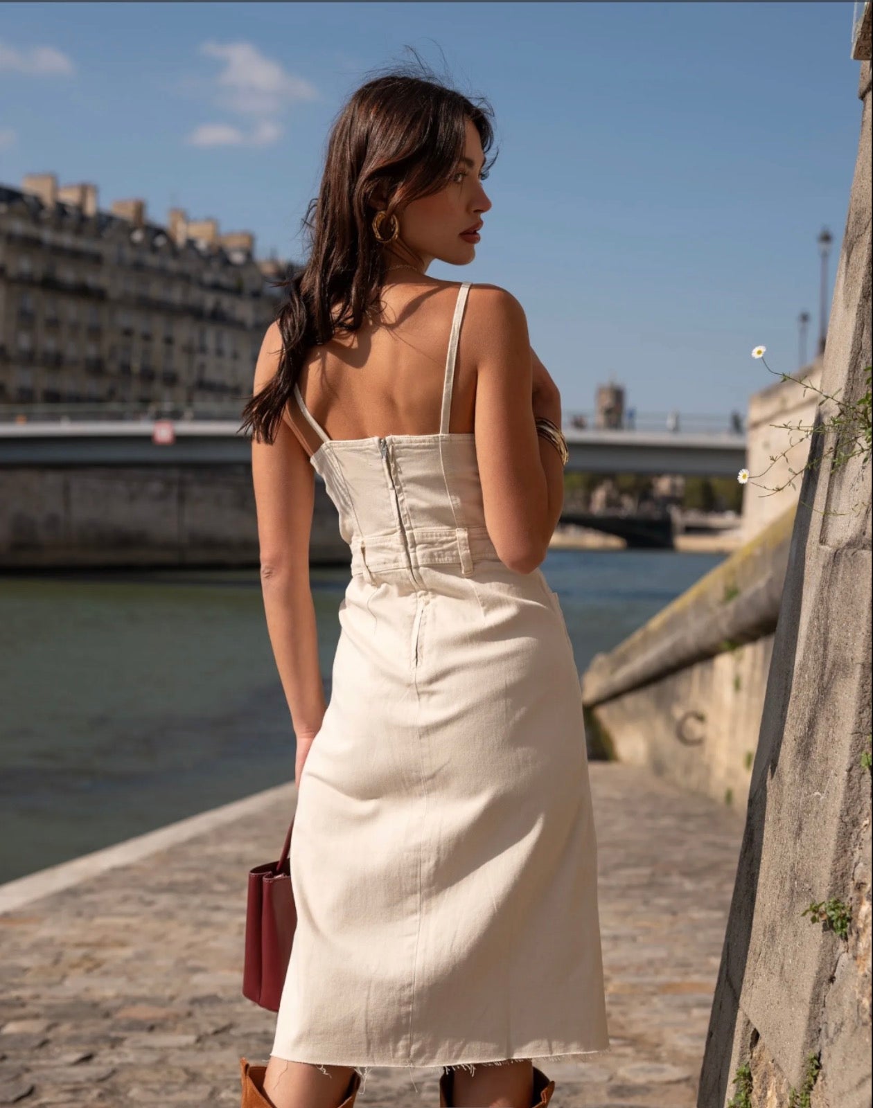 Structured denim midi dress with a sleek, modern style inspired by the corset cut. It flatters your figure with its fitted shape and neat finishes, perfect for a chic yet casual look.
