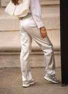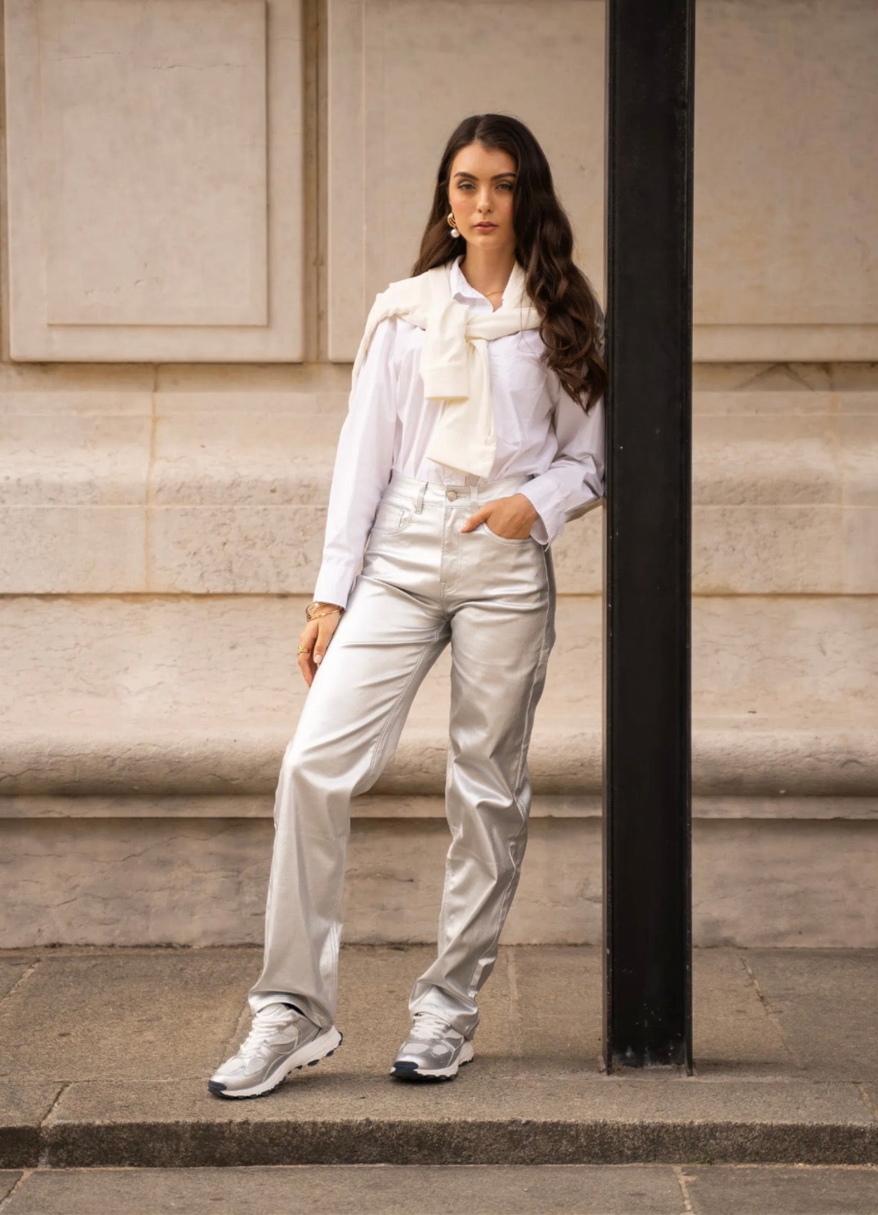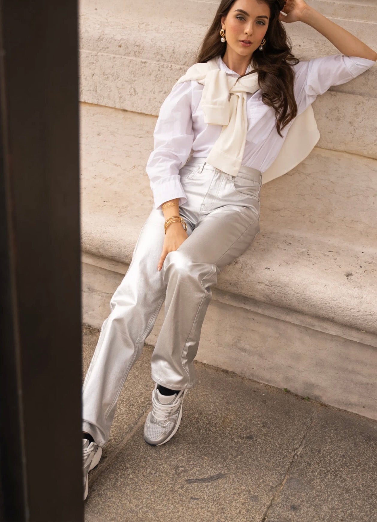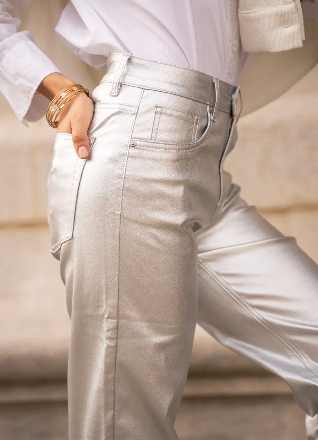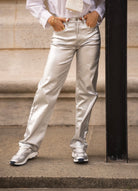 These wide-leg trousers in a gold coated finish offer a bold and contemporary look, perfect for adding a touch of brightness to your outfits. Their metallic texture catches the light, creating a chic and assertive appearance. The high waist and wide leg elongate the silhouette while offering both comfort and style.