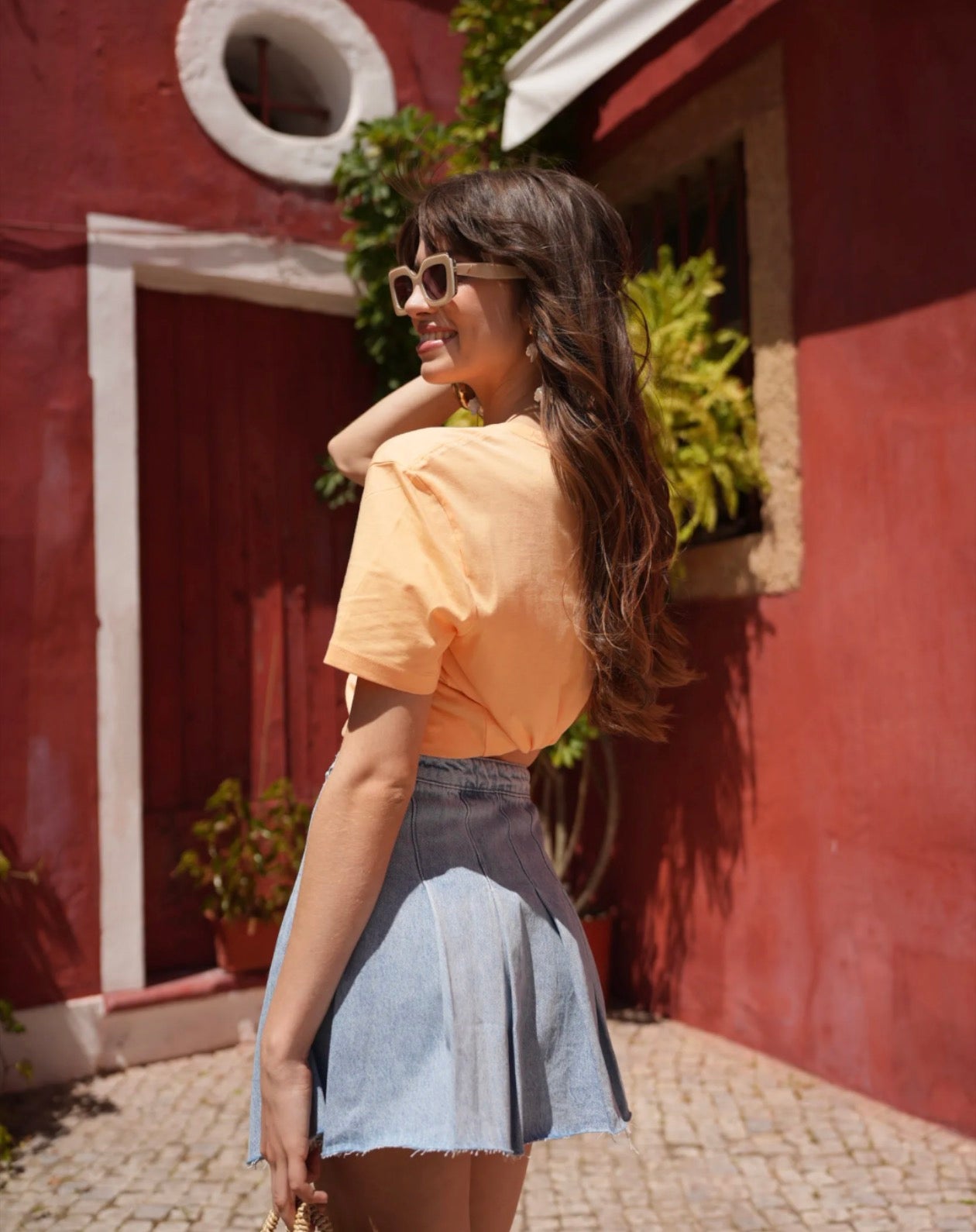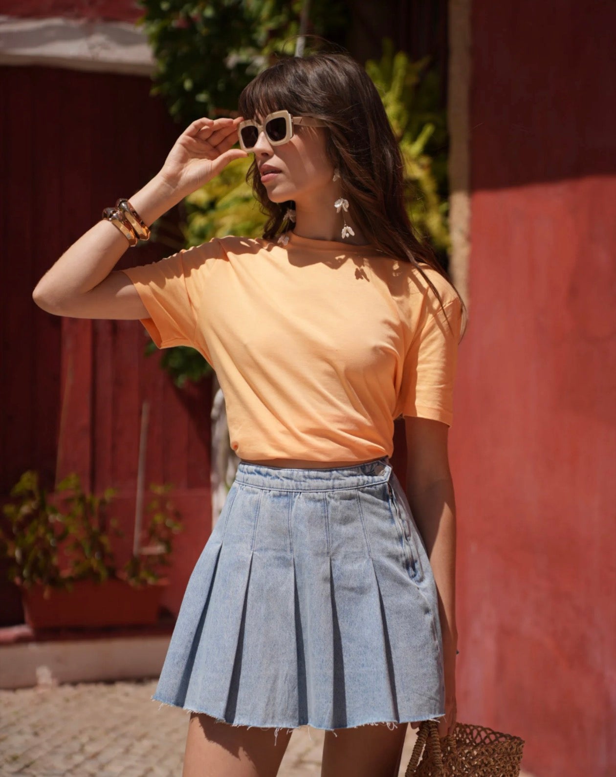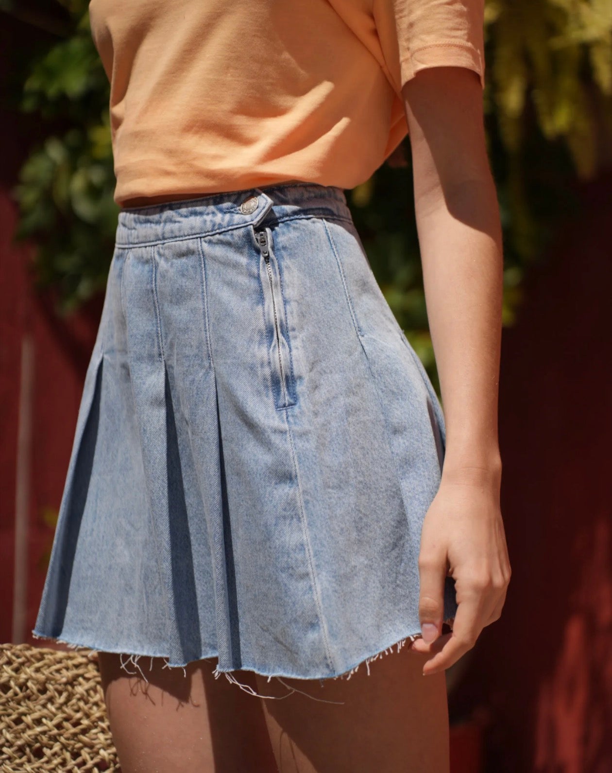 Short pleated denim skirt, perfect for a feminine and dynamic silhouette. Ideal for a casual, summery look, pair with a T-shirt, a light blouse, or a tank top.