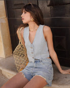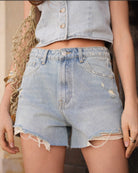 Denim shorts with a casual, summery look, perfect for warmer days. Their high-waisted, straight cut and distressed details give them a trendy, vintage look.