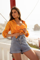 High-waisted denim shorts with a knotted belt are both practical and ultra-feminine. Perfect for a casual summer look with a chic touch thanks to their structured cut and light wash.